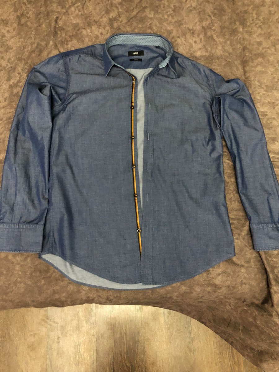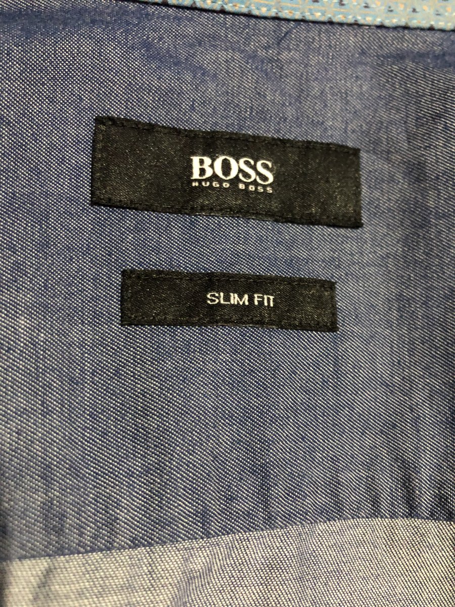 Очень красивая новая рубашка Hugo Boss, оригинал 48р., плечи 48, грудь 53, талия 48, рукав 65, длина по спине с воротником 78,цвет синий, 100% коттон, приталенная, маленький аккуратный воротник, мягкая на ощупь. Качество супер.Цены в магазине на такие рубашки под 2000 грн, моя цена 350 грн.