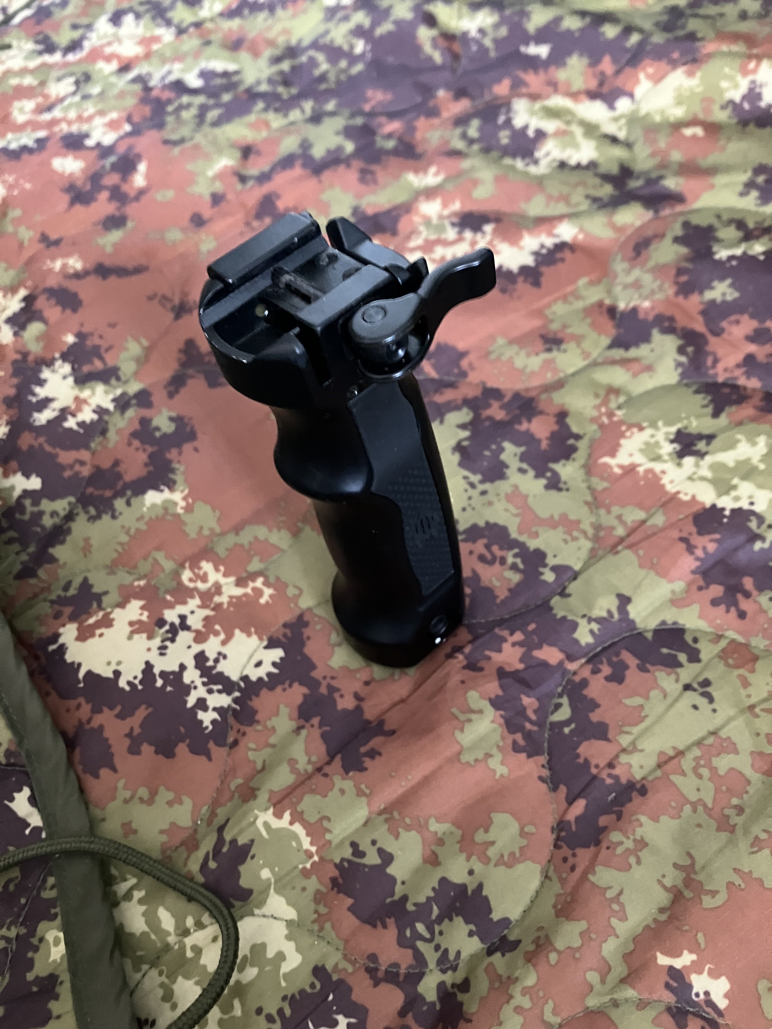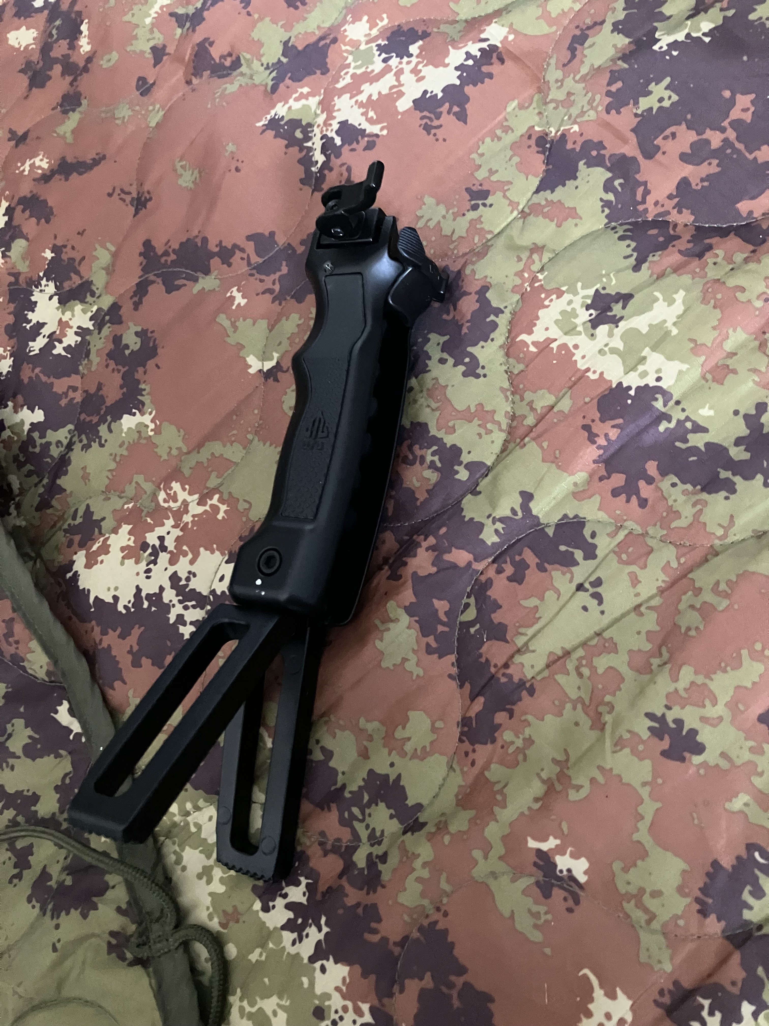 Рукоятка перенесення вогню UTG Combat D Grip виготовлена з анодованого алюмінію та оснащена гумовими рельєфними накладками в місцях утримання, які забезпечують надійне утримання в екстремальних ситуаціях (включаючи рукавички) та перешкоджають перегріванню під час інтенсивної стрільби. Відмінною рисою рукоятки є невеликі сошки, які легко відкидаються при натисканні кнопки. Стан новий, ціна 4200.
