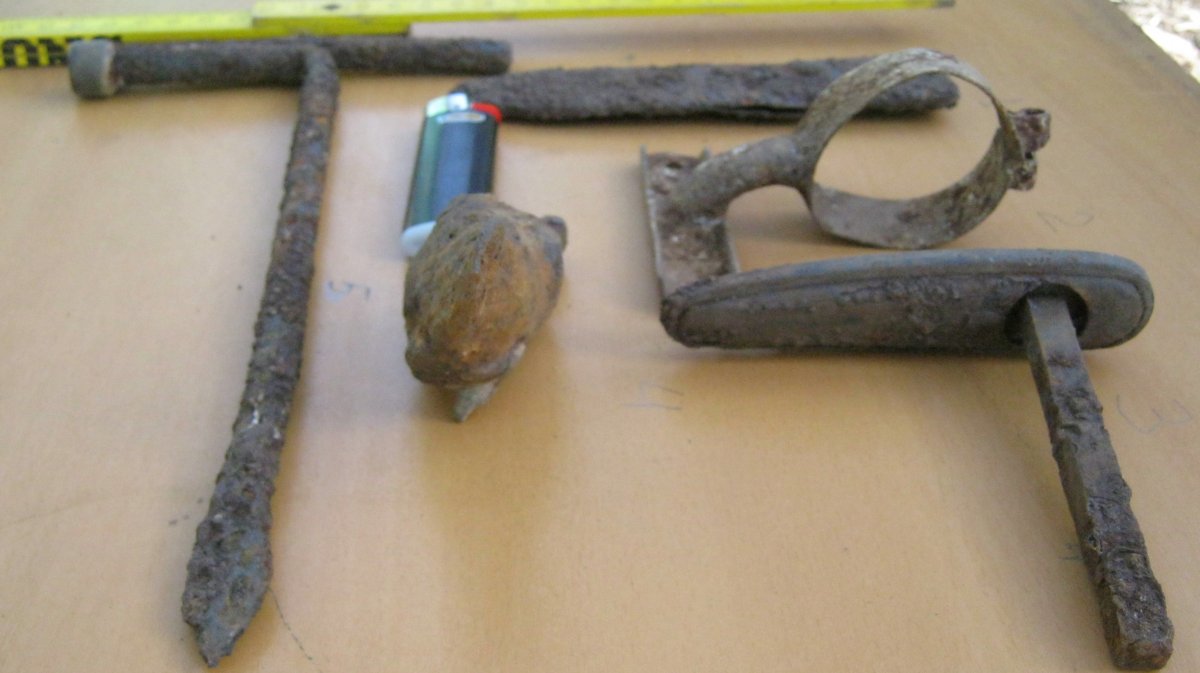 Здравствуйте,подскажите по копанине,особенно интересуют ножны,возможно когда-то были с окопника?А также выколотка с латунной насадкой,что-то типа молоточка и проколки?И от какой техники ручка?Заранее всем благодарен.И еще там какая-то непонятка с латунными отростками,что это могло быть при жизни?