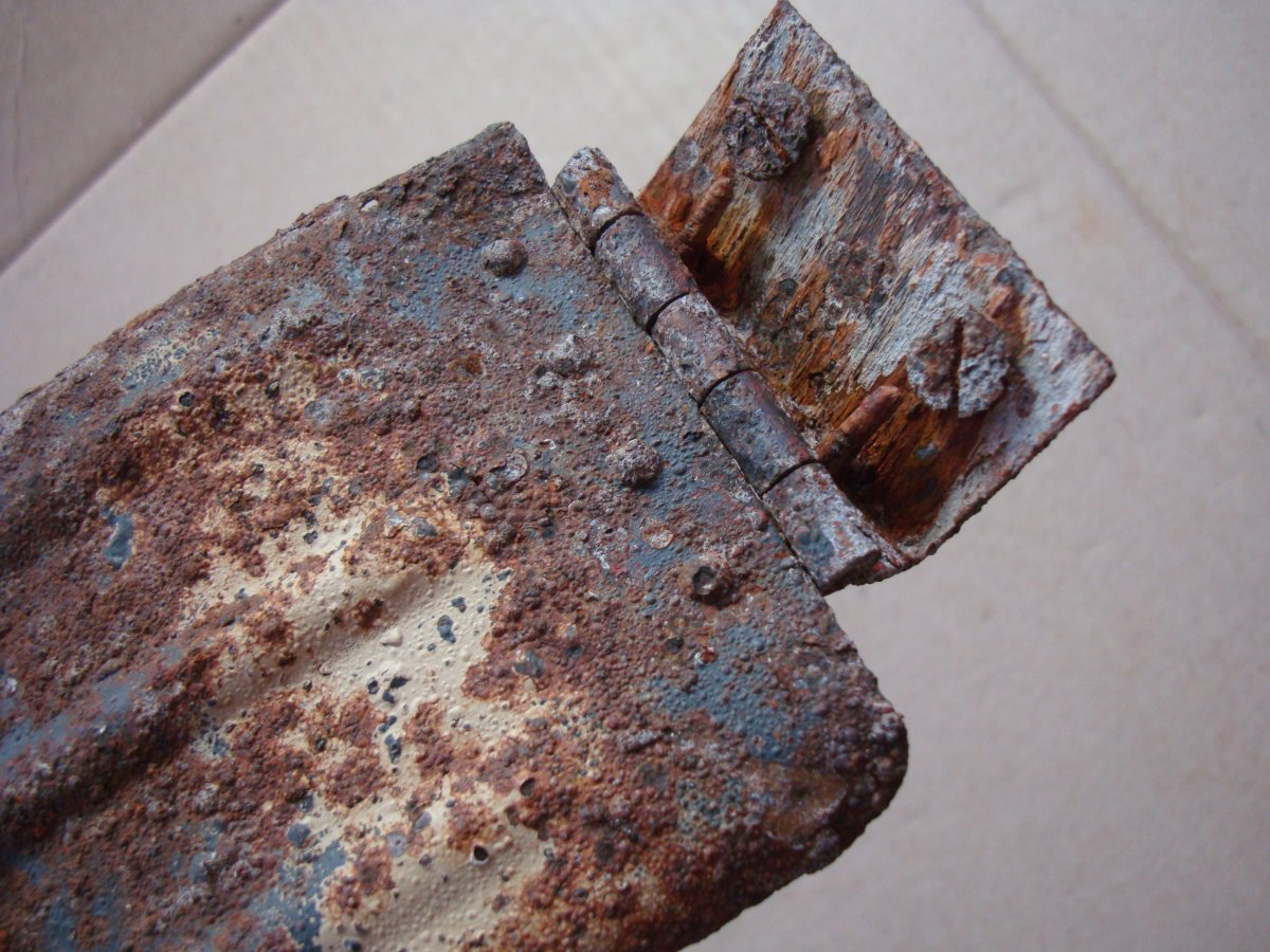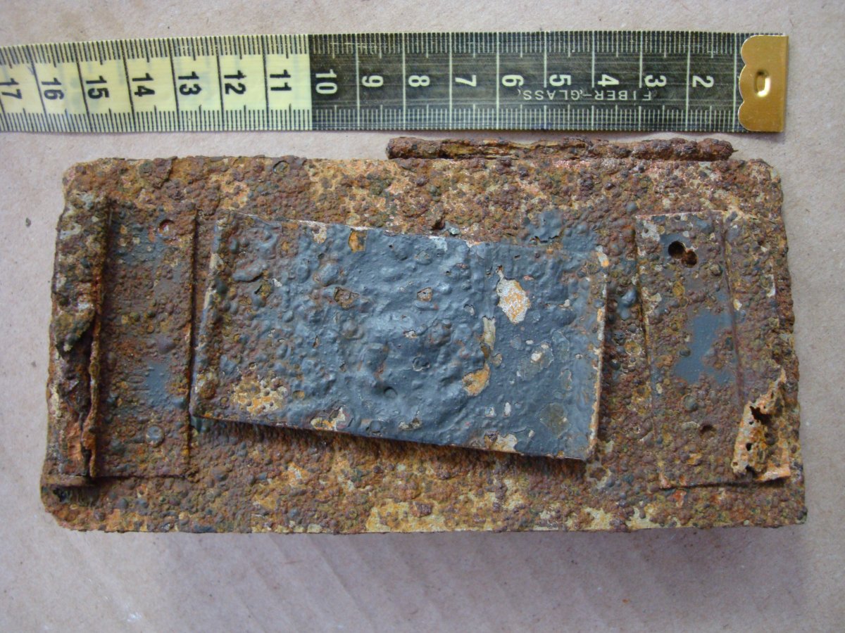 №3 Крышка с навесом и защёлкой .Имеет камуфлированный окрас.Судя по фрагментам дерева на навесе ,возможно крепилась на каком то деревянном коробе .