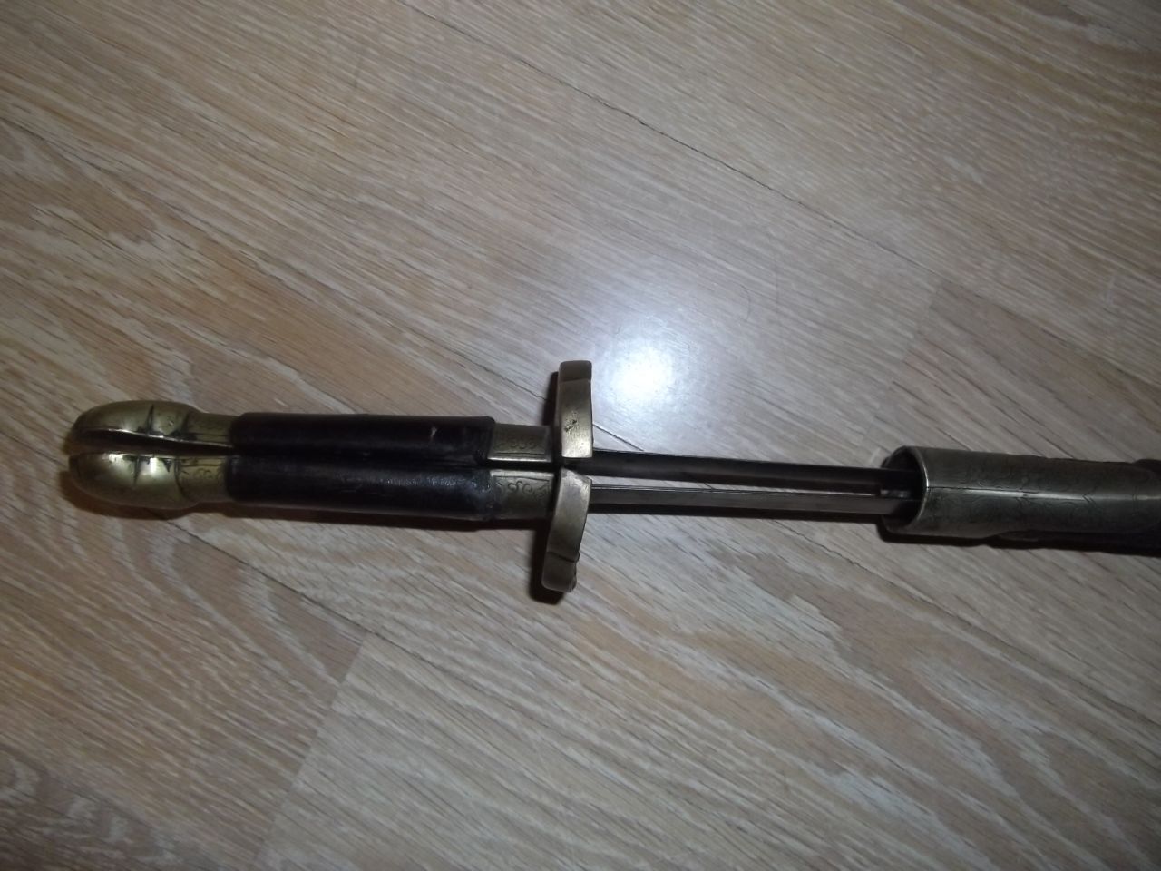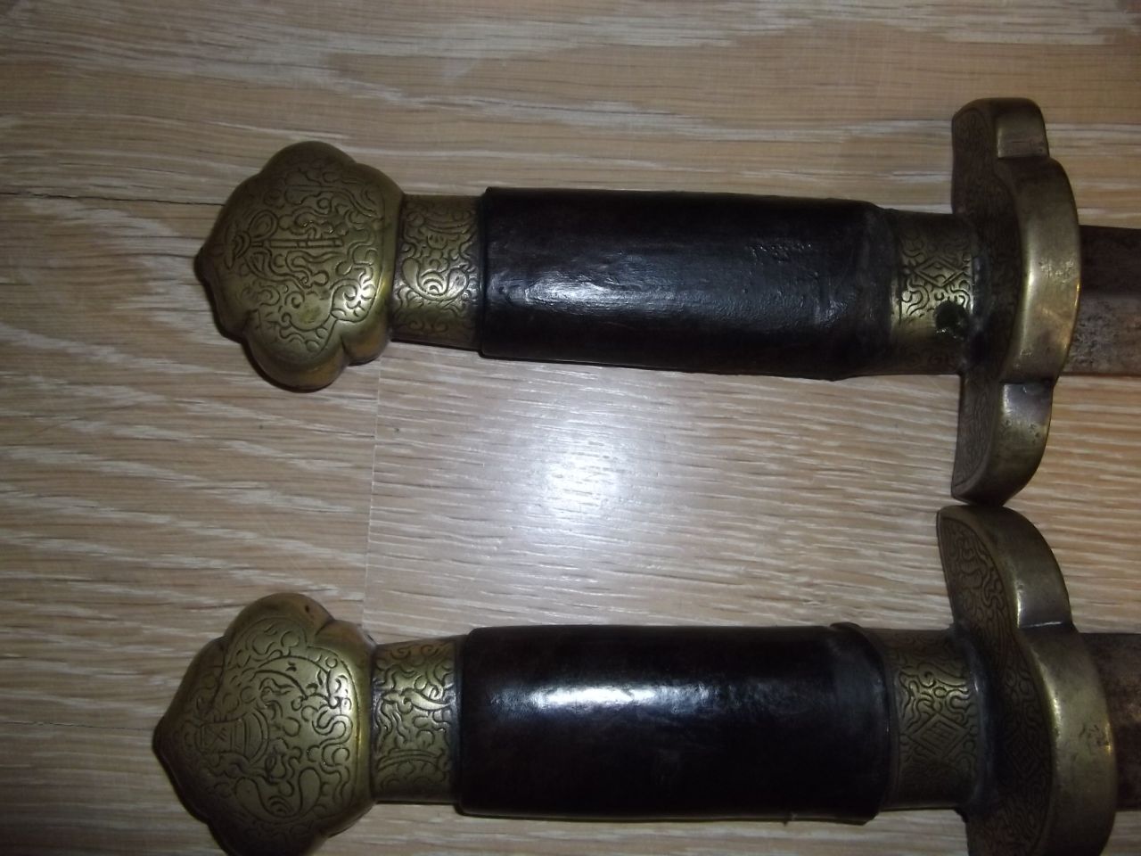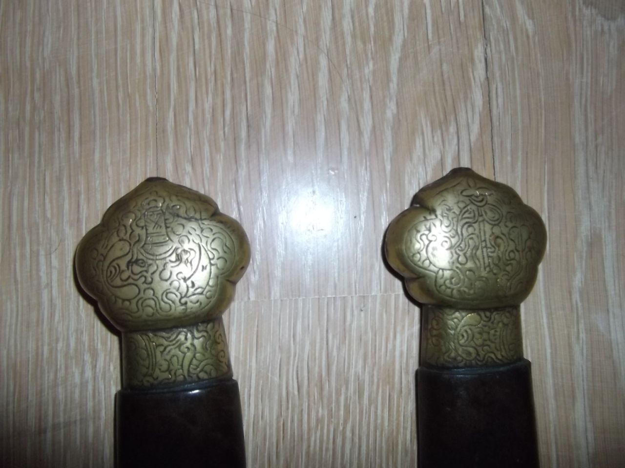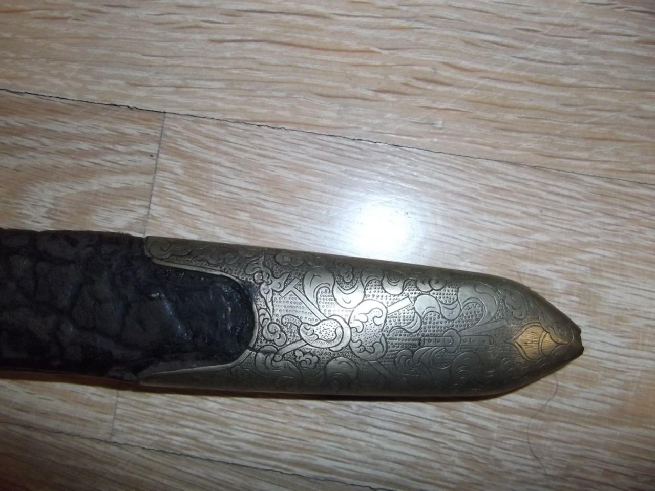 Сроки изготовления не меняю. Рукоять - латунь. Судя по характеру замятия - лезвие тонкое, сталь пластилин, т.е. - скорее всего либо тренировочные снаряды у-шу либо реквизит из китайского театра, 100-150 у.е.
