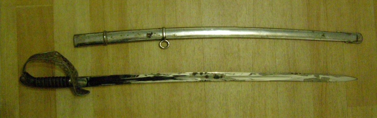 Австро-венгрия, кавалерийская, офицерская обр.1904 года, частный заказ с нестандартным клинком (для ношения вне строя). Верхняя часть гарды загнута. По надписи на гарде не скажу - в истории австрийского оружия еще так далеко не зашел. Дороже 300 евро бы не купил (коррозия на клинке).