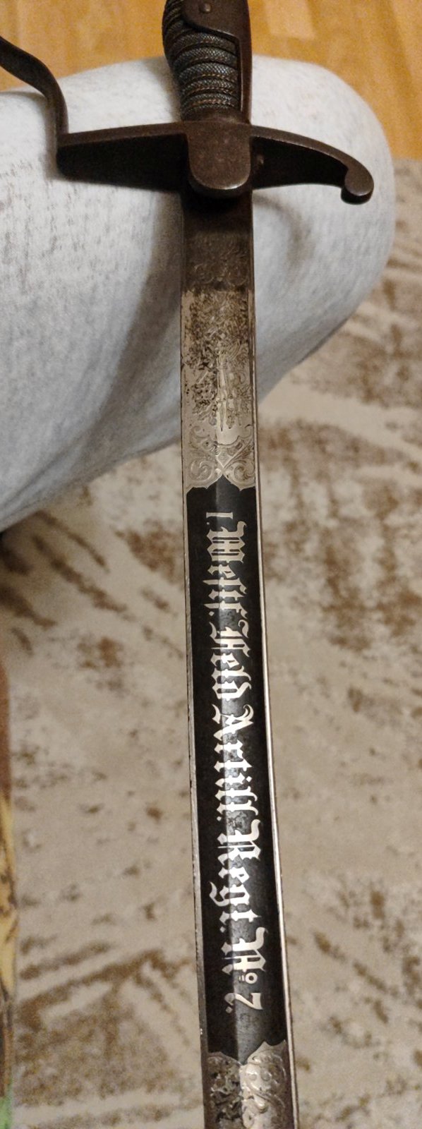 Що стосується вахміста артилерії (тіпа унтерофіцера), по службі видавалась звичайна військова шабля. Різниця лише була в забарвленні темляка Поза службою у вахмістра шабля була подібна до офіцерської, з латунним єфесом, і темляком ідентичним офіцерському. В темі бачу звичайну памятно-подарункову солдатську шаблю. Купувалась власним коштом як згадка про службу. Як і рядовими піхотинцями всілякі штики-парадніки. Якось так.