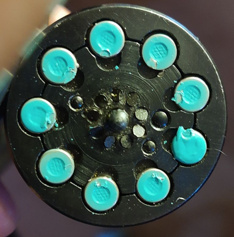 В итоге грешил на качество пуль, но меня смутило то что не было видимых следов на гильзах от ударника, приехав домой нанёс на "отстрелянные" гильзы лак и отщёлкал их. Результат на фото, т.е. ударник лупит по шляпке гильзы, но никак ни по центру. Подскажите это так и должно быть или это явный брак?