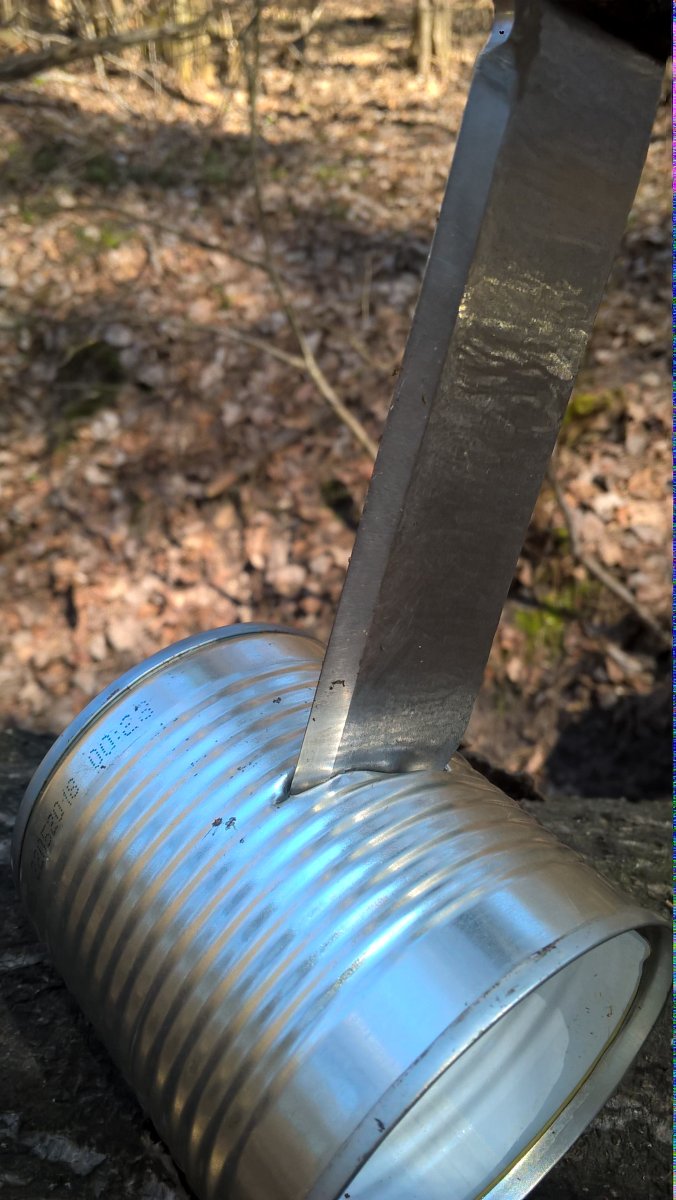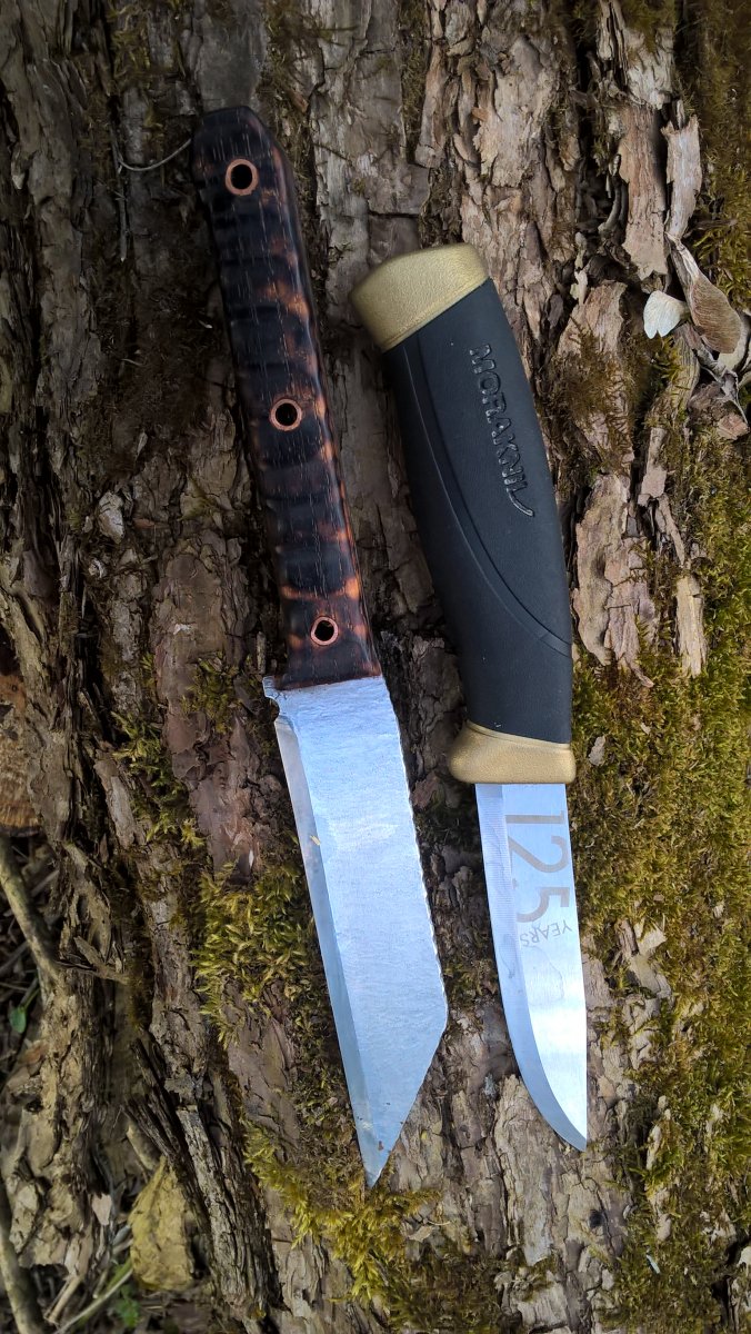 Вот такой нож, по мотивам известного ножа ну или же его "увеличенного брата", короткого меча скрамасакса. Нож задумывался как нечто брутально-туристическое или же лагерное, но можно использовать как вашей дуже угодно. Удобно резать, колоть, рубить, не страшно батонить, поднимать люки и вскрывать танки (смотри фото) и т.д. Низкие сканди спуски, хотя, на сколько я понимаю они и у оригинальных саксов бывали низкими, сведение в ноль. Сделан микроподвод. Режет прекрасно. Кончик мощный - можно смело ковырять. Финиш обуха - битый камень, клинка - колотый лед. Удобен в руке, в том числе и в перчатках. На накладках рукояти какой-то экзот. Рукоять частично обожжена, вскрыта в несколько слоев льнянкой. Монтаж на эбоксидку и штифты. В качестве штифтов медная трубка. Крайнюю можно использовать как темлячное отверстие. Нож не вылизывался, есть некоторые косметические огрехи - ни на что не влияют. Вообщем нож вышел практичным, брутальным и харизматичным. Владельцу добавляет +500 к харизме, +200 к одноклинковому На шашлыках вызывает вау эффект, который очень просто продлить рассказав легенду про диких и мужественных саксов и их верный ножи-мечи Немного цифр: Сталь на клинке: пружинно-ресорная, я намерял 54 по Роквелу. Да не слишком твердая, зато рубить не страшно и править не сложно. Ширина клинка: 29мм Толшина: 3мм Длинна клинка: 133мм Длинна рк: 125мм Полная длинна: 250мм Масса: 133г Цена: 450грн.