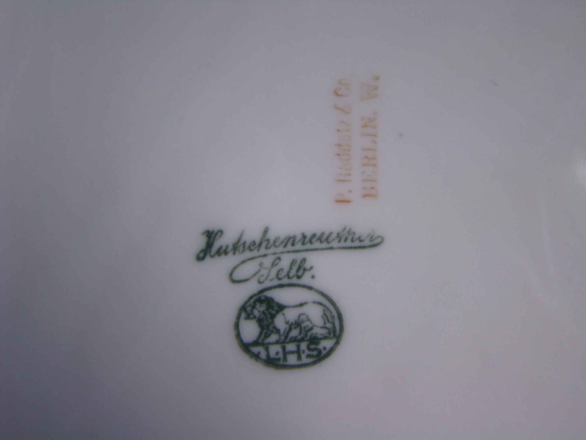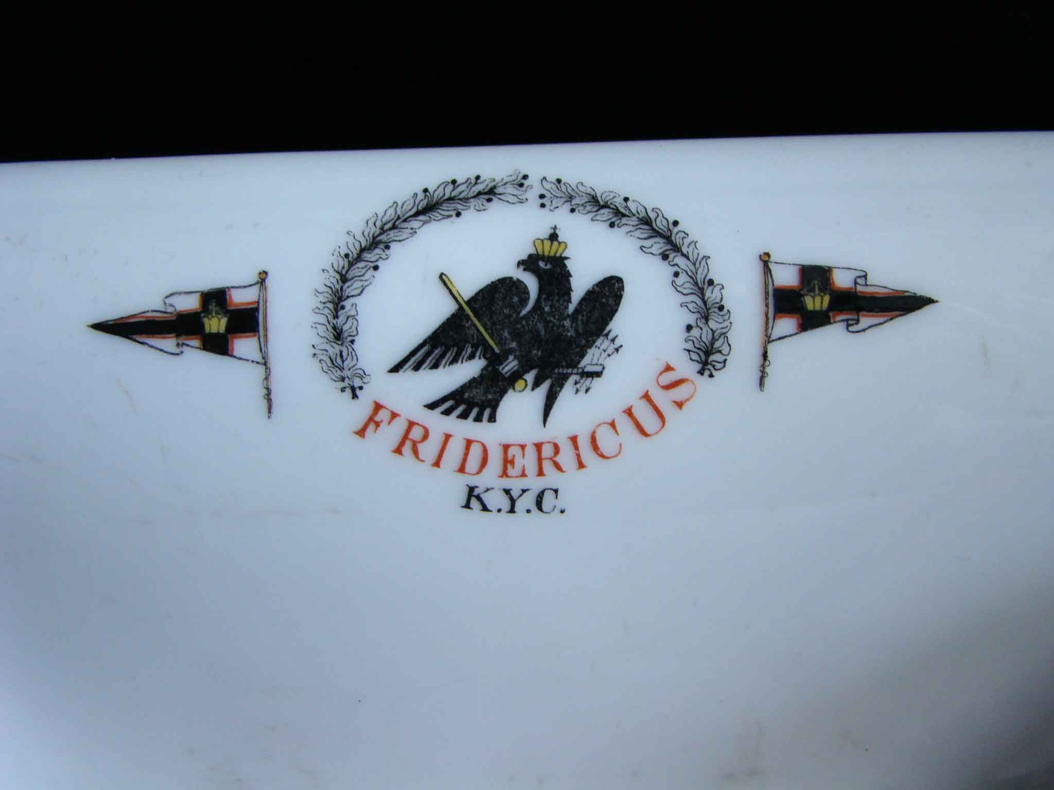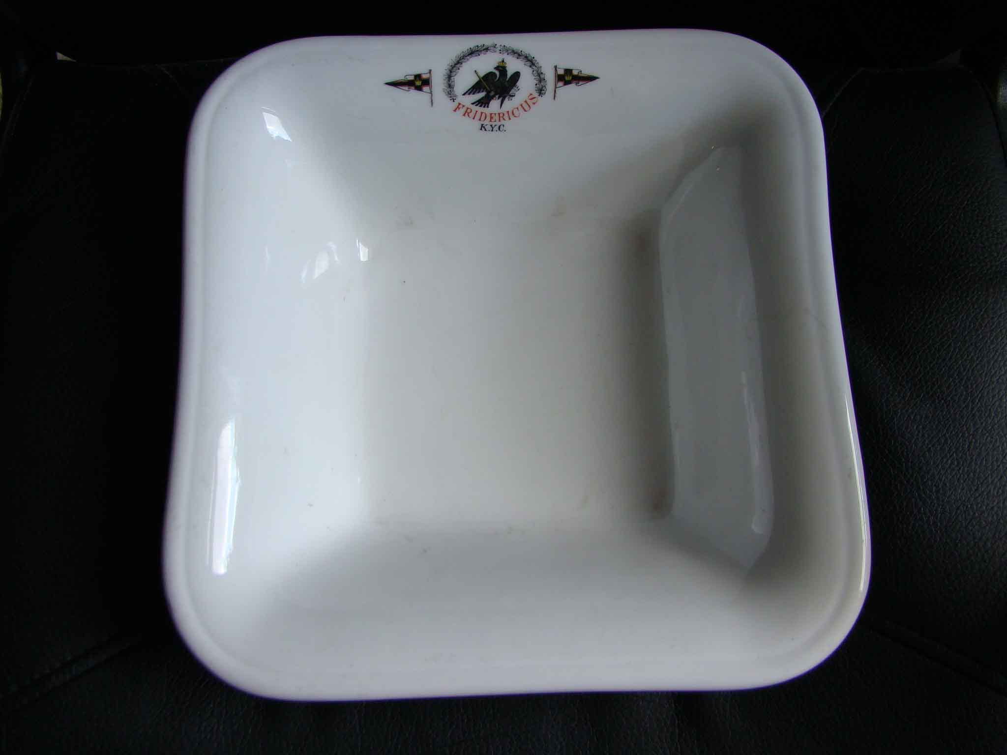вопрос по такому салатнику - что за Фридерикус (столовая, ресторан, корабль, ещё что то?) и точная датировка - по клейму Хученройтер с 1925 по 1939 ? с таким именем и флагом яхтклуб существовал с 1891 по 1937 (последнее достижение это организация регаты в рамках летней Олимпиады 1936) http://en.wikipedia.org/wiki/Kaiserlicher_Yacht_Club по клейму фирмы дистрибьютора, если я правильно понимаю, немного здесь нашёл http://www.steinmarks.co.uk/pages/pv.asp?p=stein564 вообще неясно зачем модному яхтклубу такие столовские миски. разве что действительно кантина для кормления народа при массовых мероприятиях типа "кильской недели" или той же Олимпиады?