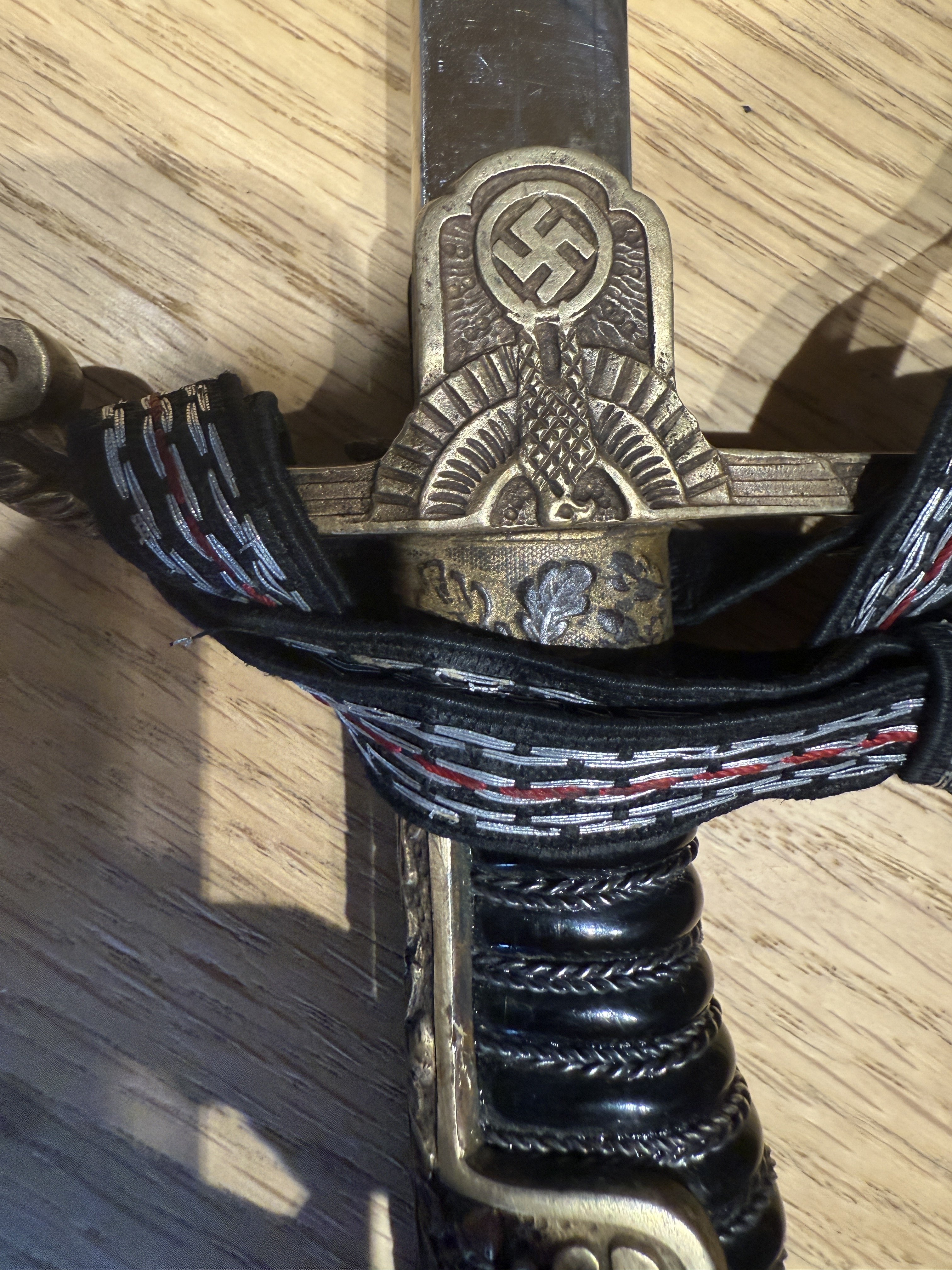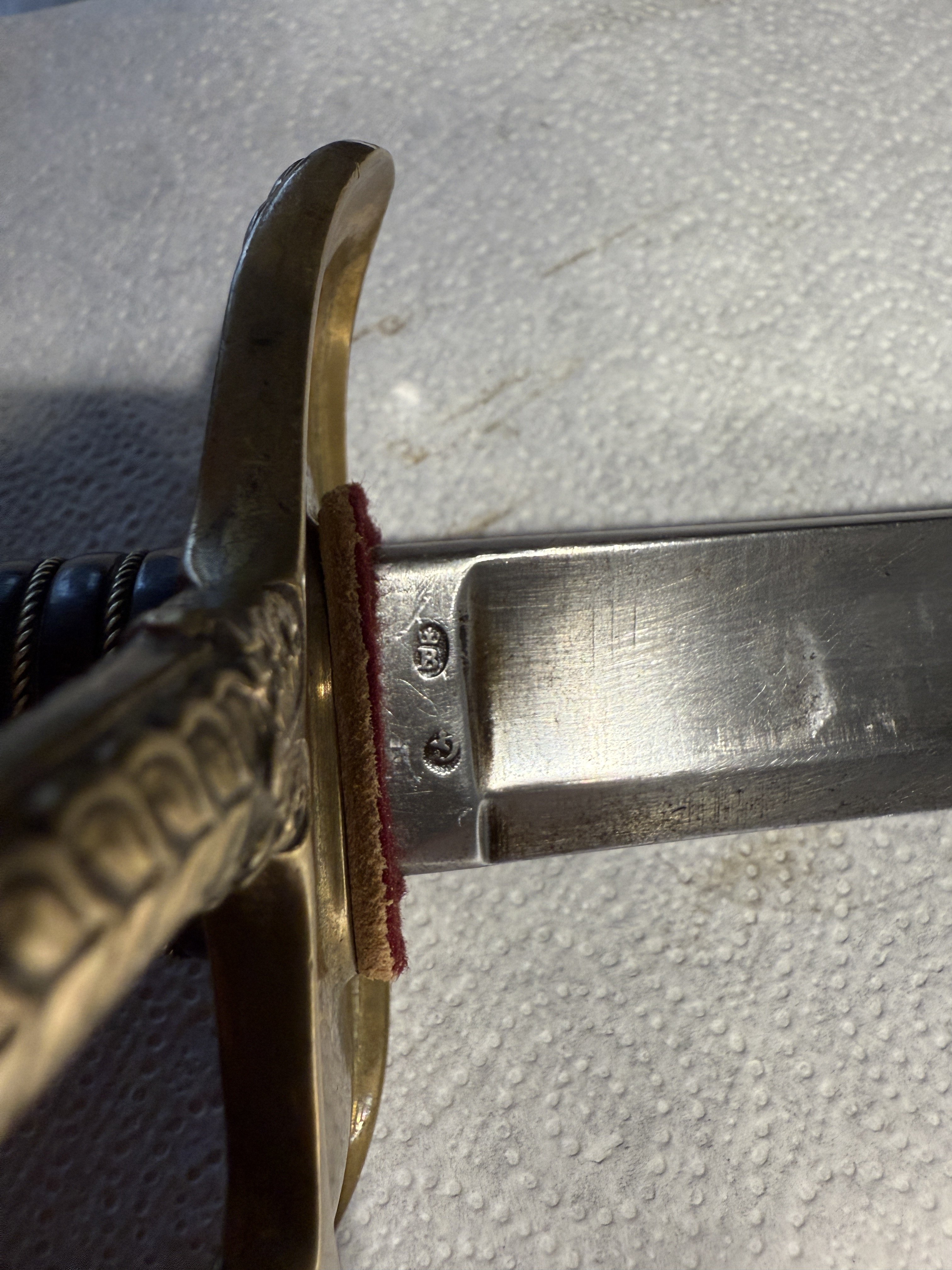 А что вы скажете за этот экземпляр? Третий рейх немецкая парадная офицерская. Есть подозрение что новодел…кроме лезвия клейм больше нигде не видно(((