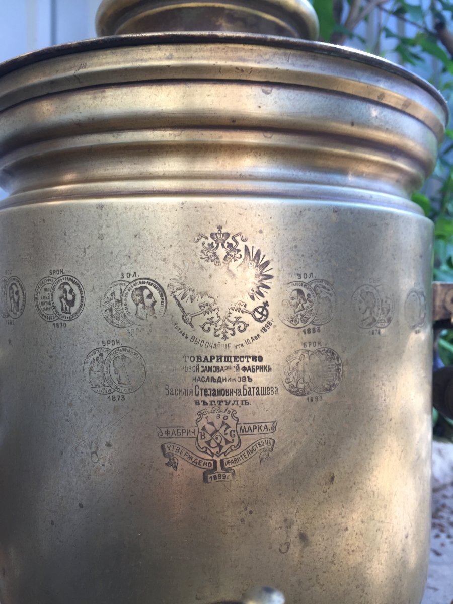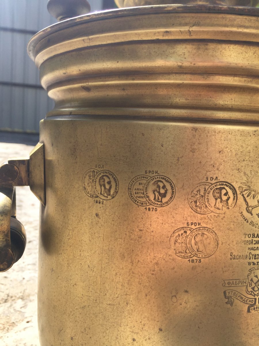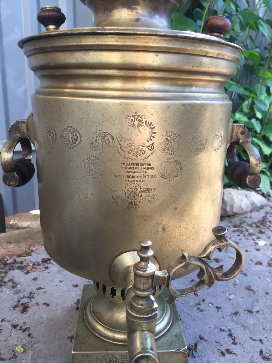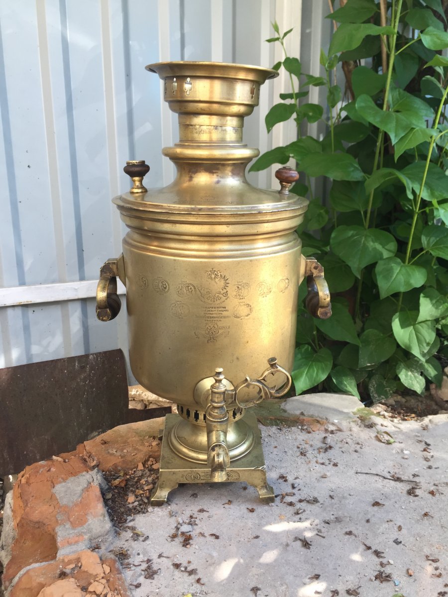 Всем доброго дня! В начале лета попался мне такой вот самовар Баташева,имперский орёл,куча медалей! Есть трещинки и вмятинки но в целом состояние не плохое! Растапливал его прочистил накипь с лимонкой,течи как таковой нет!можно использовать по назначению!