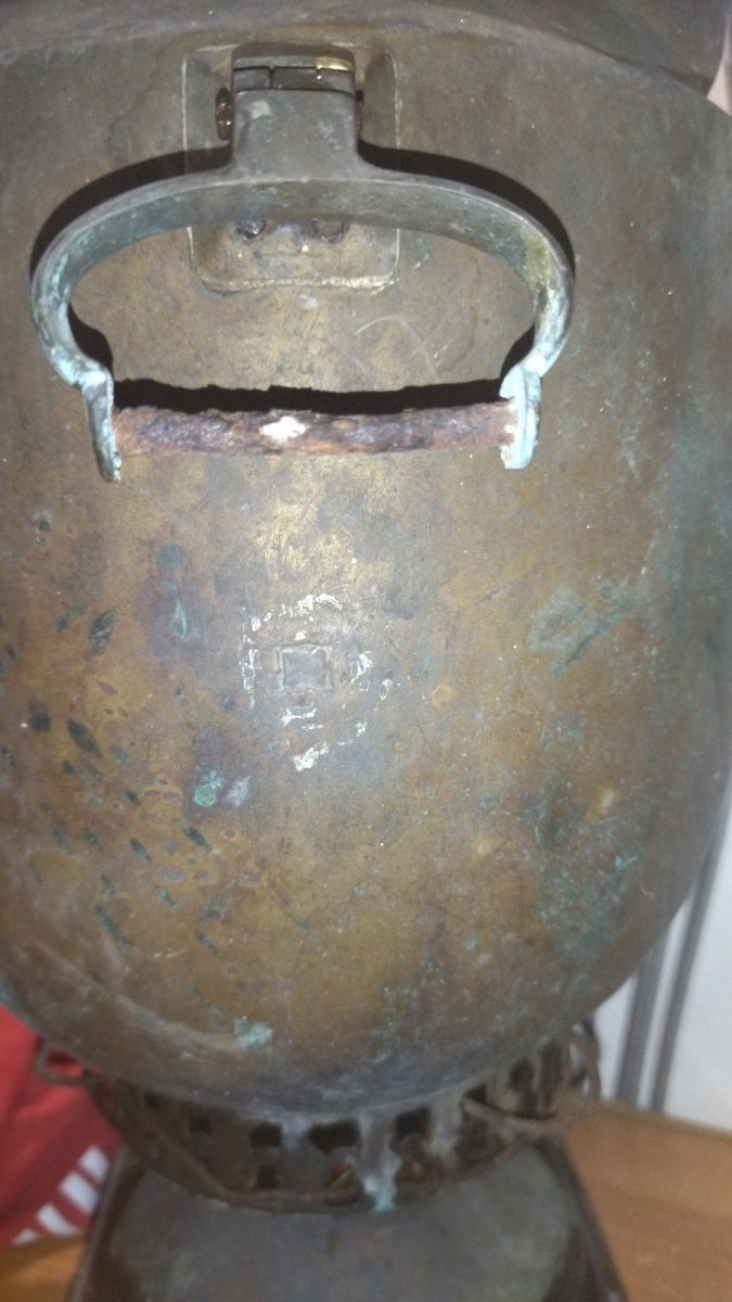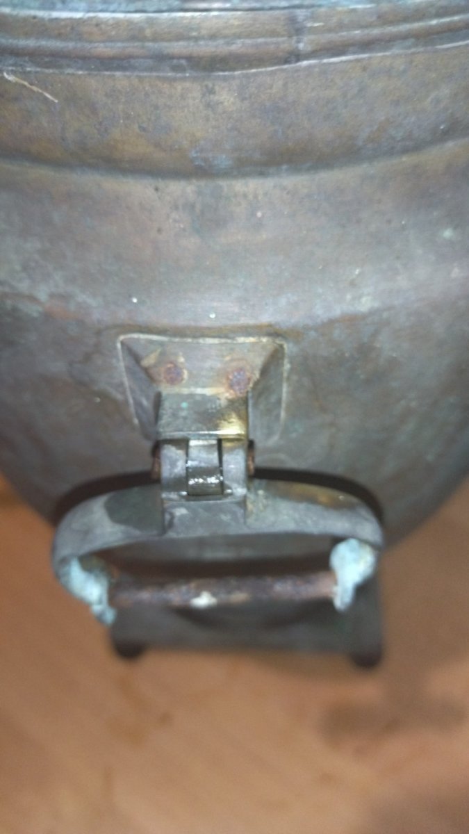 Доброго. Сверху вниз: короны нет, колпачка нет, 1шт ухватки нет, паровика нет, ручки - ремонт с перепайкой и поиском дерева на правую ручку, репеёк тоже надо перепаивать, колосника нет. Сама колба и шейка по фото имеют дефекты, ветка крана похоже не родная. Топка, кажется прогаров не имеет, но надо смотреть вживую. На мой взгляд, стоимость восстановления превысит стоимость данного предмета в нынешнем состоянии. Клейма суконкой (или кухонной губкой с абразивом) чухните. ЗЫ: ни разу не видел, что бы клейма были под ручками. Обычно над краном на колбе или под краном на поддоне.