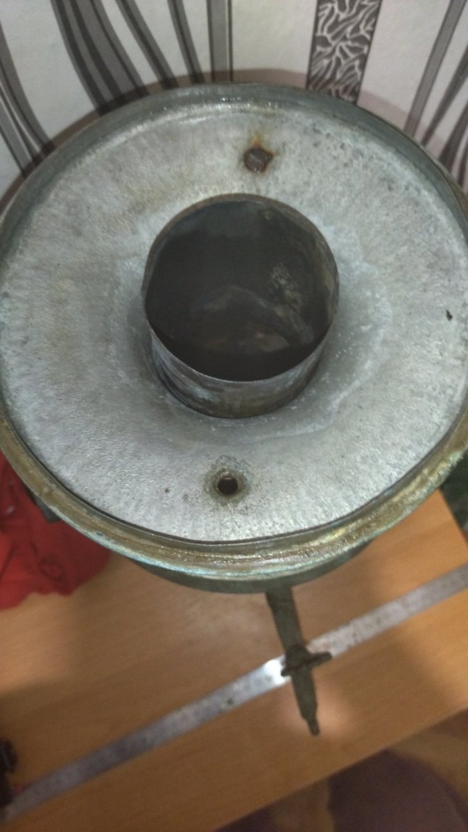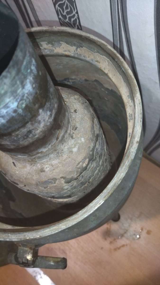Колба и шейка целые без дефектов!! Ето накип внутри! И все запчасти родные не течёт имеет пару небольших вмятин по наруже!! Короны зольника и колосняка нет По клейму подскажите пожалуйста кто нибудь!! Я такого ещё не видел
