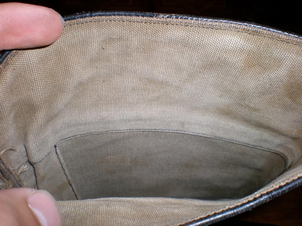 Тонкая черная кожа, очень мягкая, внутри сапог подбит брезентом, деревянные гвоздики.