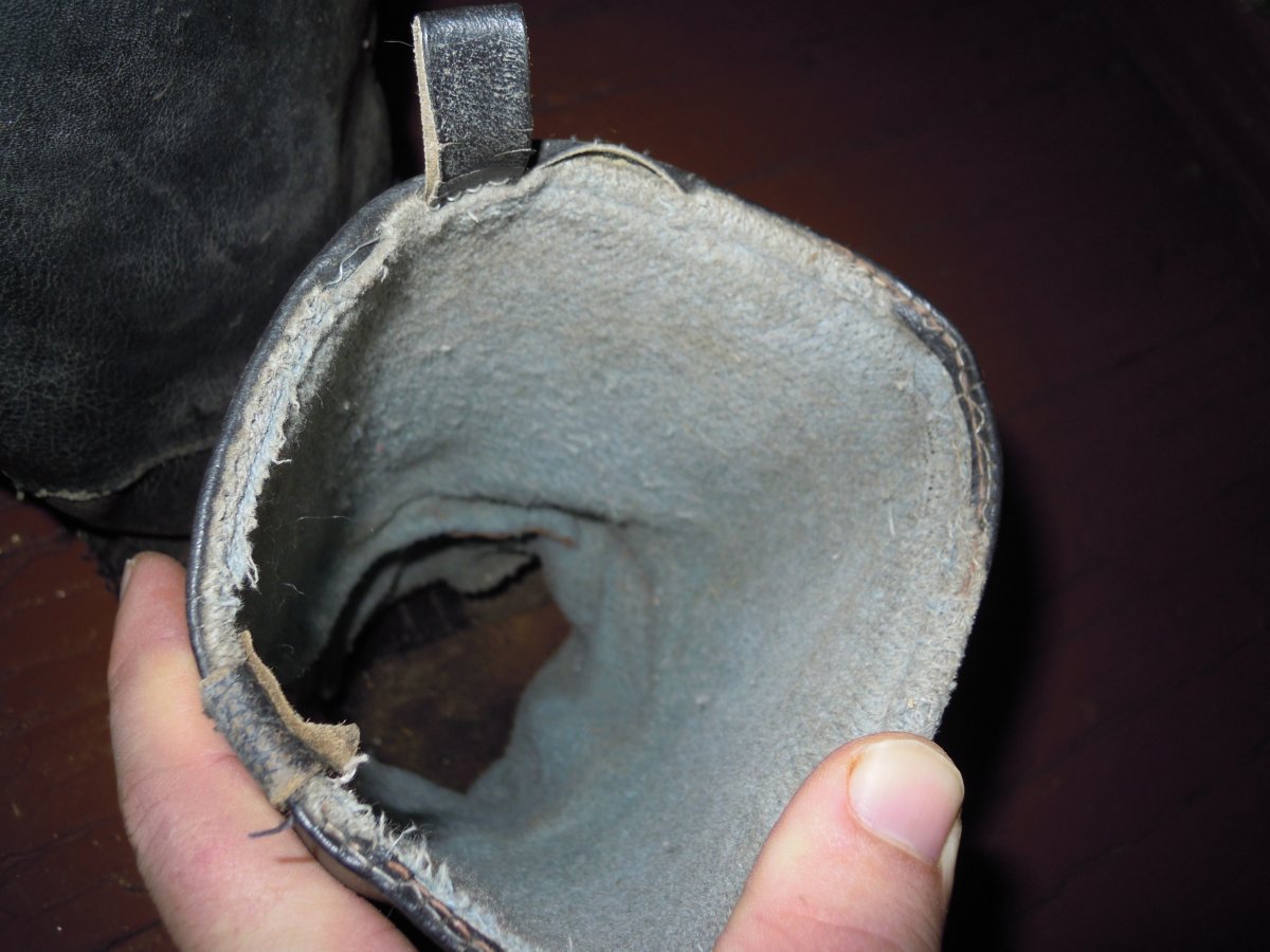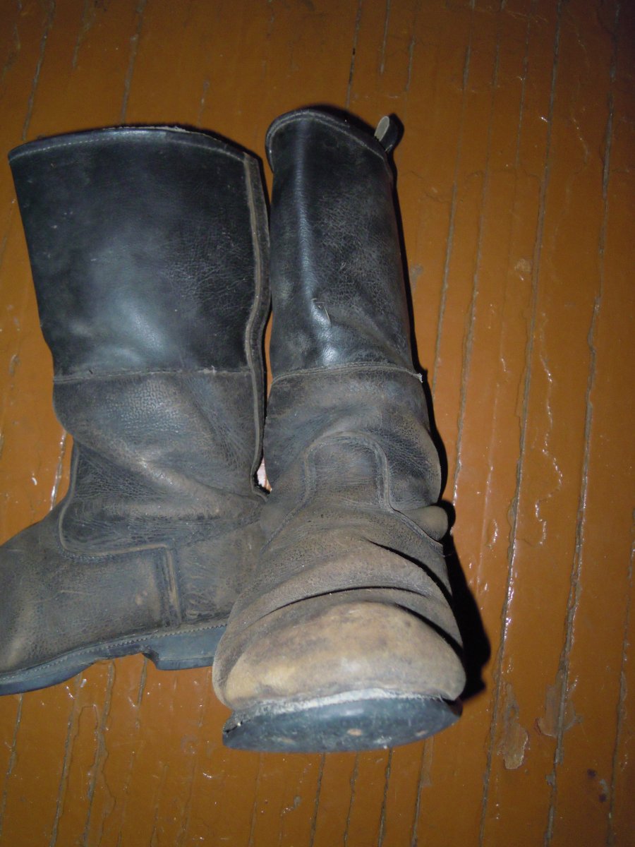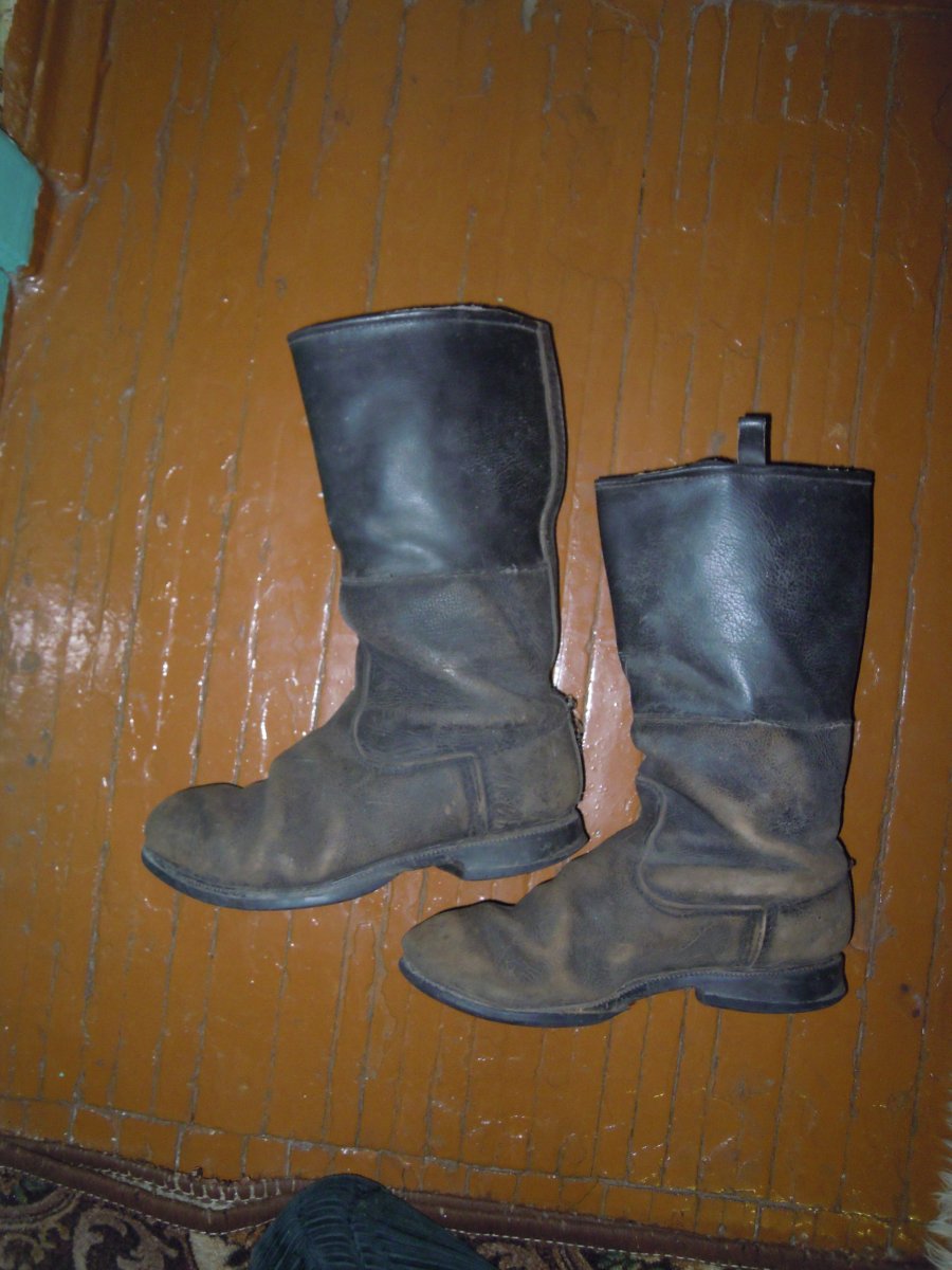 Знайдені в Німеччині в кинутому будинку. село Альтбенсдорф, округ Бранденбург. В році 2011. Довго лежали вдома без уваги, але все таки хочеть дізнатися що це за? Чи Вермахт чи НДР? Підходять для переробки під Вермахт? Вцілому видно, що підошва міняна, голенище утеплене і складаєть з 2 частин(шкіряної і не шкіряної). Допоможіть в ідентифікації. Нещодавно помив та випрямив. Колір коричневий, чи то просто затерті сильно!