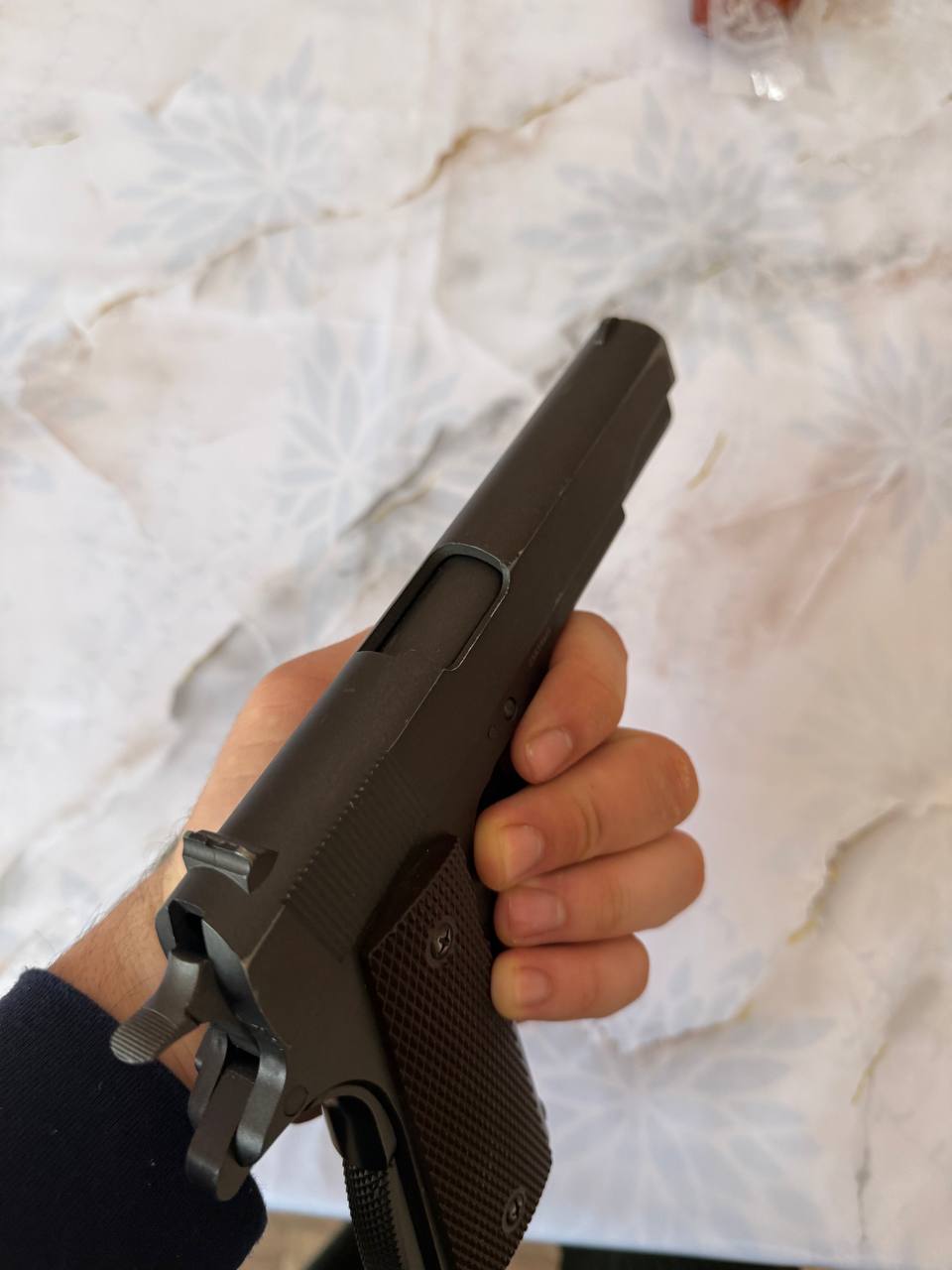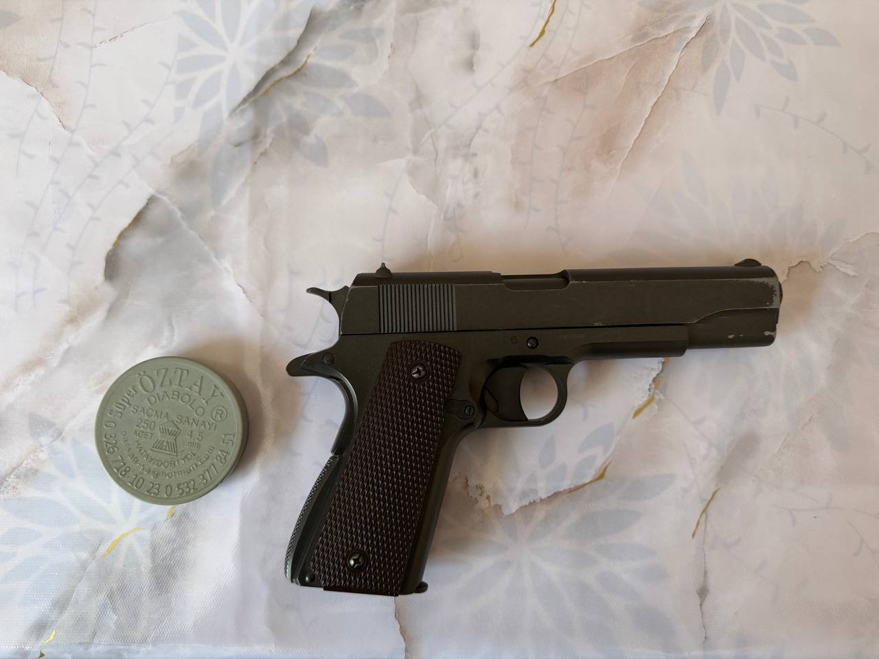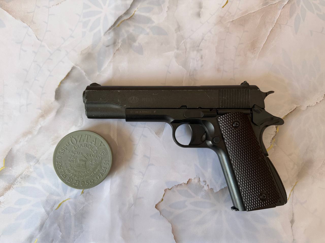 Пневматичний пістолет SAS M1911 Pellet 4.5 Модель SAS M1911 Pellet точно так само як і модель SAS M1911 копіює бойовий аналог Colt M1911, але в якості боєприпасів в SAS M1911 Pellet використовуються пневматичні кулі 4,5 мм, в пістолеті встановлений нарізний ствол і роторний магазин з двома барабанами загальною ємністю 12 зарядів. Завдяки зміненій конструкції магазину, одного 12-ти грамового CO2 балона буде достатньо для здійснення 70-80 пострілів без істотної втрати потужності. Пістолет у відмінному стані! Працює добре! У комплекті: - пістолет - кулі Ціна - 3499гр Надішлю поштою.