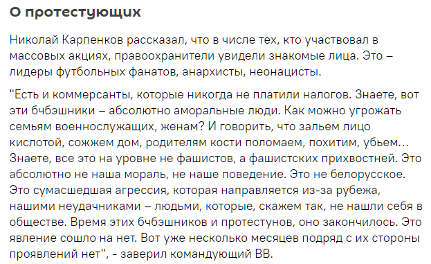 Смотрю: гуманные у них "силовики".... Гребаные ссыкуны!!!! На БТРах и в доспехах пи...бить незащищенный мирняк.... Беларусь, гордись своими сынами в погонах!!!