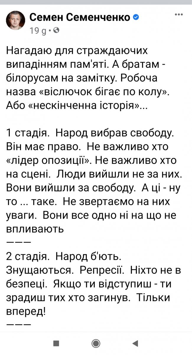 Нагадаю для страждаючих випадінням пам'яті. А братам - білорусам на замітку. Робоча назва «вiслючок бігає по колу». Або «нескінченна історія»... 1 стадія. Народ вибрав свободу. Він має право. Не важливо хто «лідер опозиції». Не важливо хто на сцені. Люди вийшли не за них. Вони вийшли за свободу. А ці - ну то ... таке. Не звертаємо на них уваги. Вони все одно ні на що не впливають ——— 2 стадія. Народ б'ють. Знущаються. Репресії. Ніхто не в безпеці. Якщо ти відступиш - ти зрадиш тих хто загинув. Тільки вперед! ——— 3 стадія. Ми перемогли!!! Тепер треба цивілізовано управляти країною. Хто зможе це робити? Так, ті хто на сцені вони... не ідеальні. До них ... маса питань. У них зв'язок з ворогами і злодіями з минулого. Але це нічого. Нехай поки вони. До них ми впровадимо «нових_молодих_лідерів_які_показали_себе_на_протестах. Вони не дадуть їм зрадити. А якщо що - ми завжди їх «винесемо» як і тих хто був до них!!! ———- 4 стадія. Влада ділить портфелі? Краде? Не виконує обіцянки? Труднощі перехідного періоду. Зараз не до цього. Нам всім загрожує небезпека. Підступний ворог хоче підпорядкувати нас своїй волі!!! Ваше місце не в столиці і не в теплих ліжках. Все на фронт боротьби з ворогом!!! Потім повернемося - розберемося!!! ———— 5 стадія. Нові_молоді_лідери_які_показали_себе_на_протестах» скурвились? Вони стали збагачуватися і брехати? Це не правда!!! Влада обманює і зраджує? Це не правда!!! Всі хто так стверджує - агенти ворога. Зрадофіли. І моральні виродки - ось по телевізору це зараз підтвердять свідки їх злочинів. У в'язницю їх! «Борець»- не індульгенція від злочинів! У нас просто так не садять! Не_все_так_однозначно! Добре, ось вам ще більш нові_моральні_лідери. Їх проявила нова боротьба! Вони зараз як скажуть! Хоча ні. Справжні герої - вони мовчазні. Вони скромні. Тихо роблять свою справу. І не заважають жити іншим. ———— 6 стадія. Народ втомився? Готовий знову піднятися? Ок. Не треба. Ось новий, не системний дилер. Навесні - будуть просадки. Взимку - пробіжки. Кінець епохи бідності. Ні- стражданням, так - голосуванням! ————- 7 стадія. Не треба говорити про злочини минулої влади! Тому що є вже нова. А стара - вона ... та не про неї тепер мова! Подивіться що зараз твориться! Перестаньте ворушити минуле! Не до цього! ———— 8 стадія. Нова влада-злочинна влада! Вона намагається посадити тих хто був до неї! Хто вів країну в золоте Століття. Якщо ви цього не пам'ятаєте то ви - бобики, лохи і агенти ворога. Якщо пам'ятаєте - патріоти. Хто ворушить минуле - агент. Хто не ворушить - дай руку камрад. Всі на боротьбу з капітулянтами перед ворогом! Криголам! Криголам! ————- Стадія остання вона ж знов перша. Народ вибрав свободу. Він має право. Не важливо хто «лідер опозиції». Не важливо хто на сцені. Люди вийшли не за них. Вони вийшли за свободу. А ці - та то таке.... Не звертаємо на них уваги. Вони все одно ні на що не впливають... —————- P.S. Множити пізнання - множити скорботу. . Самому неприємно це писати. Але це .... правда. Нажаль.