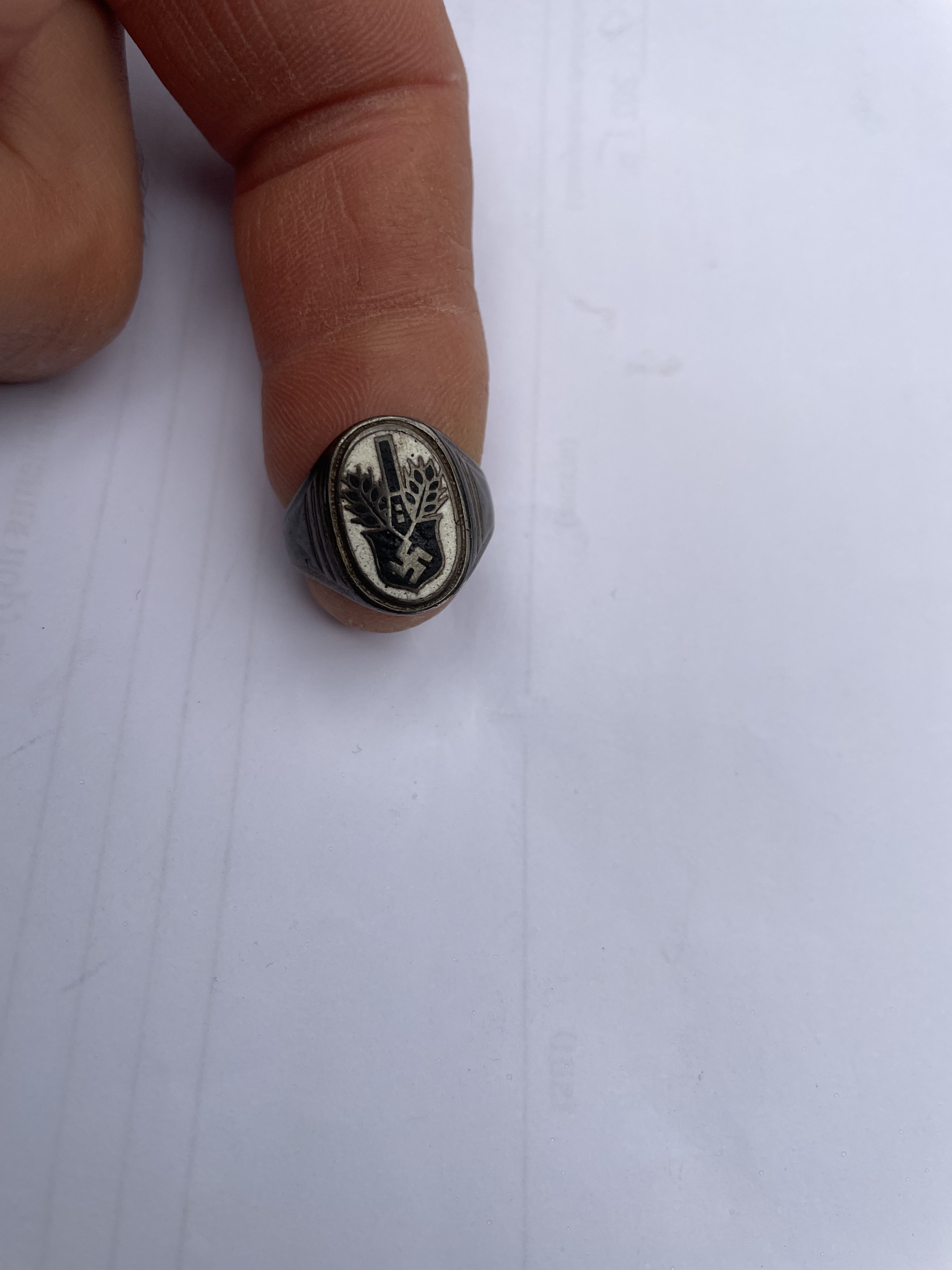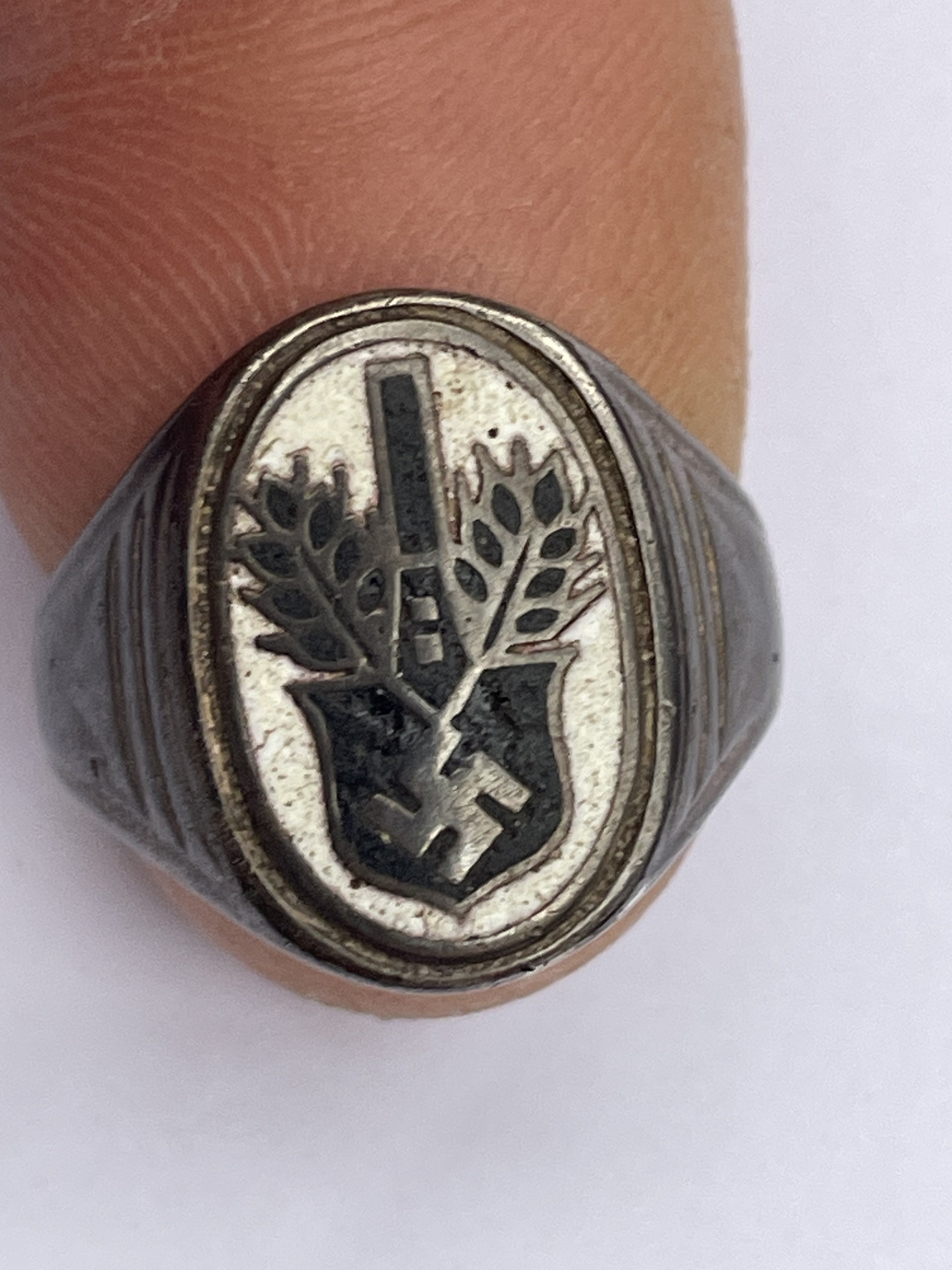 Доброго! Кольцо с символикой Имперской службы труда RAD. Reichsarbeitsdienst (RAD). Официальная символика RAD — вертикальная лопата с рукояткой, обрамленная двумя колосьями пшеницы, и свастика внизу на щите. Серебро 835 пробы. Маленькое потому, что с 18 лет каждый юный немец обязательно отбывал шестимесячную трудовую повинность, которая предшествовала военной службе. Кому то из них и принадлежало.