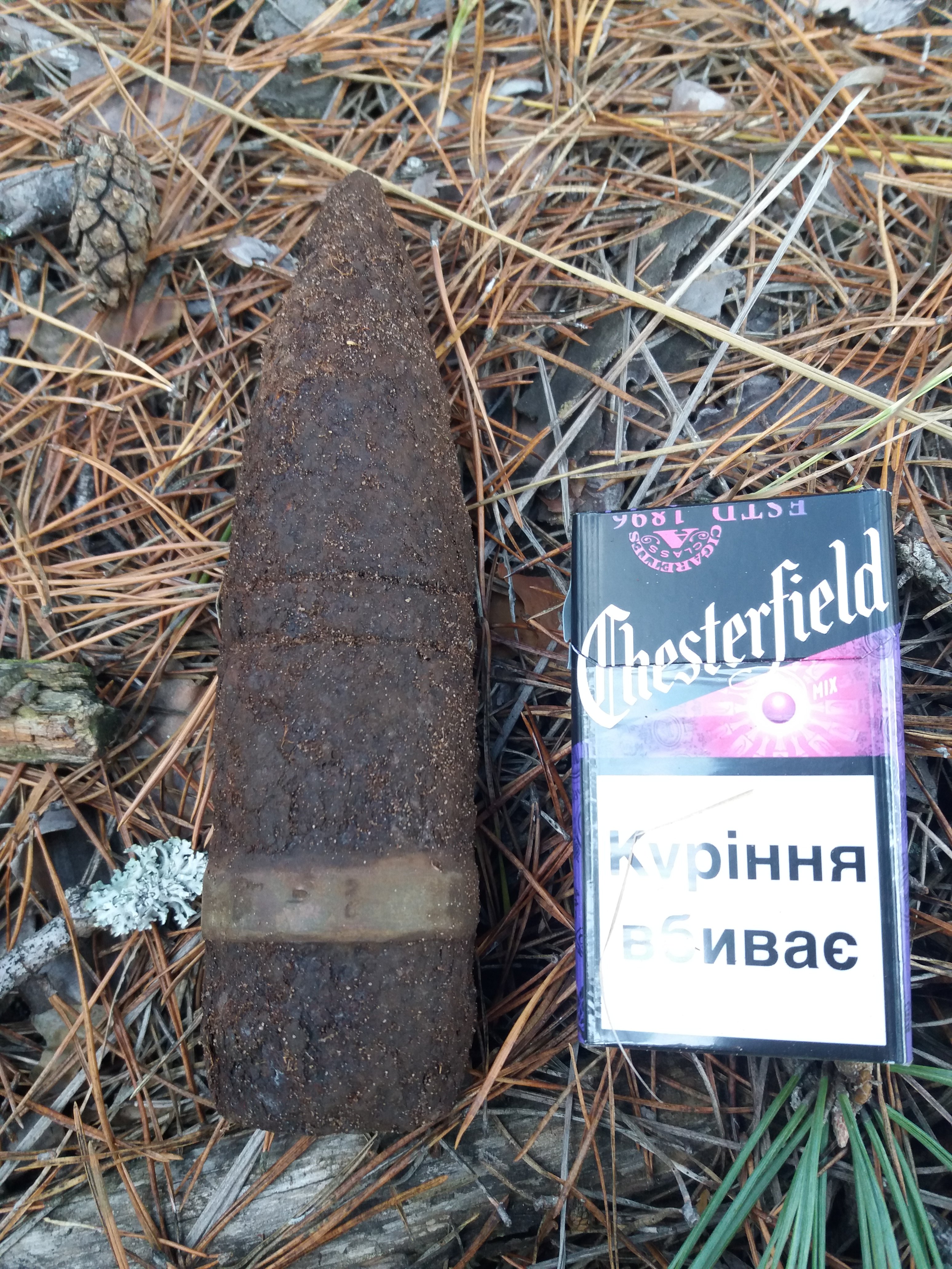 Лежит возле киевского Капонира. Может когда-то давно там стреляли такими, а этот просто вылетел за территорию полигона. наверно. Другой версии пока нет)