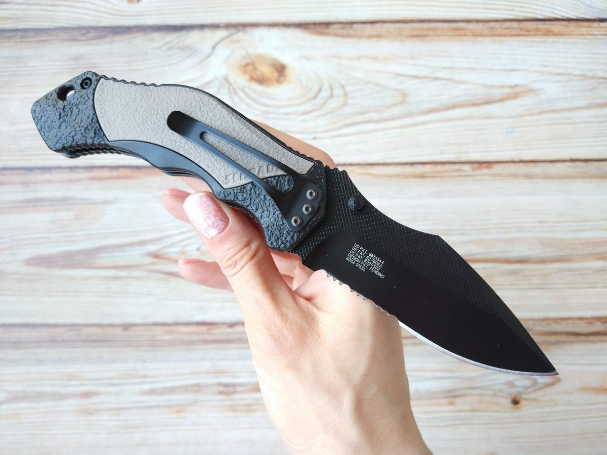 Клинок - интересная вариация «на тему» Clip Point, с комбинированной, полусеррейторной заточкой, изготовлен из стали 4034. Эта японская сталь обладает хорошим соотношением эксплуатационных характеристик к стоимости. Сталь 4034 отличается неприхотливостью, пластичностью и стойкостью к ударным нагрузкам – то, что нужно рабочему EDC ножу. Финишное покрытие клинка - black coating.