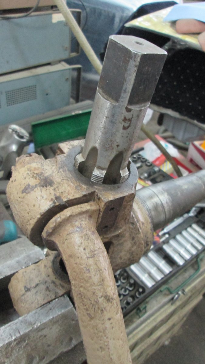 Балка колёсного хода.Сама по себе балка не нуждалась в восстановлении.Трещин и деформаций ( к огромной радости ) - не было, так как первый дефект не подлежит восстановлению, а второй потребовал бы значительных затрат сил и времени.Восстанавливались узлы крепящиеся к концам балки.Поясню некоторые технические термины, что бы было понятнее о чём идёт речь. 1.В проушину балки (1) неподвижно установлен шкворень (обозначен пунктиром).Шкворень - это ось на которой вращается поворотный кулак (2) на двух бронзовых втулках (3 и 4). Верхняя втулка (3) по форме похожа на стаканчик и наглухо запрессована в верхнюю часть поворотного кулака. Нижняя втулка (4) - вкручивается в поворотный кулак. Для этого,кстати,так же применяется серповидный ключ.Это фото было сделано уже после восстановления и изготовления изношенных деталей в процессе примерочной сборки. Самой большой проблемой оказалось откручивание нижней втулки.При работе без смазки "на сухую" ( об этом моменте далее) вначале образовался люфт между шкворнем и нижней втулкой, который со временем перерос в биение.Бронзовую резьбу втулки буквально вколотило в стальную резьбу кулака.Нагрев в данном случае абсолютно не спасал ситуации. 2.Старая втулка.Хорошо видна наружная резьба и канавки для смазки внутри.Все втулки были изготовлены заново. 3,4.Резьба поворотного кулака с вкраплениями бронзы. 5,6.Прогонка резьбы метчиком М45х1,5, который был специально приобретён для этого действа. В отличие от обычных схем (Газ-53, Зил ), где извлечение шкворня из балки требует не дюжей силы и кувалды (а по хорошему мощного пресса), немецкая конструкция позволяет сделать эту операцию "лёгким движение руки" 7,8.Шкворень в процессе демонтажа.На снимке хороши видно полное отсутствие смазки на нижней рабочей поверхности шкворня. 9,10.Состояние рабочих поверхностей - не очень хорошее.Сохранилось клеймо на верхней плоскости шкворня. 11.Шкворни после восстановления ( хромирование + шлифовка ).
