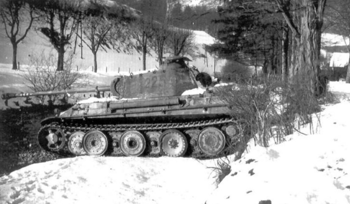 Машина участвовала в бою под Ла Глиз (La Gleize) в местечке Стумон (Stoumont) 19.12.1944 года. Была приписана к 1-й танковой дивизии СС LSSAH, бортовой номер 225. Экипаж: Командир: Обершарфюрер Ропетер (Ropeter) (ранен 19.12.1944) Механик-водитель: Роттенфюрер Ганс Страсдин (Hans Strasdin) (ранен 19.12.1944) Стрелок: Унтершарфюрер Альфред Шватен (Alfred Schwaten) (раненен 19.12.1944) Заряжающий: Штурманн Гейнц Бьелер (Heinz Bieler) (погиб 19.12.1944) Радист: Штурманн Манфред Матебовски (Manfred Mathebowski) (погиб 19.12.1944) Танк был подбит на марше американцами из 90мм зенитной пушки, после чего загорелся (неровности на башне, это не циммерит, а следы пожара). Выжившие члены экипажа были подобраны сослуживцами, по не подтверждённым данным, пантерой №221.