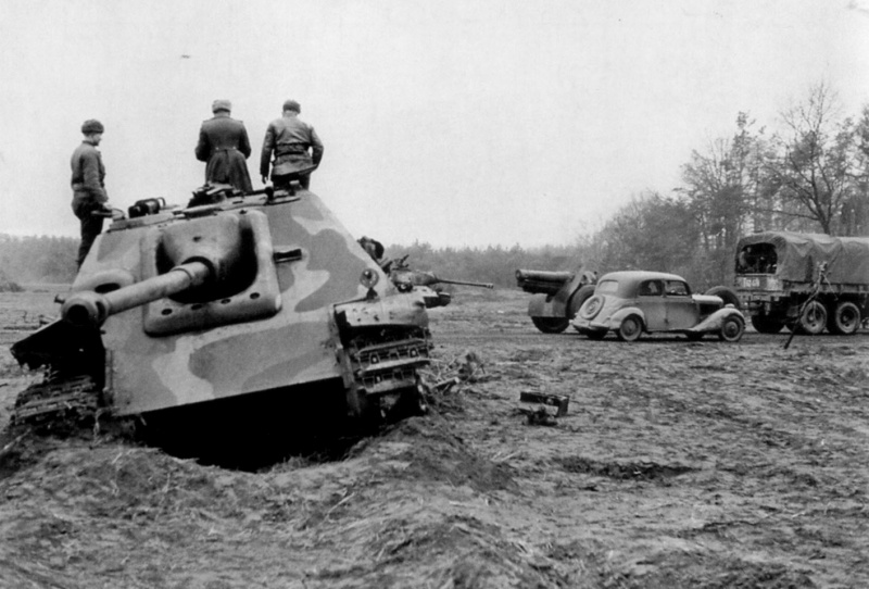 4)Советский офицер осматривает подбитую в Восточной Пруссии немецкую САУ «Ягдпантера» (Sd.Kfz.173 Jagdpanther). Справа — штабная машина у грузовика артиллеристов с 122-мм гаубицей образца 1910/30 годов, на дальнем плане подбитый советский танк ИС-2. 3)Немецкая тяжелая САУ «Ягдпантера» (Jagdpanther) из 654-го батальона истребителей танков, подбитая американскими танкистами в Харгартене (Hargarten) 2)Немецкая САУ «Ягдпантера» (Sd.Kfz.173 Jagdpanther), подбитая артиллерийским огнем 6-го противотанкового полка королевской армии Канады в районе Райхсвальд (Reichswald). 1)Немецкая тяжелая САУ «Ягдпантера» («Jagdpanther»), уничтоженная в результате воздушной атаки вблизи Альтенкирхена.