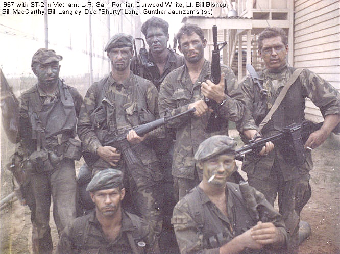 По вооружению группы Navy SEAL были впереди планеты всей - использовали как опытные образцы, так и кастомизировали уже имеющиеся: 1. CAR15 - первое поколение карабинов на базе М16 2. XM177E2 с подствольным грнатометом - нижняя половина цевье снимается, во Вьетнаме такой кастом позволяли себе только бойцы SOG и SEAL. Здесь установлен экспериментальный ХМ148 3. XM177E2 с М203 4. Дробовик «Ithaca M37» с насадкой «Утиный клюв» - обеспечивал разлет картечи в горизонтальной плоскости. У итаки 37 было еще одно преимущество перед другими помпами – огонь можно вести не отпуская спускового крючка, просто пеердергивая цевье. 5. Mk24 Mod-O – Пистолет пулемет «Smith & Wesson» с глушителем – редкий экземпляр, в серию не пошел. Чаще использовали шведский Carl Gustaf (M45, «шведиш К»). 6. Mk23 Ручной пулемет из комплекса «Stoner 63» - все опытные образцы проходили полевые испытания именно в группах SEAL. Это был первый образец стрелкового комплекса, который можно было использовать как штурмовую винтовку, с магазином на 35 патронов, или как ручной пулемет, с ленточным питанием из короба (как на фото). 7. Тот же «Stoner 63» в режиме штурмовой винтовки – во Вьетнаме практически не засветился. О надежности магазина говорит тот факт, что в отличие от самой стрелковой системы он до сих пор используется в штурмовых винтовках «Galil» и ее клонах. 8. Кастомный пулемет «Death Machine» (но же China Lake Code System23) – в девичестве М60, со ствола сняты сошки вместе с муфтой, ствол обрезан под газоотвод (причем прицельные приспособления не перенесены), приклад с заменен с «акульего хвоста» на вертолетный, использована авиационная пружинная лента и патронный короб (позаимствованы у «door gunner» с хьюи), в качестве переноски используется рама от «light weight» рюкзака. 9. Помповый гранатомет EX41 – попытка соединить гранатомет М79 с помповым ружьем, на деле тяжеленная (около 8кг) хреновина на 3 заряда. Не прижился. 10. Первый американский «автоматический» гранатомет Мk 18 – использовал ленточное питание и мог стрелять очередями, но механизм подачи боеприпасов приводился в действие стрелком (нужно было вращать ручку справа). Использовался на лодках и катерах. Впоследствии был вытеснен экспериментальным автоматическим ХМ175 (с «тушкой» от пулемета М2 НВ).