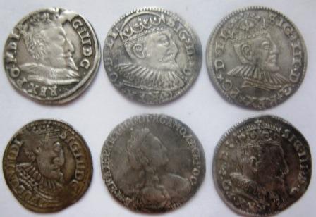 Четвертая монета отчеканен на монетном дворе г. Олькуш в 1599 году. Все трояки на фото чеканились при Сигизмунде III.