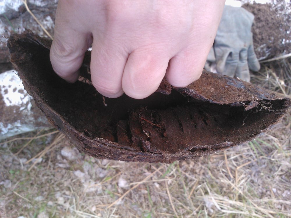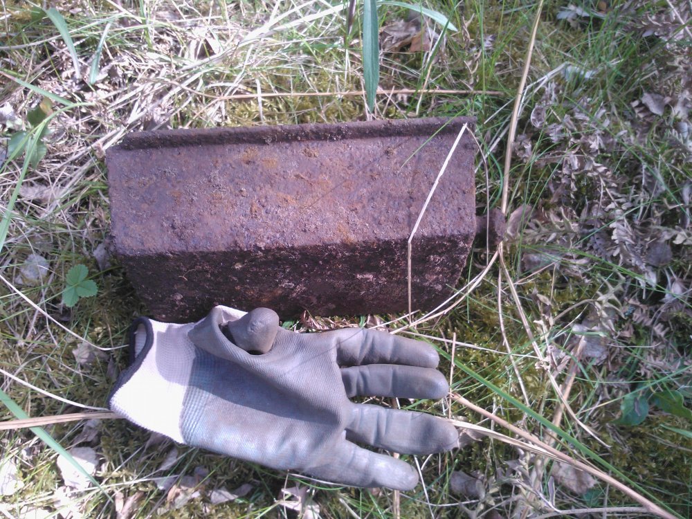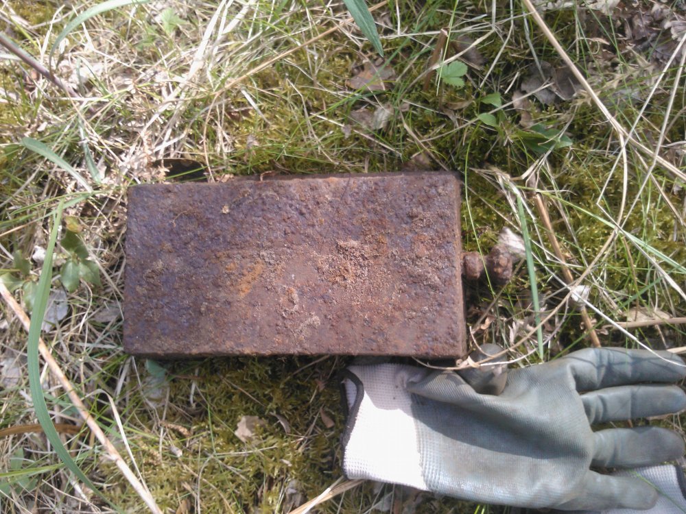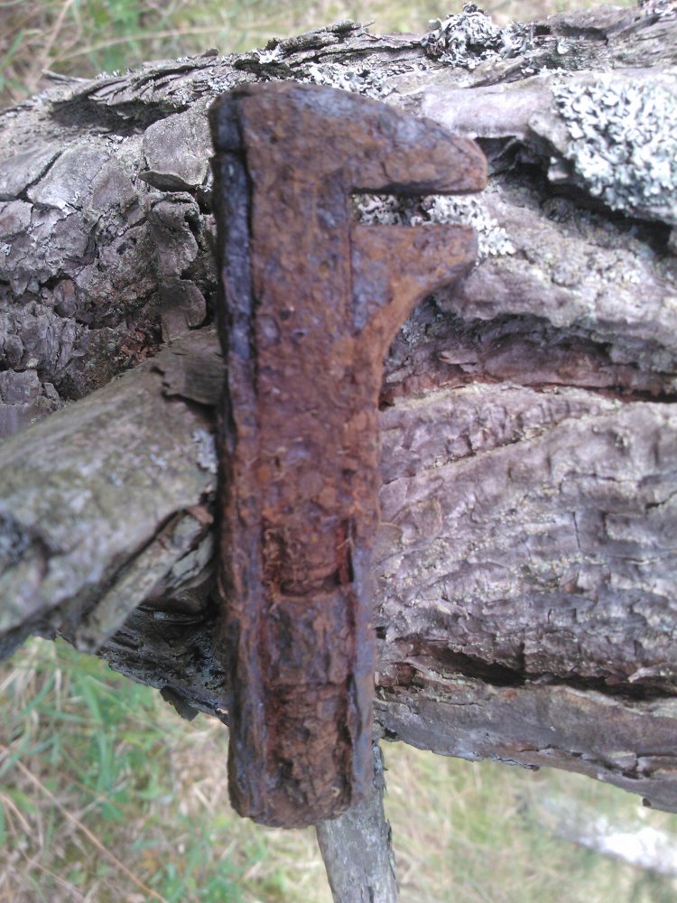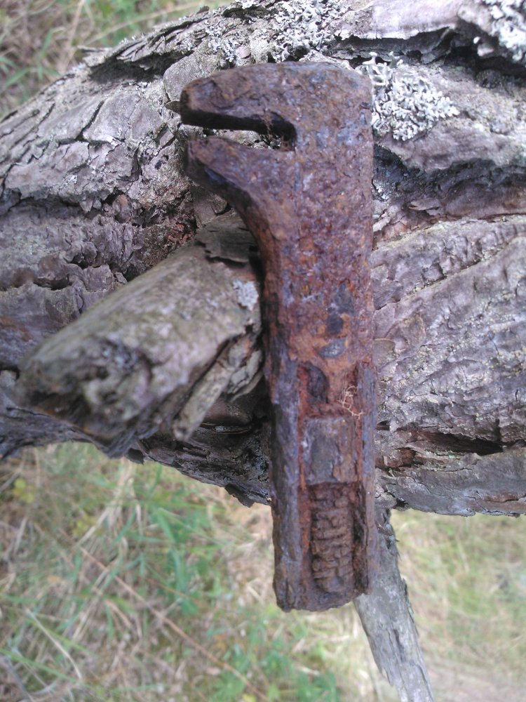 Такая разбитая ванночка с ручкой, говорят для выпечки буханок хлеба. Так ли? Сильно убитый разводной ключ. Чей? И какой-то колпак с прорезями. Внутри что-то странное было. На последнем фото.