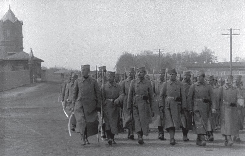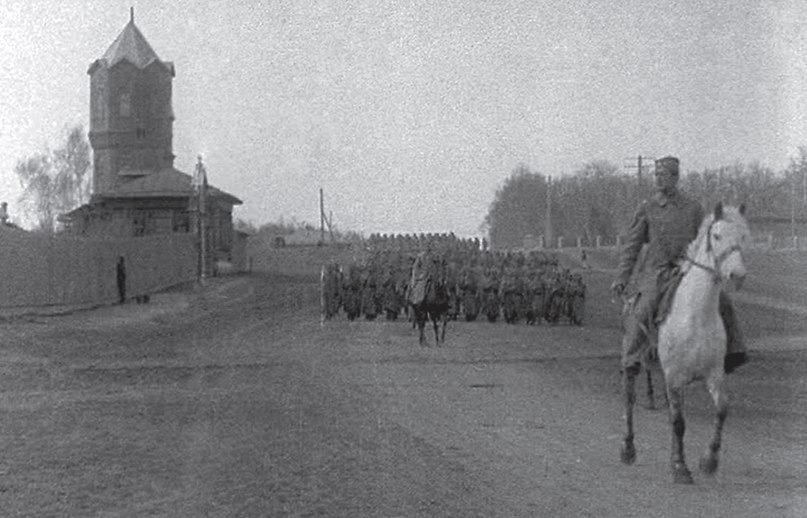 Торжественное прохождение частей полка им. майора Благотича по ул. Уфимской (ныне "ул. Воровского") по случаю приезда в Челябинск ген. М. Жанена. Впереди— капитан В. Павкович, командир полка (погиб от рук своих в Сибири).