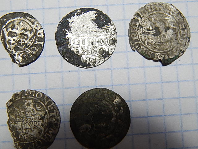 1 фото: 1 - півгріш коронний, Станіслав Август, 176? 2 - солід литовський, Сігізмунд 3, 1623 3 - солід коронний, Сігізмунд 3, скоріш за все 1622 чи 23 років 2 фото: 1 - півгріш коронний, Ян Ольбрахт 2 - гріш коронний, Сігізмунд 3, 1627 3 - півгріш литовський, Сігізмунд 1, здається 1511 4 - півгріш литовський, Сігізмунд 2, 1558 5 - коронний півгріш, Сігізмунд 1 чи Олександр Ягеллон. Фото поганеньке, важко розгледіти