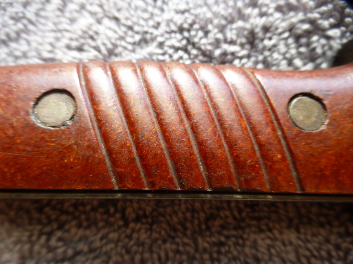 Я вижу оригинальный штык в отличном (если можно так выразиться, учитывая характерную финишную обработку)состоянии. По комплектности с ножнами - соглашусь с Дмитрием : непонятно. Хотя, кто его знает как там было на производстве к концу войны (однако, списывать все огрехи на "ускорение и удешевление" тоже не стоит).