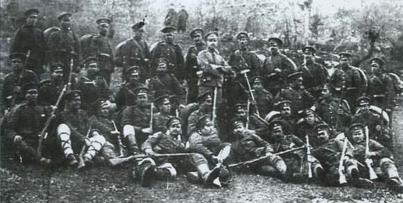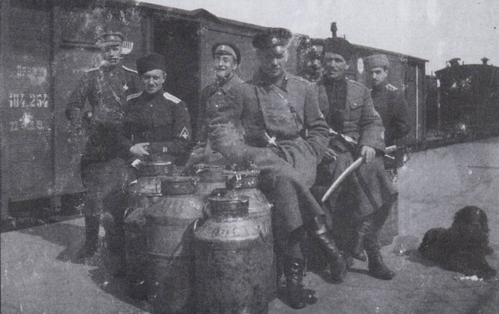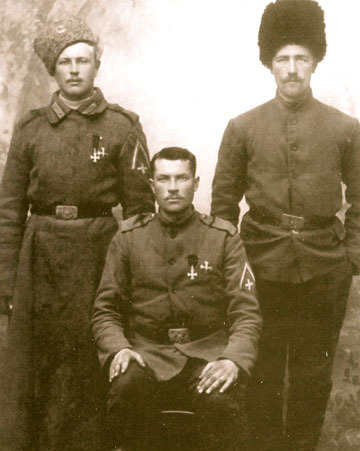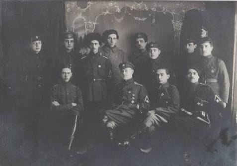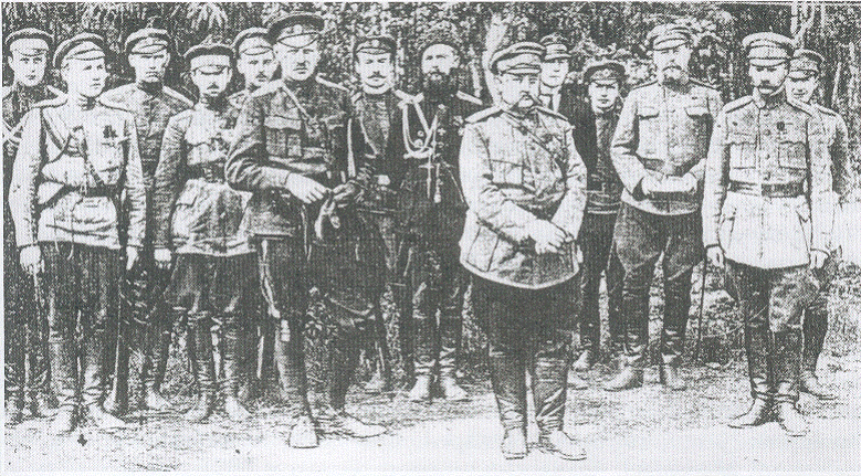 Сидят (справа налево): ротмистр Б.С. Пермикин (крайний справа); подполковник С.Н. Булак-Балахович; генерал-майор А.П. Родзянко; подпоручик Менгден ; ротмистр Ю.Н. Булак-Балахович ; поручик В. Видякин ; штабс-ротмистр Ефремов. Нарвский железнодорожный вокзал, апрель 1919 г.