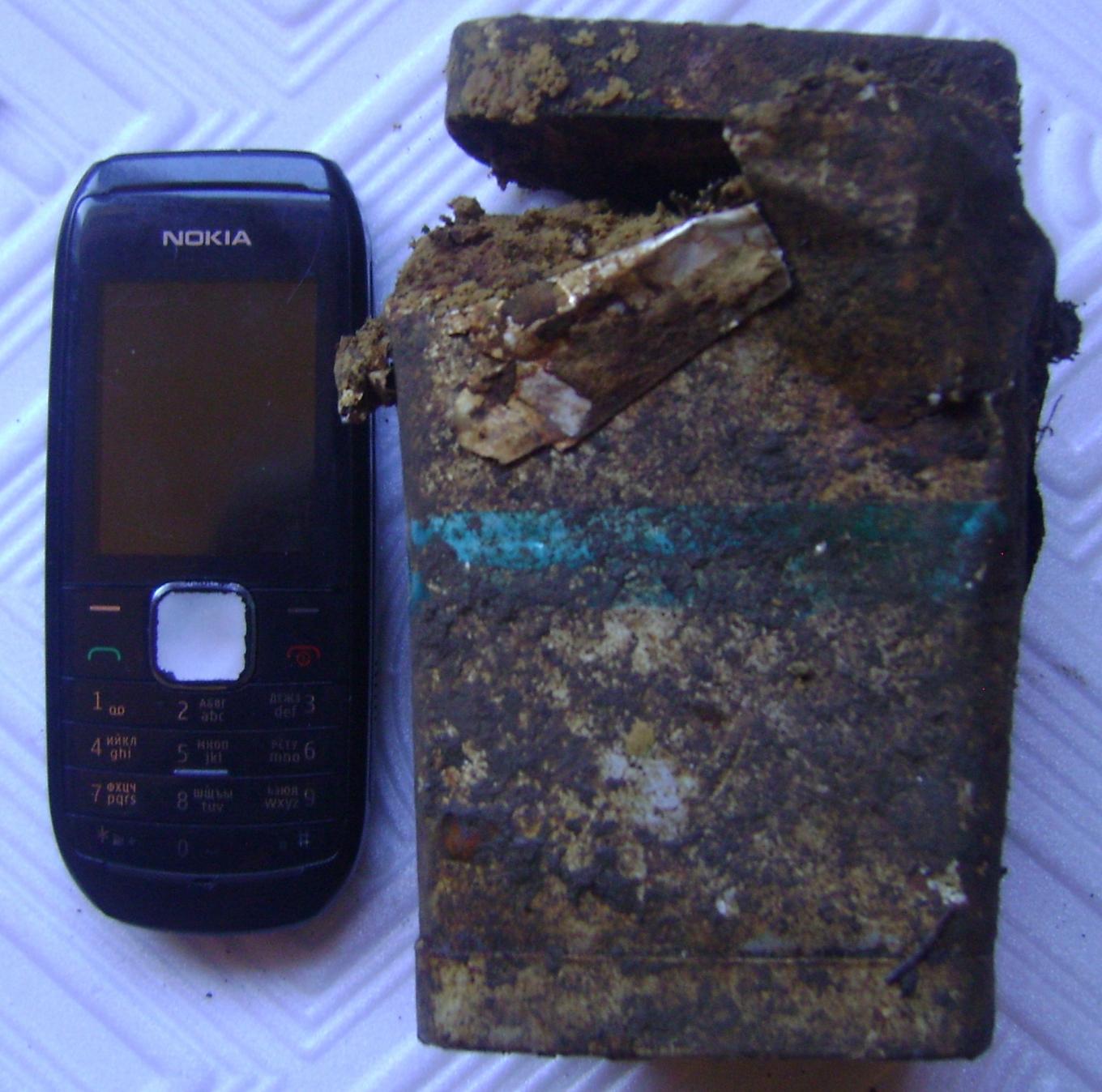Щоб не плодити нових тем вирішив підняти стару. Суботня знахідка. Над крутим схилом гори кілька окопів. Судячи з усього - це РІА періоду першої світової. Спочатку попалась гільза манліхера 8х56, потім одна за одною зявилися три трубки. Поки не знайшов найбільшої було враження, що солдати щось майстрували з гільз. Але найбільша трубка явно не ручного виробу. Можливо погано видно на фото, але вона має з однієї сторони 4 ряди по два круглих отвори (діаметром 2-2.5 мм) і один прямокутний отвір. Всередині трубки - перегородка випуклою стороною до кінця трубки з отворами. В перегородці круглий отвір діаметром 1-1.5 мм. Матеріал - напевне латунь. Діаметр довшої трубки приблизно 15мм двох інших - 16 мм. Найдовша трубка щільно входить в найкоротшу, та очевидно і в середню за розмірами (середня деформована). Окрім того кружечок такої ж товщини, як і трубки діаметром близько 16мм - точно перекриває по діаметру середню і малу трубки. Довжина найдовшої трубки 46 мм двох інших відповідно - 32 і 17 мм. На середній трубці є три пояски - одинарний за 2-3 мм від краю і два разом приблизно посередині. Разом знайдені також гудзик (на фото) і монета 5 грошей (Росія для Польщі) 1820 (останню цифру видно погано) року. Зацікавило що це може бути і якого періоду.