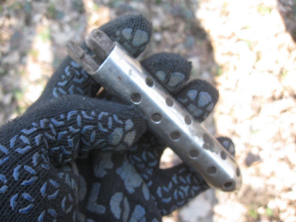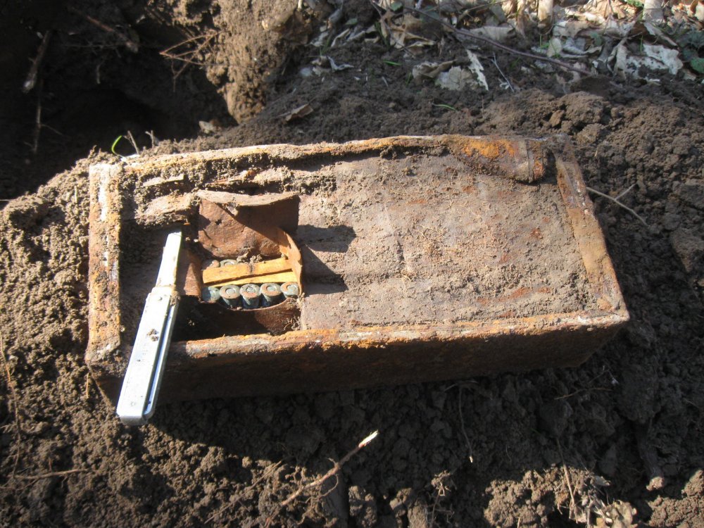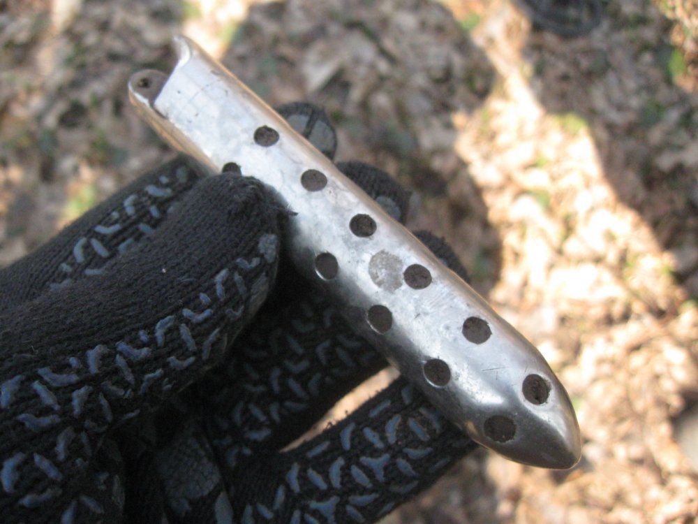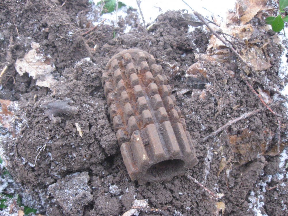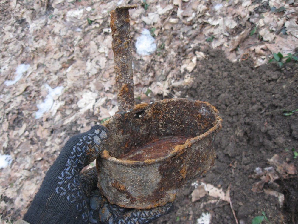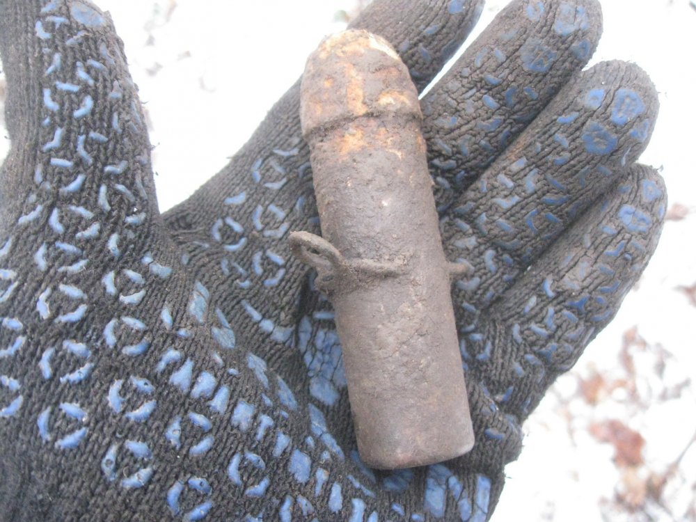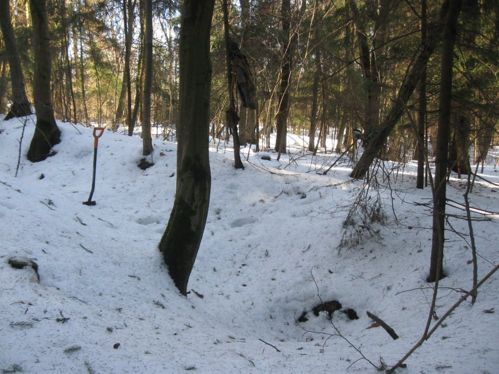 С утра, пока был избыток силы, мы попробовали удачи в вскрытии не докопанных осенью позиций. После часа землеройных работ, накопав пол ведра стреляных гильз и кучи колючки, это занятие было решено оставить к весне :) По находка в этот день было не густо, но чем богаты - тому и рады ...