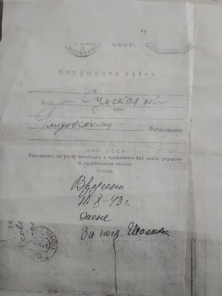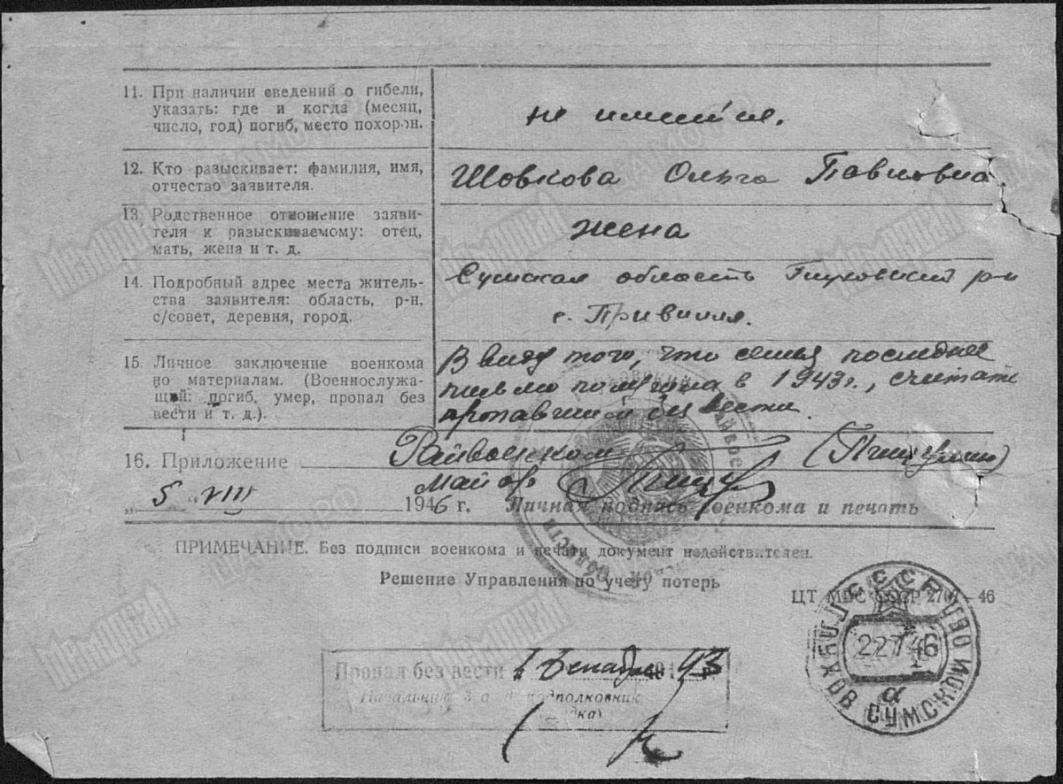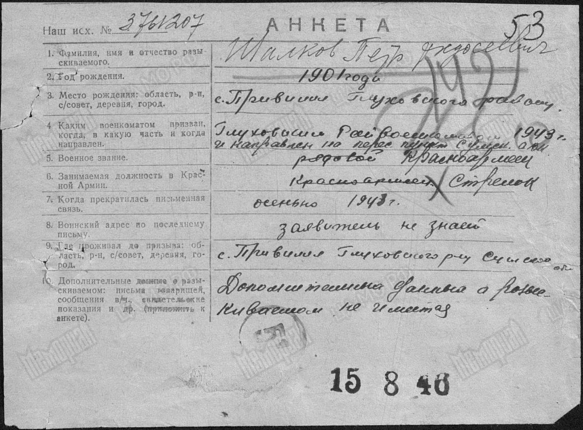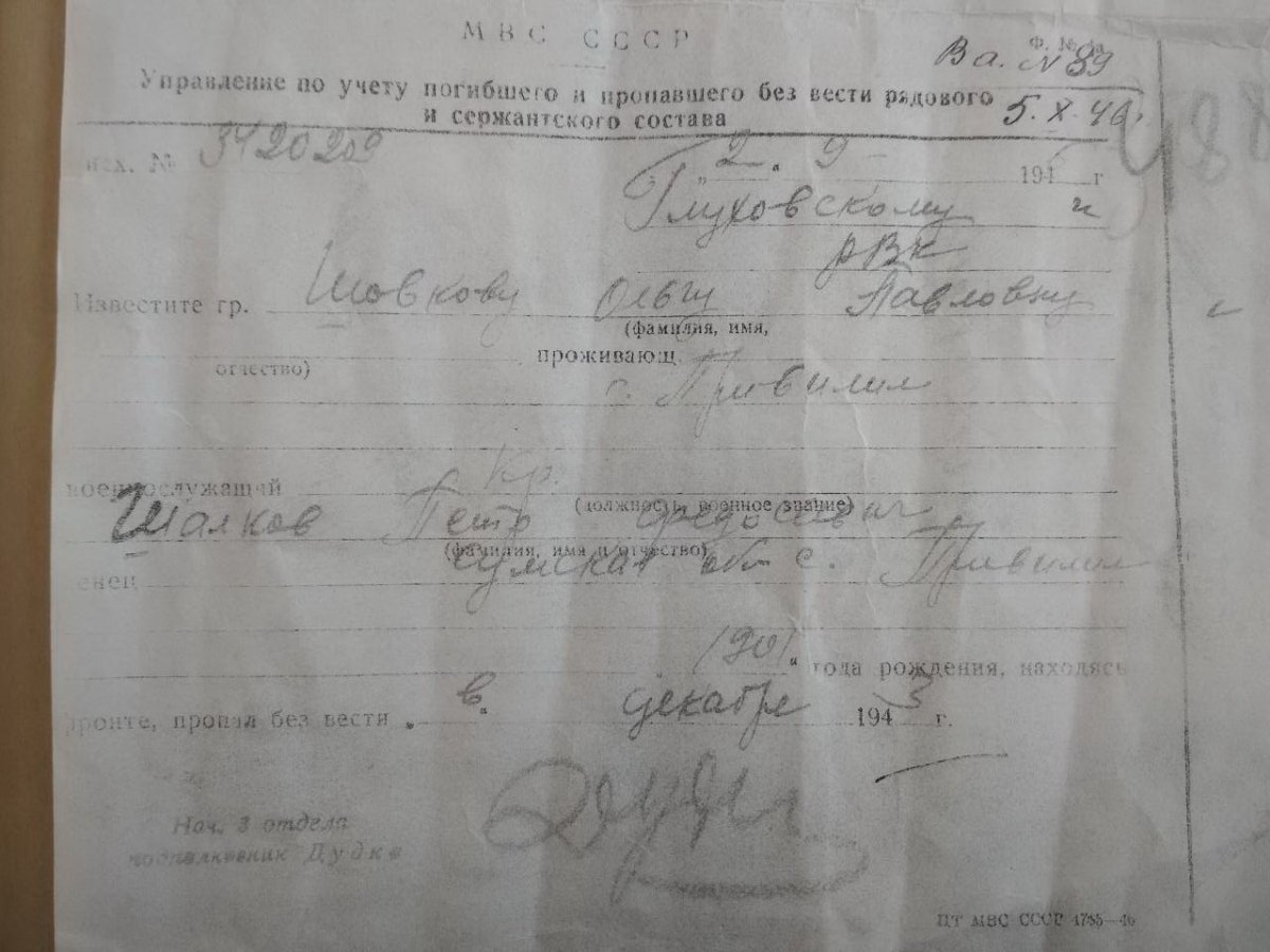 Помогите пожалуйста найди деда, пропал без вести, во всех документах которые смог найти он Шалков Петр Федосеевич, а должен быть "Шовков", так как жена была Шовкова, и мать, дети. Все документы которые есть, прилагаю. Фамилия Шалков Имя Петр Отчество Федосеевич Дата рождения/Возраст __.__.1901 Место рождения Украинская ССР, Сумская обл., Глуховский р-н, с. Привилил Дата и место призыва __.__.1943 Глуховский РВК, Украинская ССР, Сумская обл. Воинское звание красноармеец, рядовой Причина выбытия пропал без вести Дата выбытия __.12.1943 Название источника донесения ЦАМО Номер фонда источника информации 58 Номер описи источника информации 18004 Номер дела источника информации 2253
