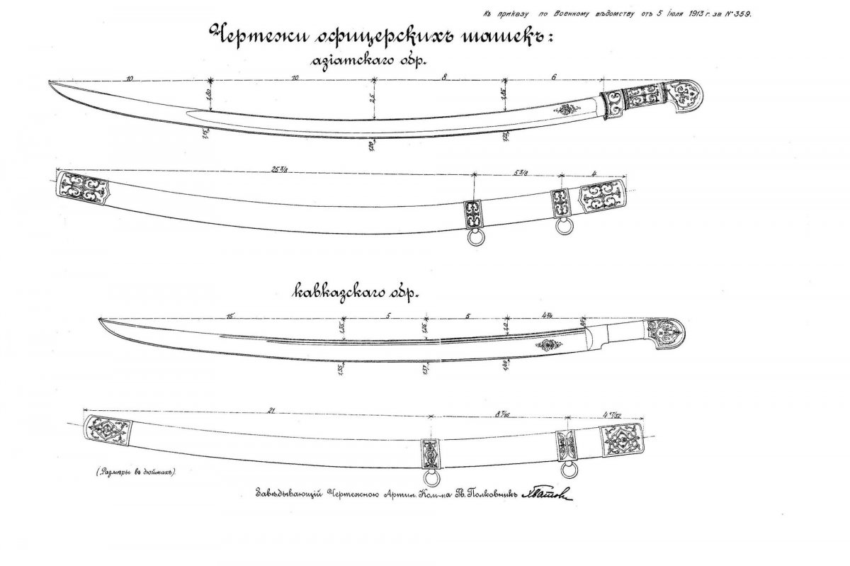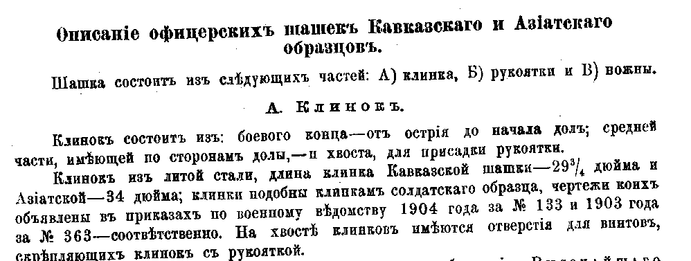 Дим, это обычная тафтология того времени, по поводу, что в приказе обозначили Кавказского типа Азиатским. Вы вообще говорим о форме клинка.. Вот две шашки, на которые опираются при описании шашек офицерских обр 13 года.. Первая-для НЧ АЗИАТСКОГО ОБРАЗЦА 1834 года.. И вторая Кавказского обр 04( И опять в приказе ОШИБКА!!! Не было Кавказского обр для НЧ.. Шашка была принята, как образец для всех и НЧ и офицеров"" ) Каждый и НЧ и офицер мог ее украшать серебром, в зависимости от тяжести кошелька.. Теперь . надеюсь , понятна разница клинков Азиатского и Кавказского образца..