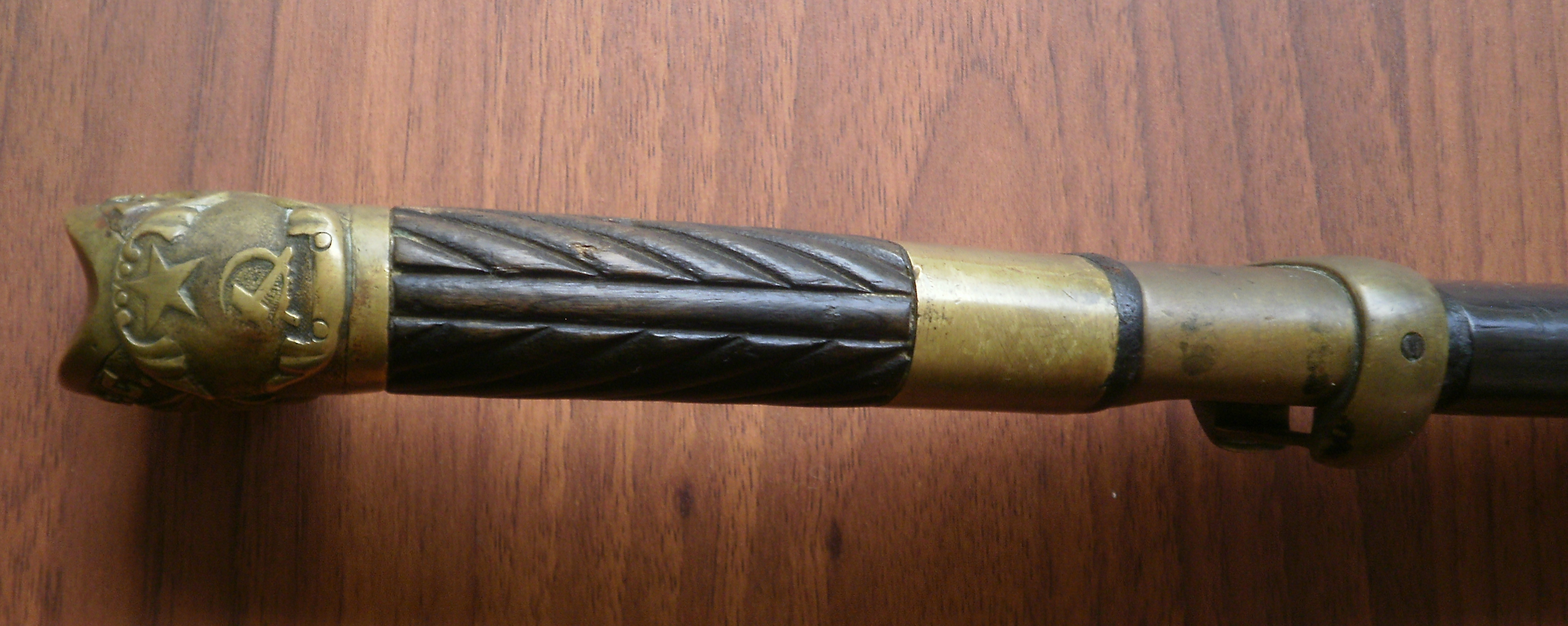 Получаеться тогда, что кто то недавно переставил( поставил) неправильно гайку, при этом состарил винты дабы это скрыть. Полнейший абсурд Ножны с рогожи, я не говорил что кожаные. Шашка образца 1927 года имеет стальной однолезвийный клинок незначительной кривизны с одним широким долом с обеих сторон. Боевой конец двулезвийный. На пяте клинка имеется клеймо производителя (варьируется в зависимости от времени производства) и контрольное клеймо. Эфес состоит только из рукояти без защитной дужки и повторяет форму рукояти казачьей шашки РИА для нижних чинов образца 1881 года. Деревянная рукоять имеет продольные наклонные желобки, с латунной головкой и втулкой (в некоторых случаях белого металла), на которой также имеются клейма. Головка раздвоенная с отверстием для темляка, украшена изображением пятиконечной звезды, серпа, молота и аббревиатуры «C.C.C.Р.». Ножны изготавливались из грунтованного дерева и обтягивались в разные периоды кожей, рогожей, кирзой (прорезиненным материалом) или просто шлифовались и красились. Латунный прибор (в некоторых случаях белого металла) состоит из устья, гайки и наконечника. Шашка принята на вооружение рядового и командного состава кавалерии РККА, в других родах войск - лиц рядового и командного состава, несущих службу верхом. С 1932 года шашка носилась только при нахождении в строю.