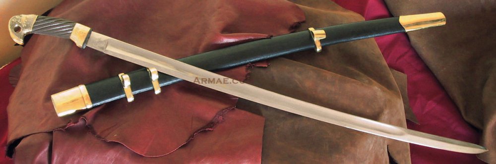 Хозяин данной шашки, пошёл немного дальше, "добивал" клейма, поменял рукоять из пластика на деревянную и застарил немного латунь...