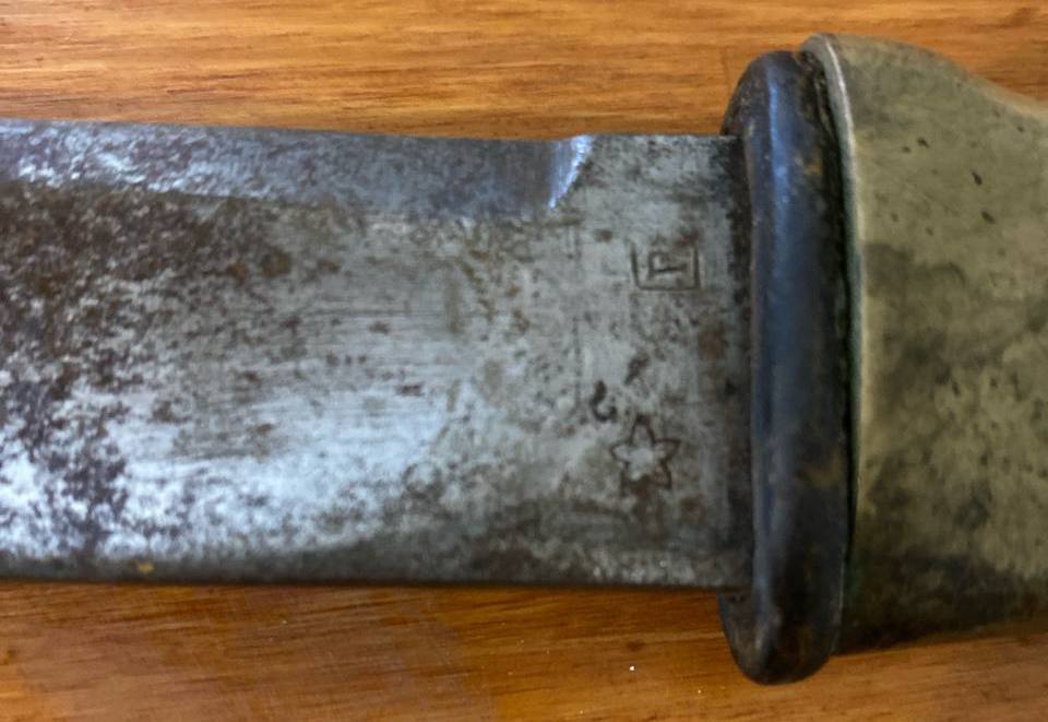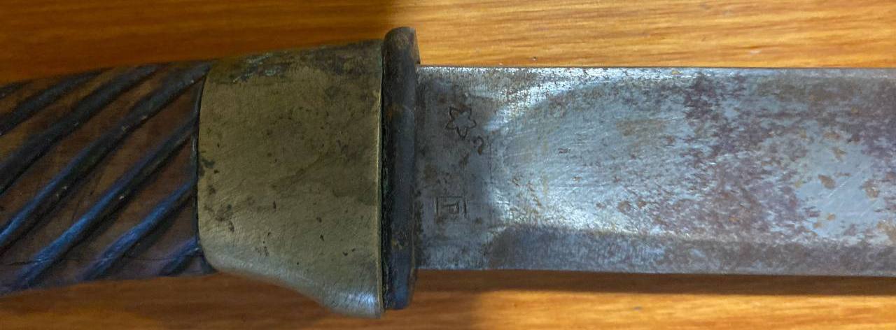 Доброго! На Саммлері з таким клеймом визначали колись як ОВРЗ. Ніби як було два варіанта клейма (чи відповідає дійсності, х.з.) С началом Великой Отечественной войны производство шашек было организовано и на других предприятиях СССР: Орджоникидзевский вагоноремонтный завод им. С.М. Кирова (ОВРЗ) — единственный подтвержденный документально производитель помимо Златоустовского завода. С октября 1941 по июнь 1942 года завод изготовил 69 тысяч шашек. Шашки ОВРЗ имеют клеймо «ВРЗ». Тамбовский вагоноремонтный завод — выпустил опытную партию шашек (по разным оценкам от 150 до 500 клинков) к началу 1942 г. Особенности: суррогатная арматура, нехарактерный наклон рукояти в сторону лезвия и клеймо в виде цифры между «ушами» головки рукояти. Согласно различным источникам, в годы войны шашки также производились на следующих предприятиях: Завод «Пожарпром» в Краснодаре; Завод им. Седина; Завод им. Калинина; Трест «Майкопнефтекомбинат»; Завод промкооперации «Красный металлист» в г. Гуляйполе (УССР); Зыряновский свинцовый комбинат (КазССР). З повагою,