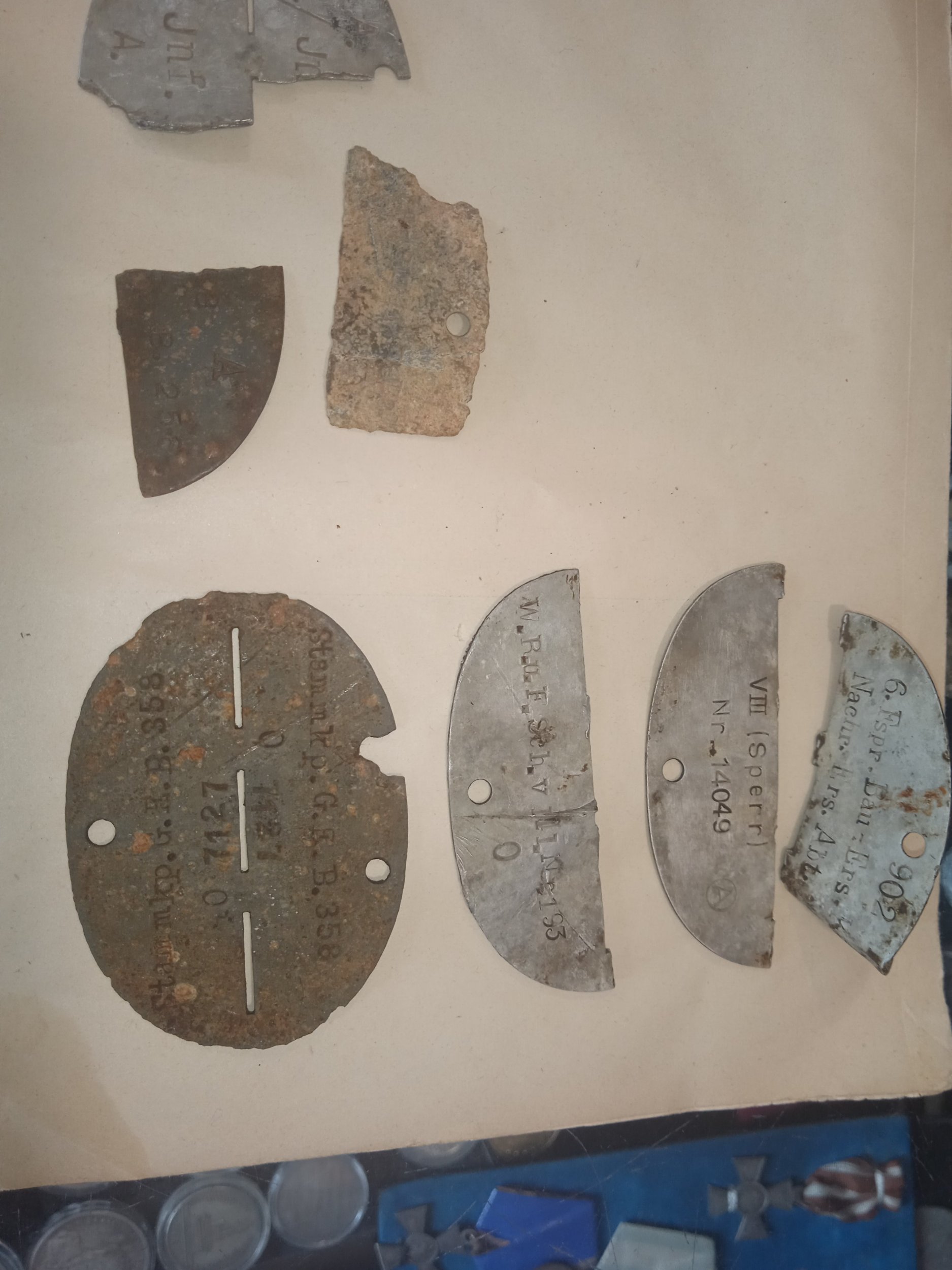 Запчасти с противогазов,мятые МГ- шные Патрик,мятые газ баки,части с обозной техники,части шлемов ....и куча жетонов разных мастей и служб подразделений.
