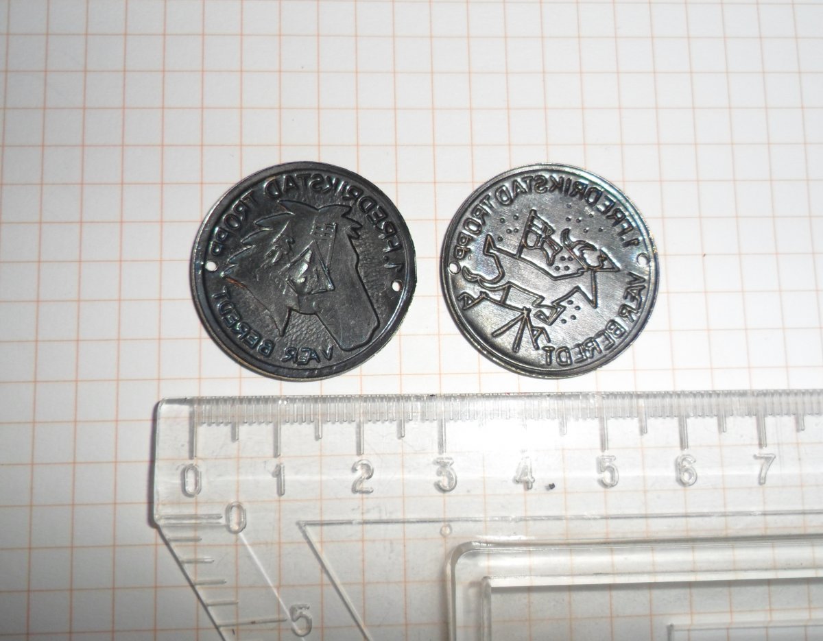35. Два норвезькі скаутські пришивні значки (металеві нашивки) Першого загону Фредрікстада (1. Fredrikstad Tropp), містять девіз "vær beredt" (бути готовим). Покриття посріблене. Ціна Продано!