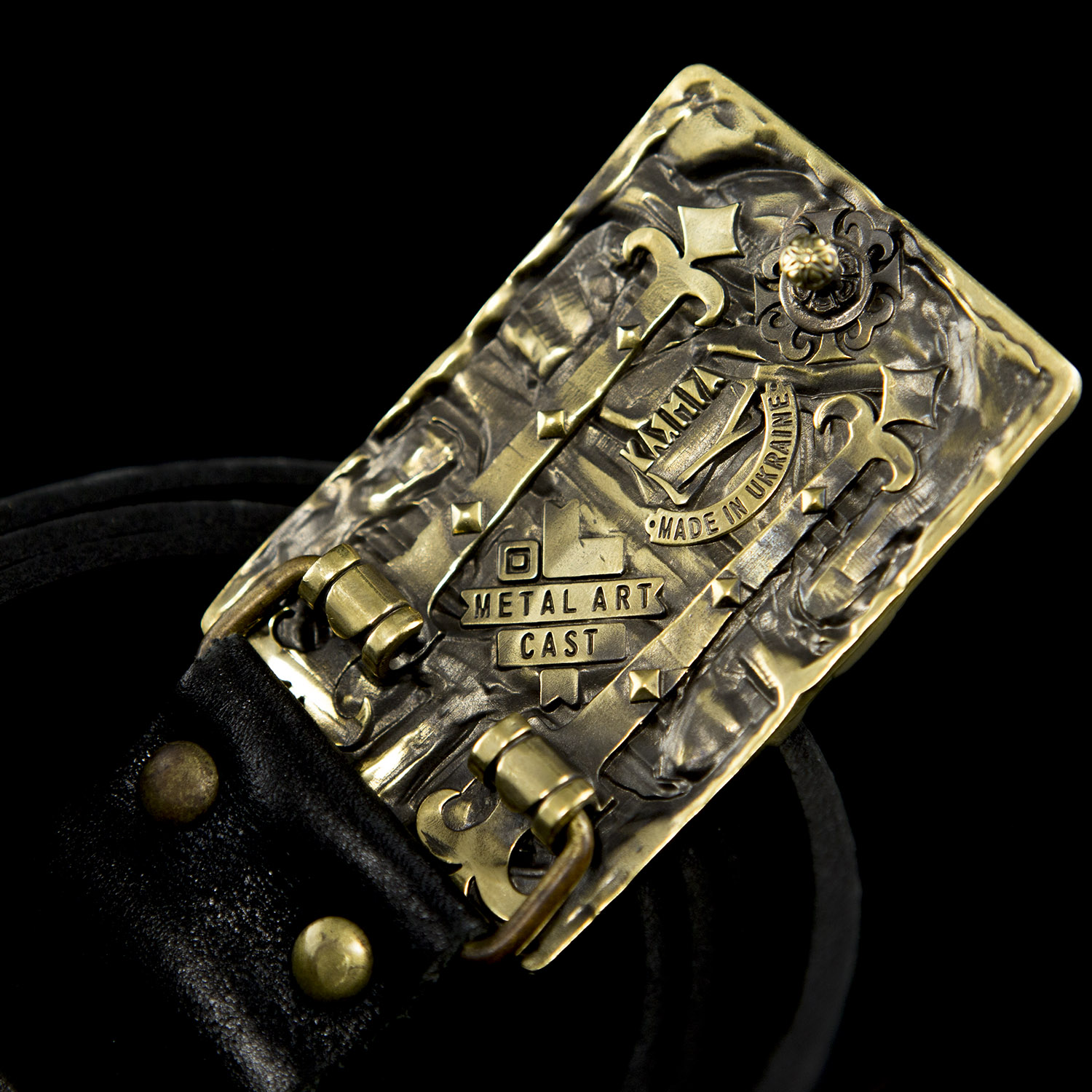 ШКІРЯНИЙ РЕМІНЬ "КОВАНИЙ" Створений в продовження серії пряжок з традиційними українськими орнаментами. Для текстури пряжки запозичили техніку ковальства, за основу малюнку взяли давній символ «триріг» чи «круторіг». Один із найстаріших символів сонця, а також знак святого числа "три". Вписаний в сакральну форму яйця, цей орнамент символізує неперервний рух сонця (зима, весна, літо, осінь) і вічність. До ппряжки, через планку кріпиться шкіряний підпряжник, з’єднаний до самого ременя гвинтом, що дозволяє легко вкоротити пасок. Пасок виготовлений з натуральної шкіри. РОЗМІР: Розмір пряжки 85х63 мм. Довжина паска 120 см. Все буде Клямра! 950грн.