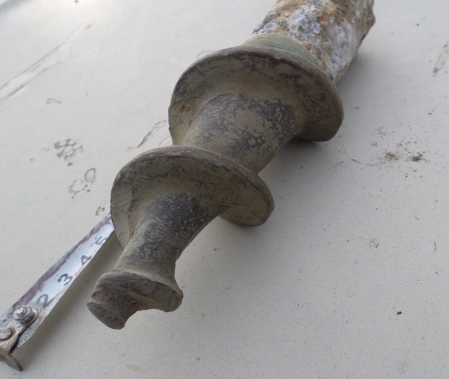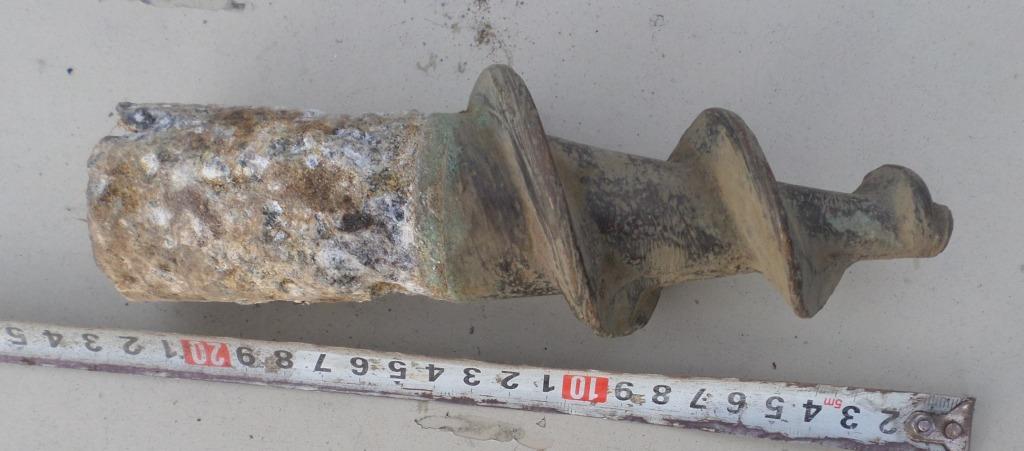 Вітаю. Отакий шнек знайдений в лісі. Матеріал шнека - бронза, латунь... Насаджений на алюмінієву? трубу. А от від чого - не придумав.