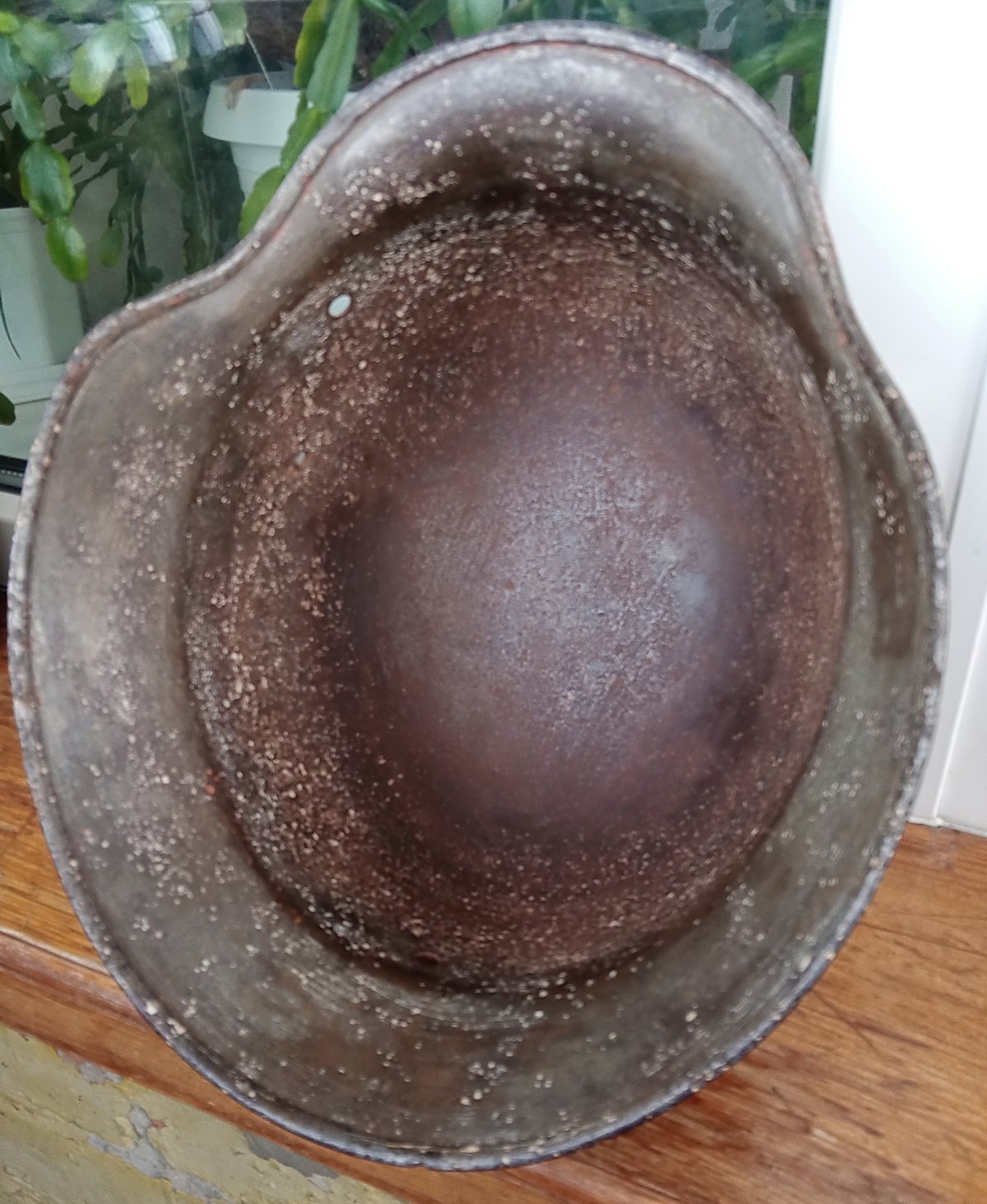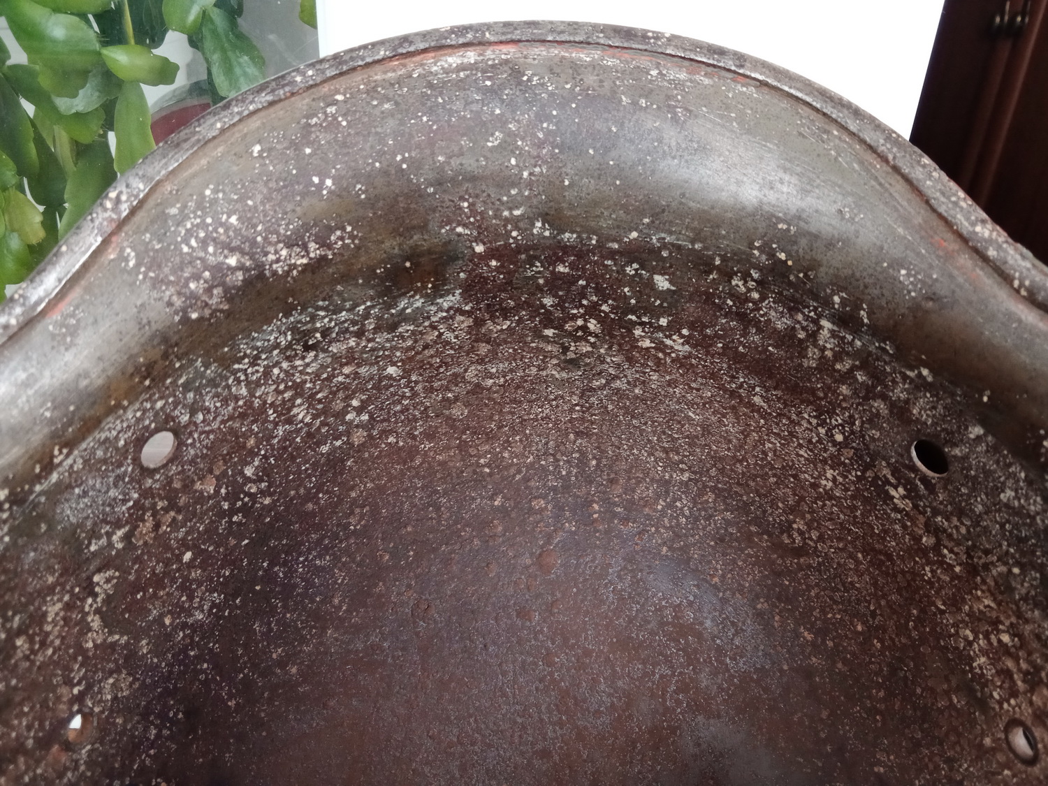 Вітаю Шановне Панство! Прошу оцінити для подальшого продажу. М35 ЕТ64 партія 4284 1939 року випуску. Шолом ремонтний,підшоломник був замінений на оцинковку. Зовнішній обруч рідний ,пофарбований. Як показав час,не надто ретельно зачищений. Внутрішній і шкіра-репліка. Свищів немає. Дякую!