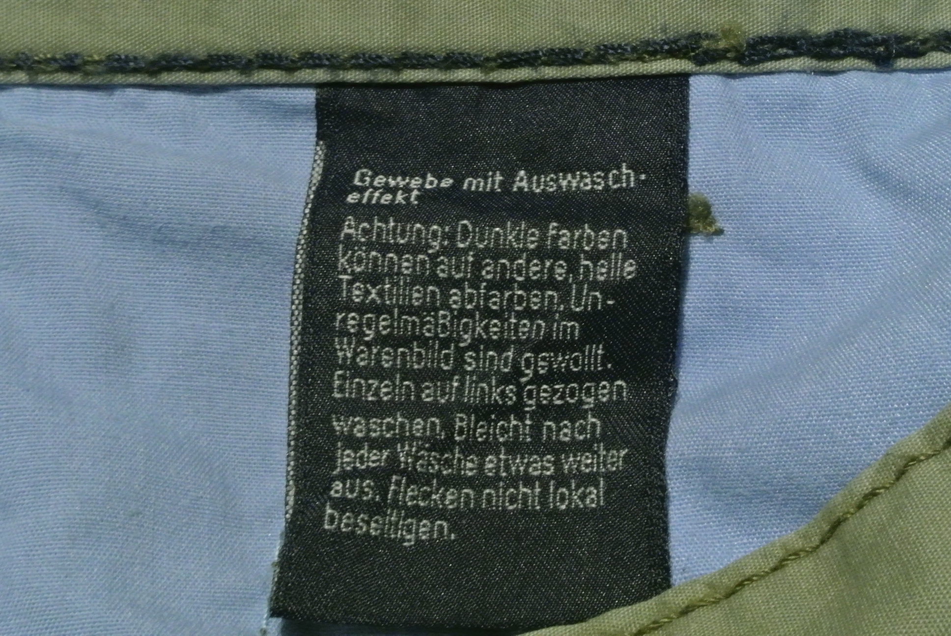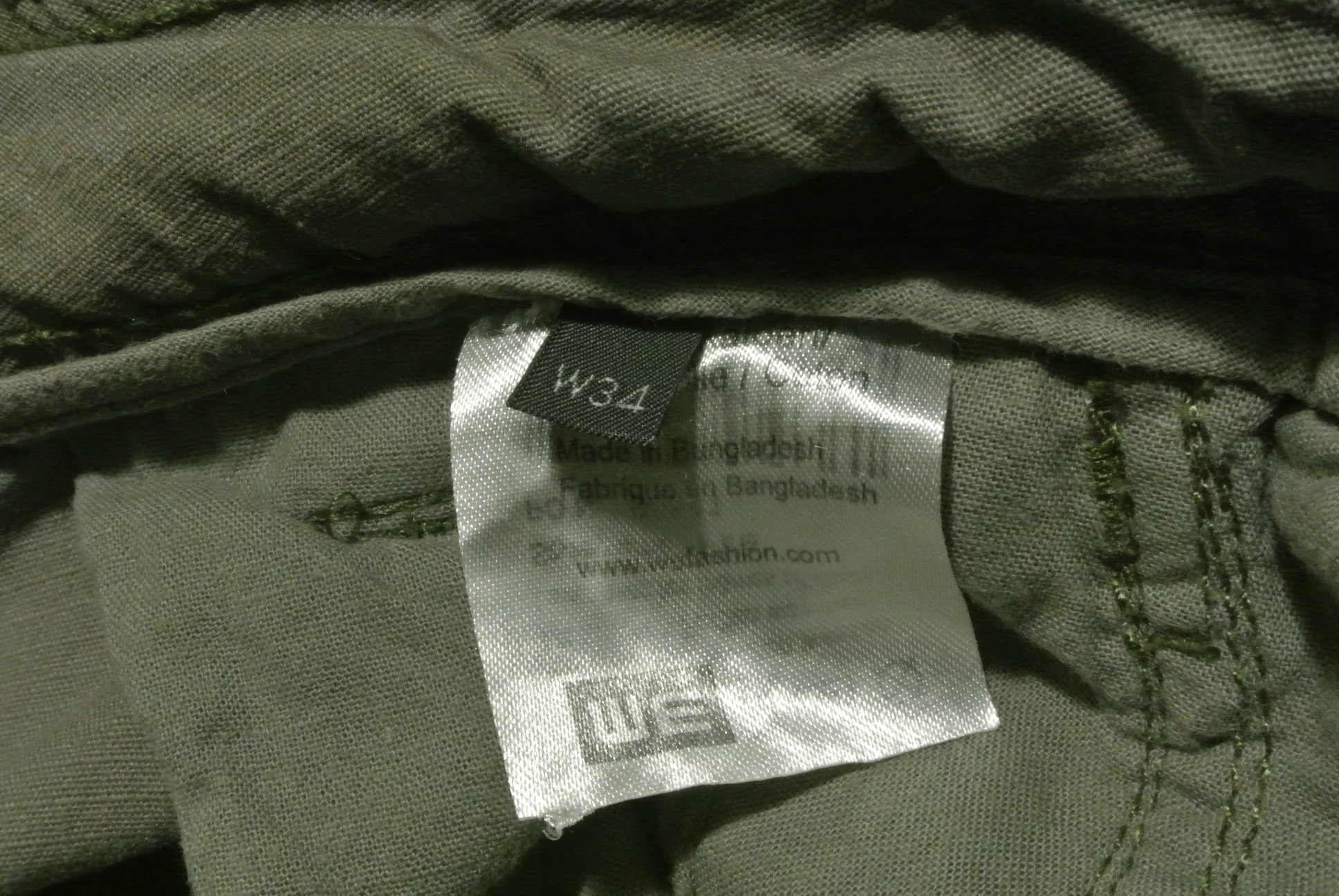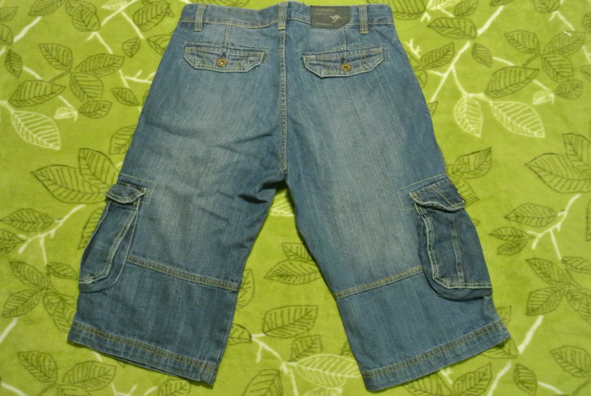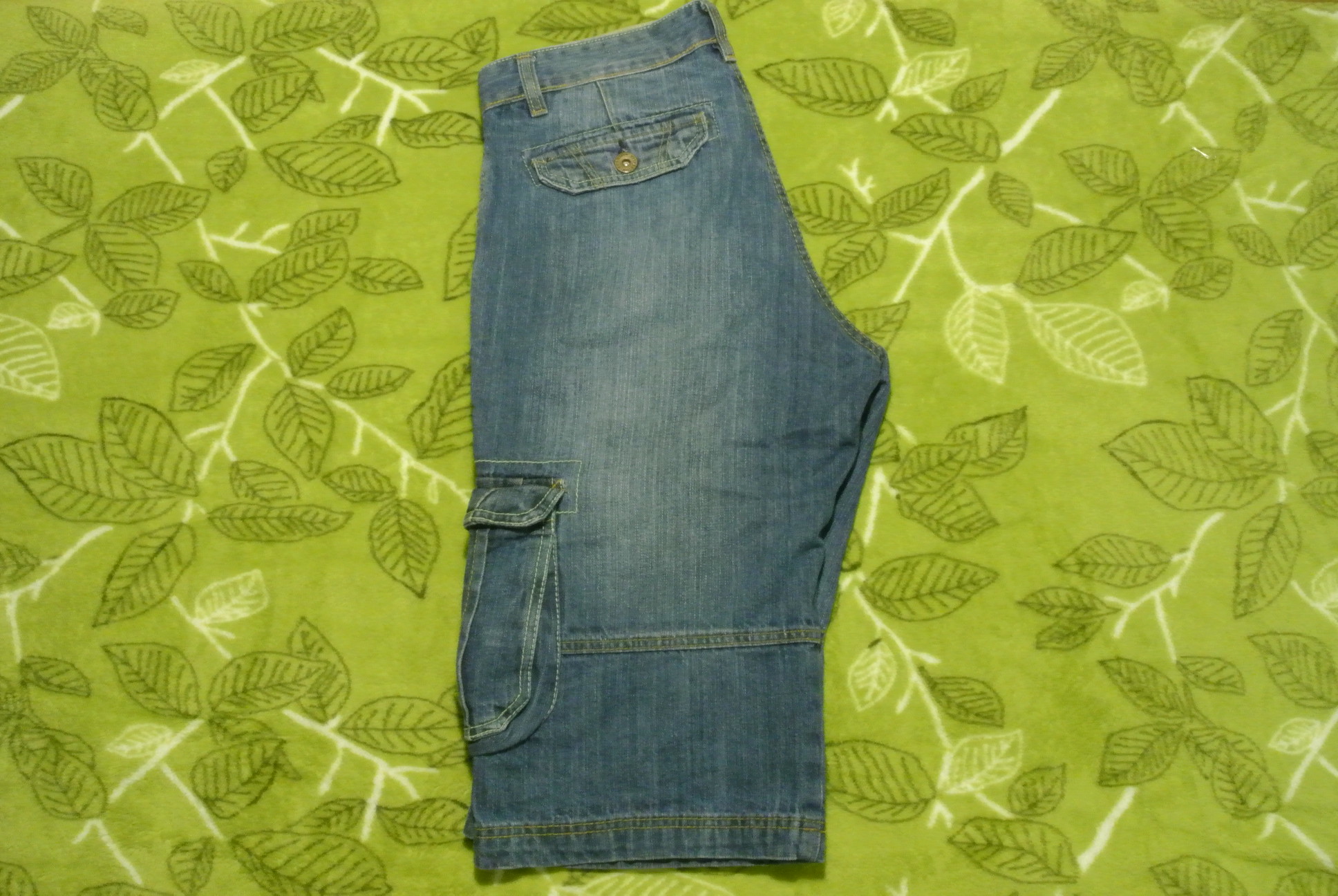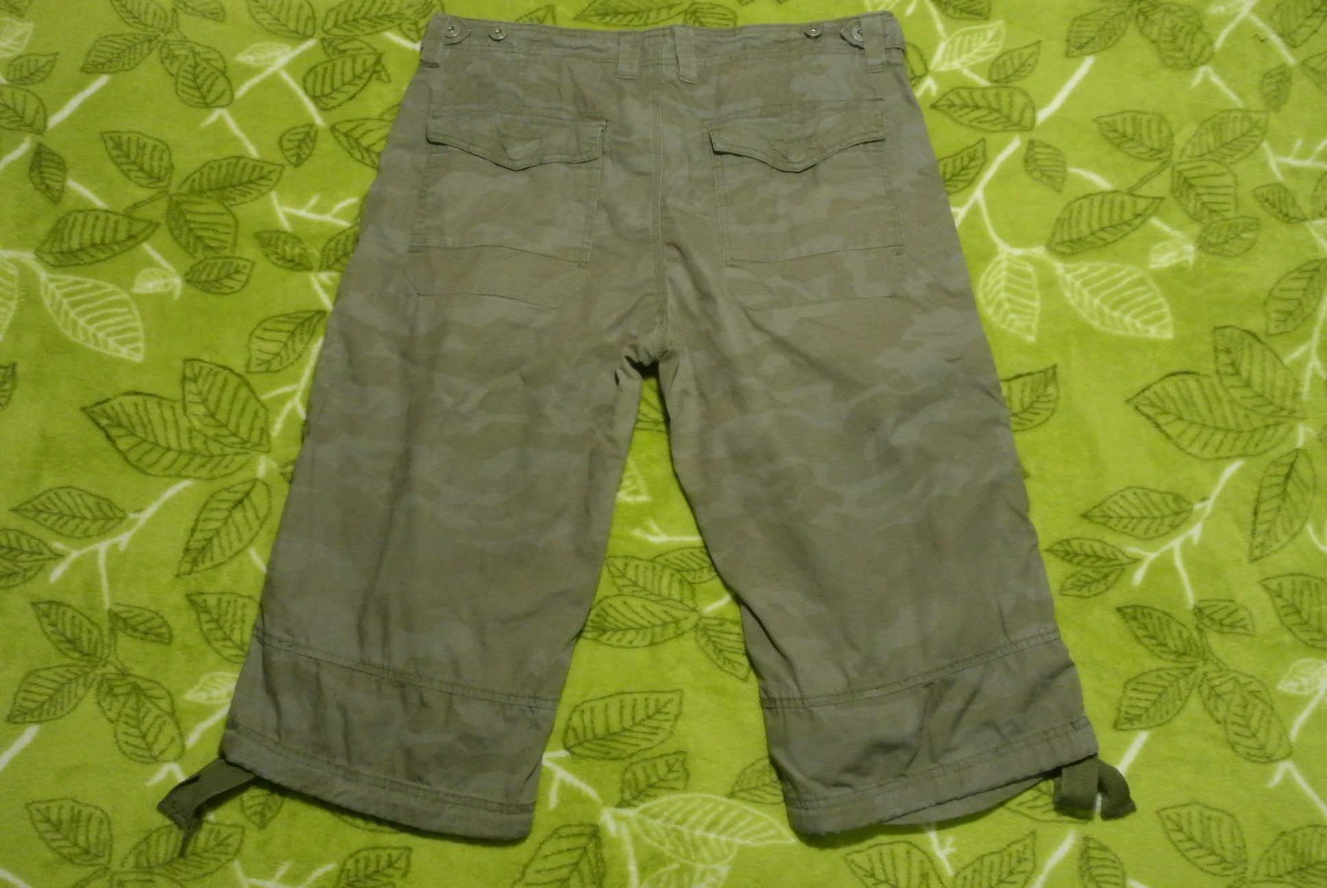 Розмір W 34. Мають зовні чотири кишені. Утяжки знизу штанин та утяжки попереку на гудзиках.