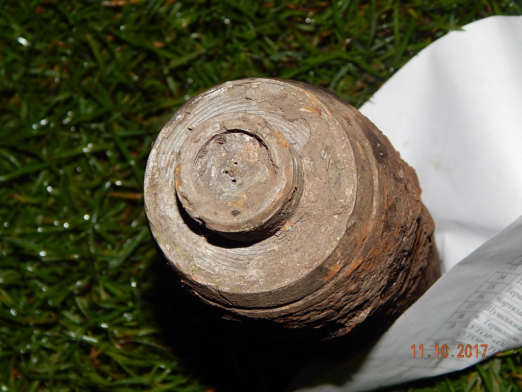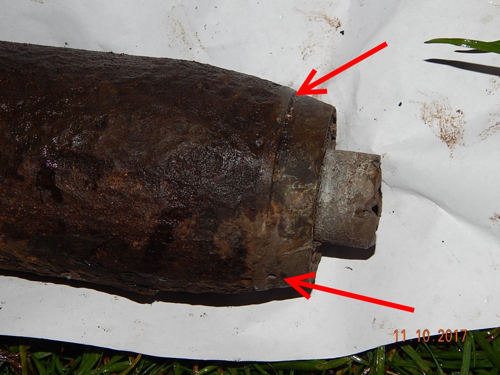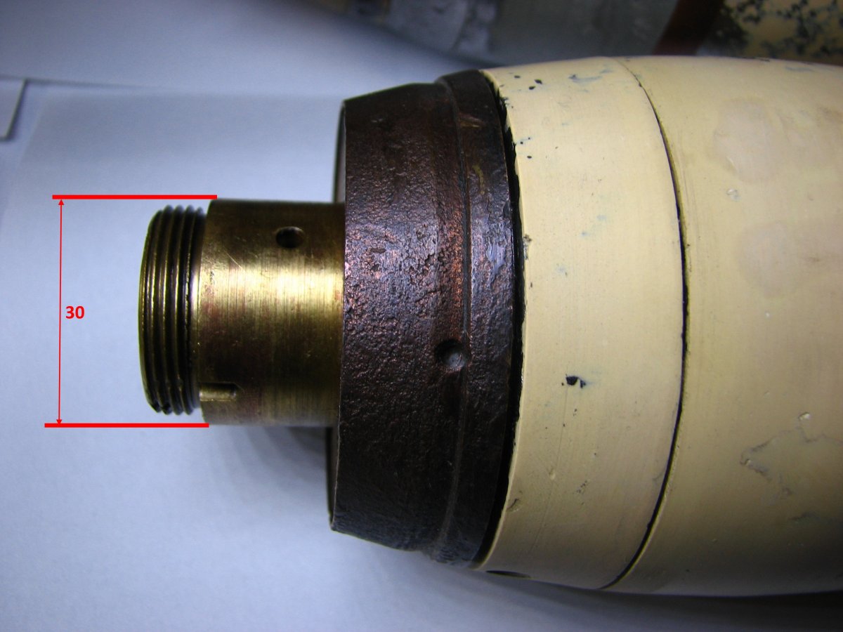 Наконец дошли руки до ответа. Вот универсал и шрапнель с размерами для сравнения. Для 8 cm M14 характерен уступ, куда насаживался защитный колпачок и наличие точек его кернения. Только у ТС резьбу и прижимную гайку сорвало при ударе. Далее просматриваются характерные контуры детонирующего устройства. Вот оно само Но всё же для более точной идентификации нужно снять размеры. Вашем же случае Вы пилили крышку шрапнели в самом толстом месте на уровне стопорного винта. А стык находится ровно на столько же ниже от Вашего пропила.