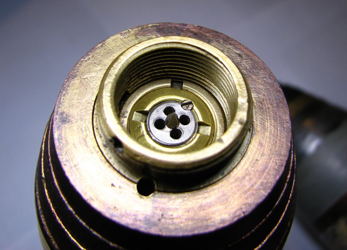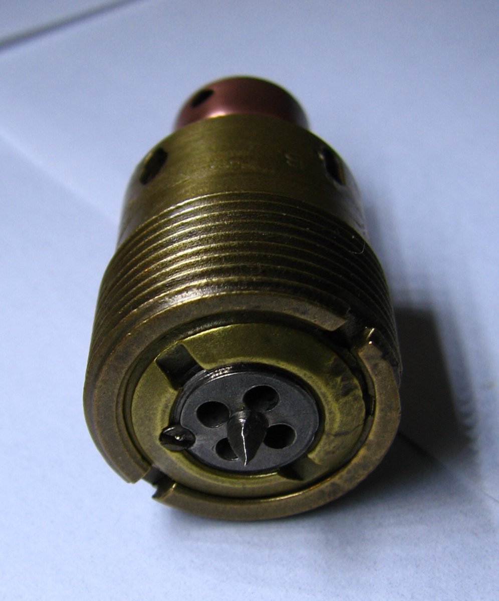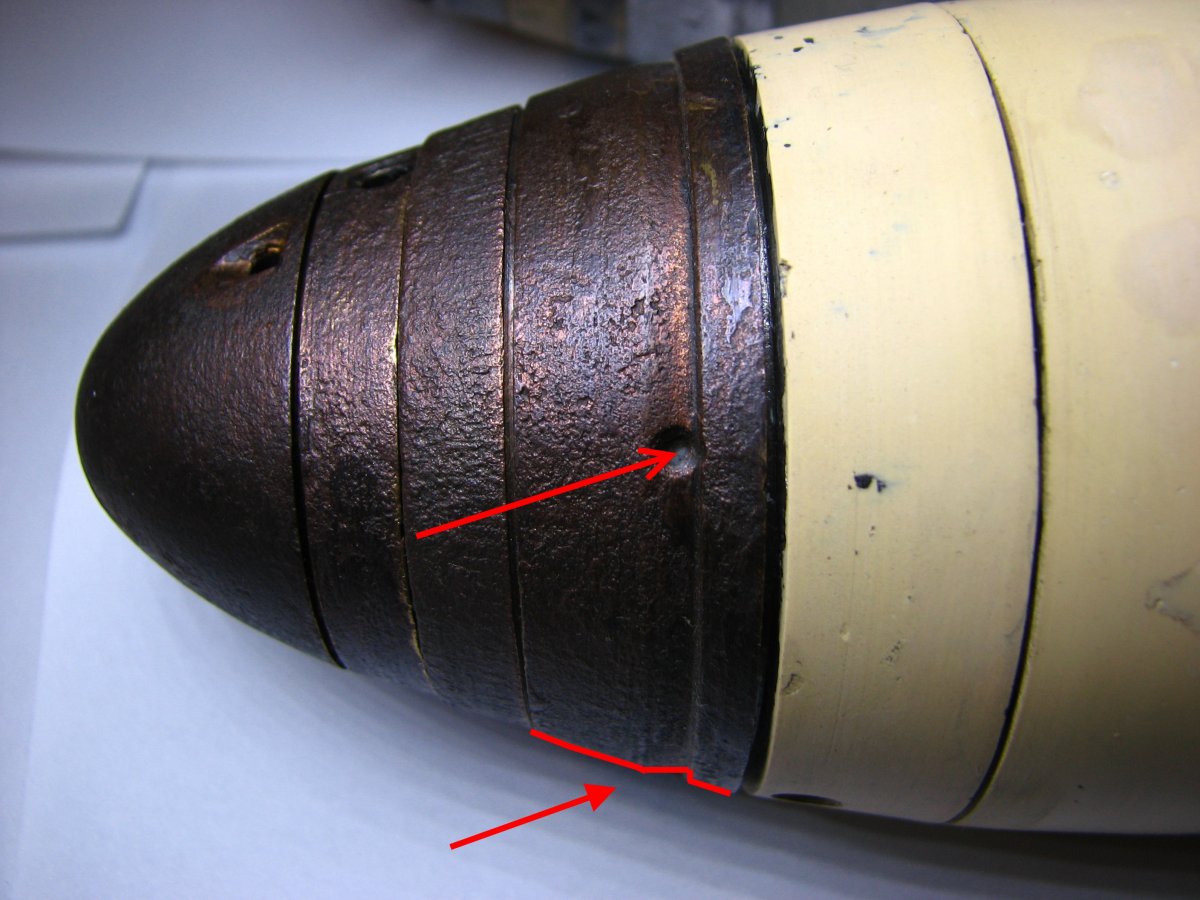 Шановні камради! Дякую за активну участь в обговоренні, проте конкретної відповіді на своє запитання я не отримав. Додаю ще декілька фото голови снаряда. Залишки дистанційної трубки латунні, немає ніяких клейм та шкали ( роздивився під лупою ) Вага снаряда в такому вигляді 5900 гр. Можливо це допоможе в ідентифікації. Дякую!