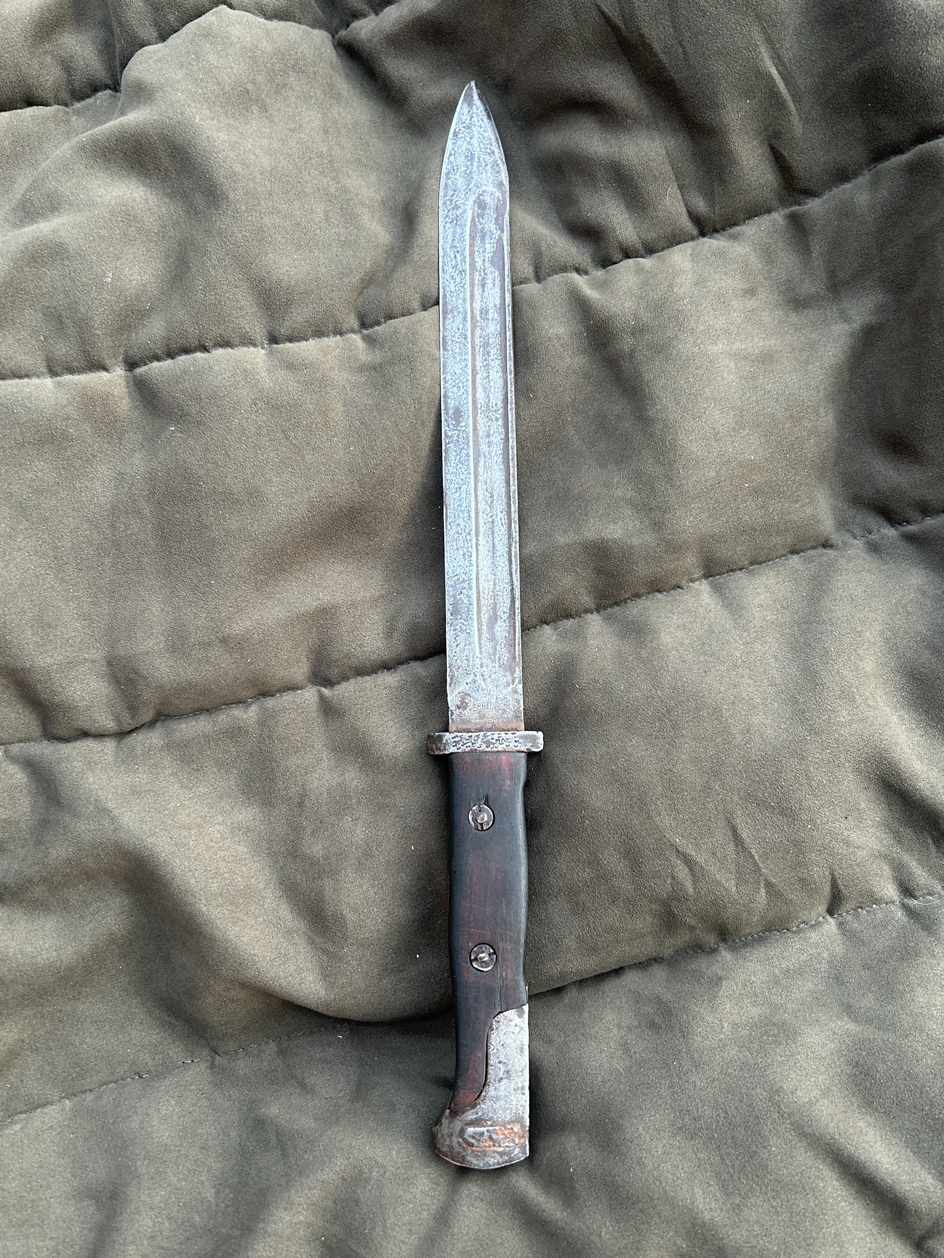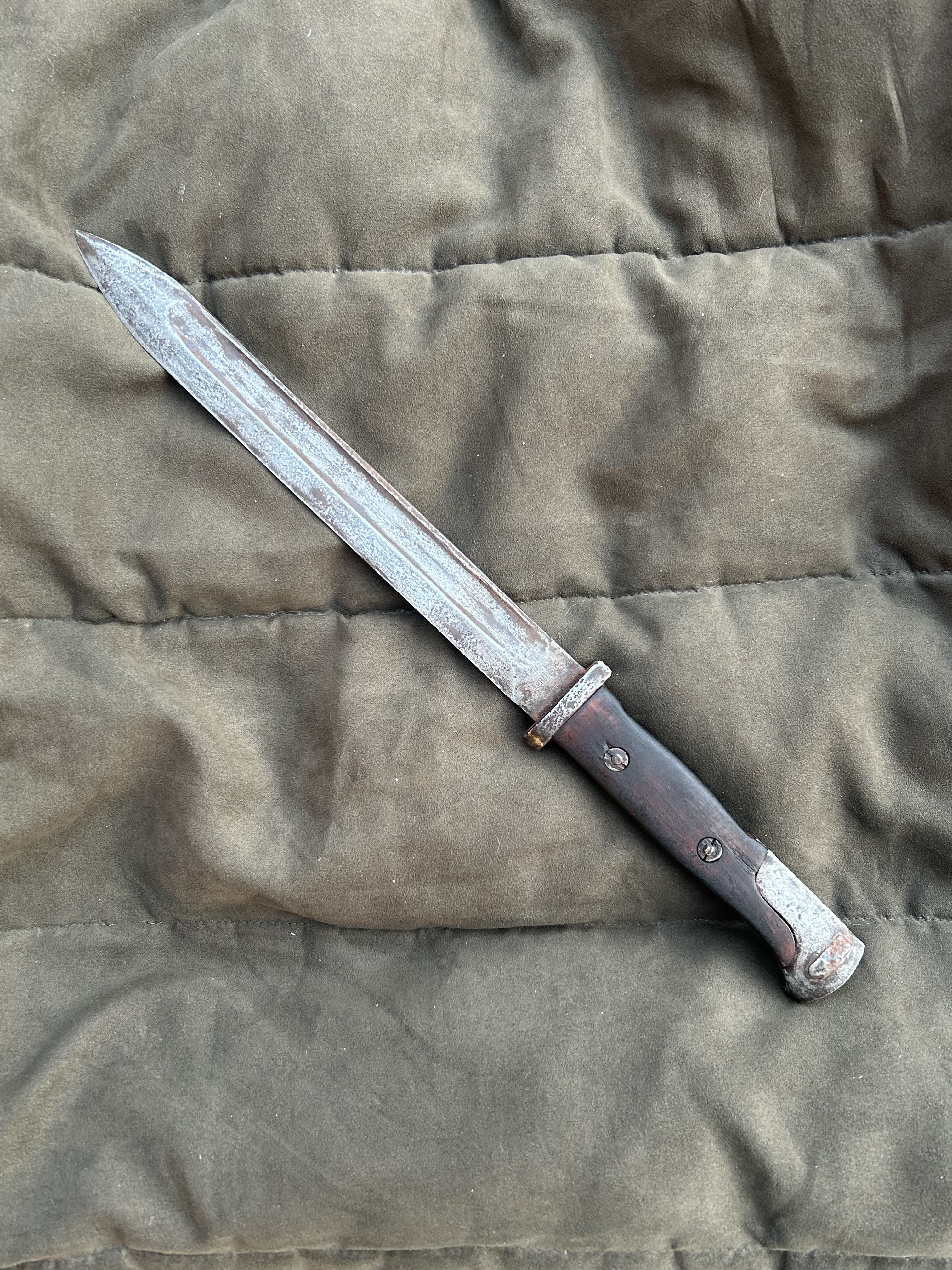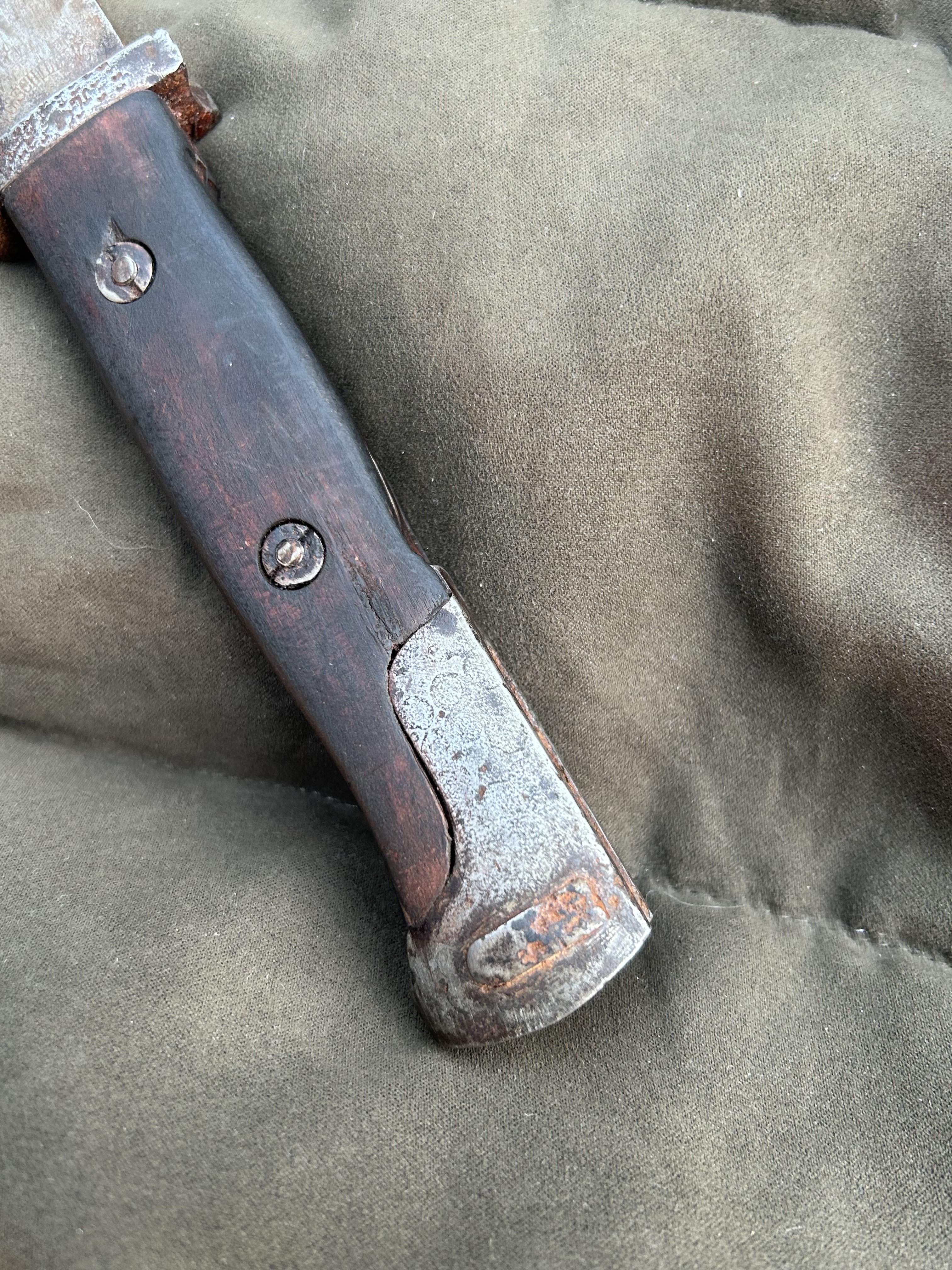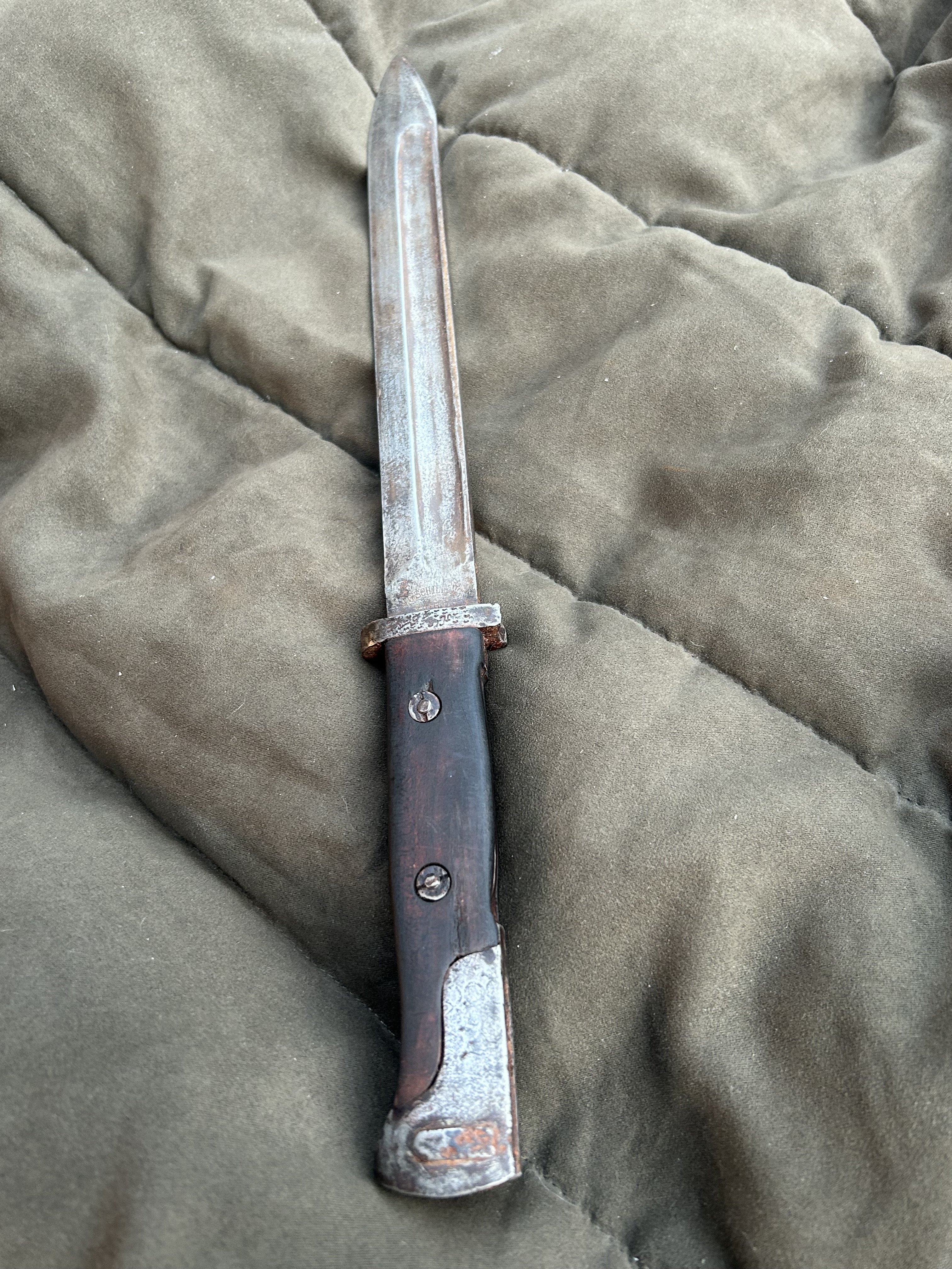 Вітаю! Маю намір продати такий штик. Стан на фото, накладки не оригінал,кнопка не розрухана. Мені попав в такому вигляді, я тільки накладки морілкою пропитав. не став шліфувати все в ідеал, мене влаштував в такому вигляді. Скільки може коштувати в нинішніх реаліях?