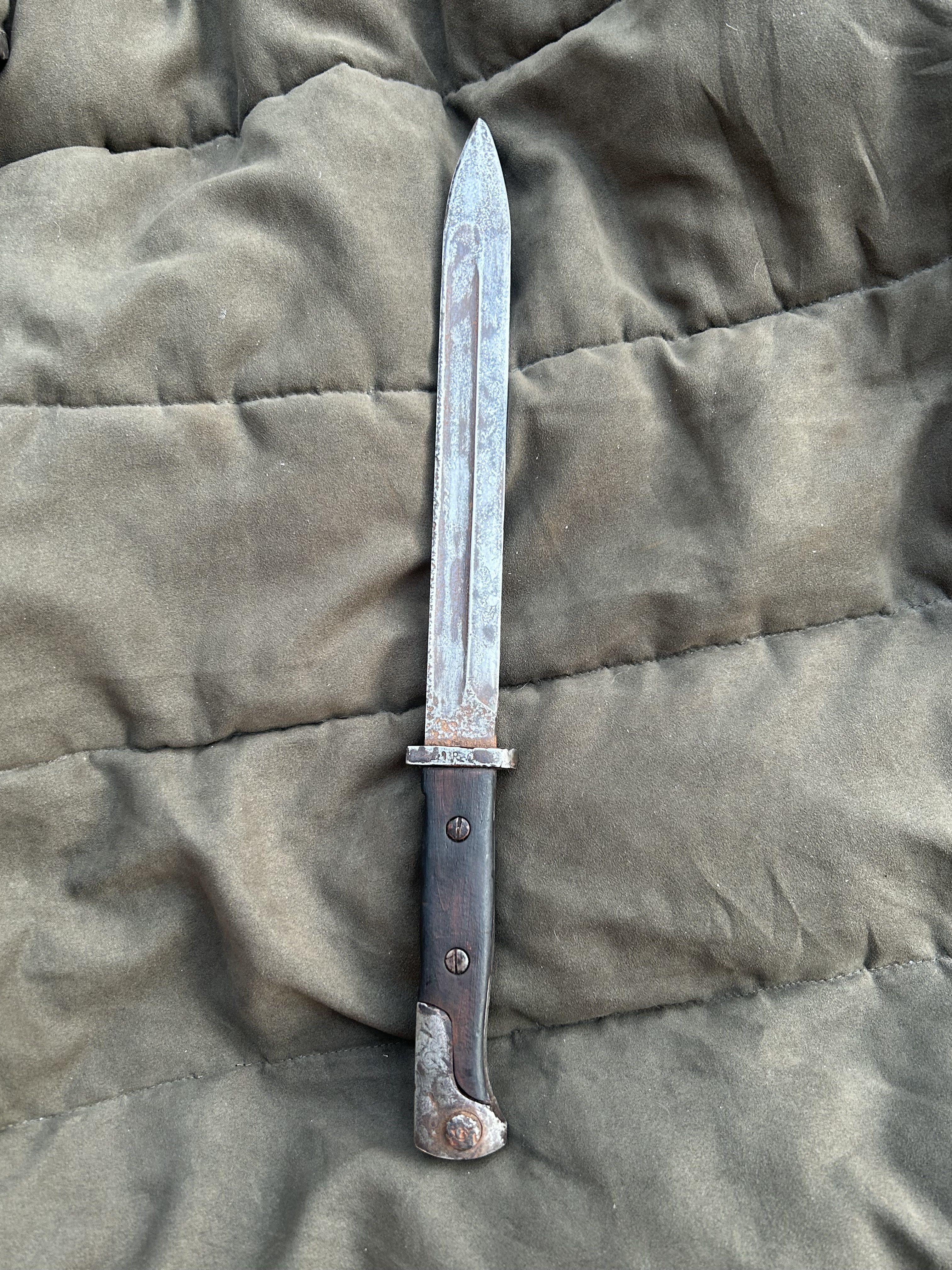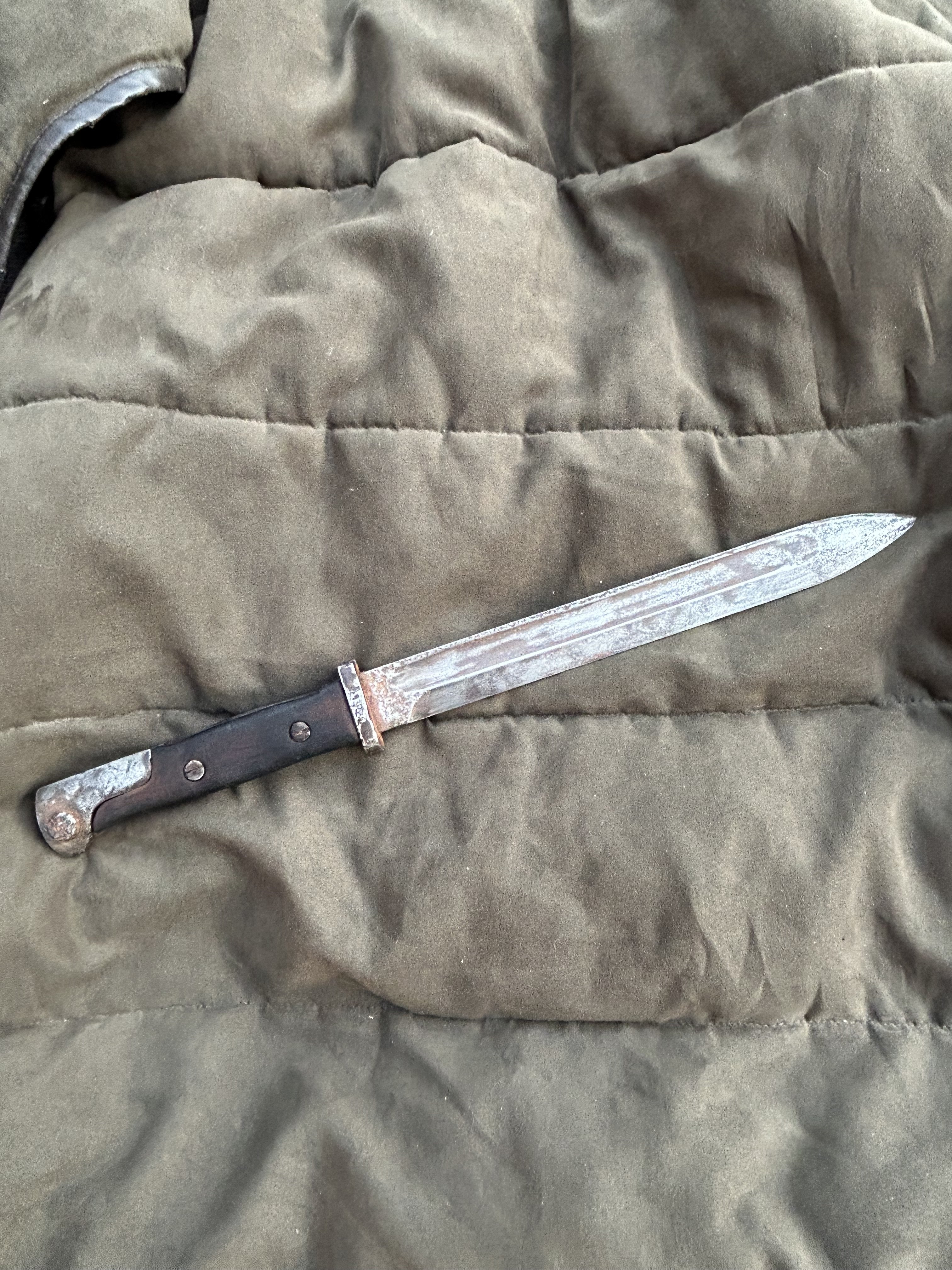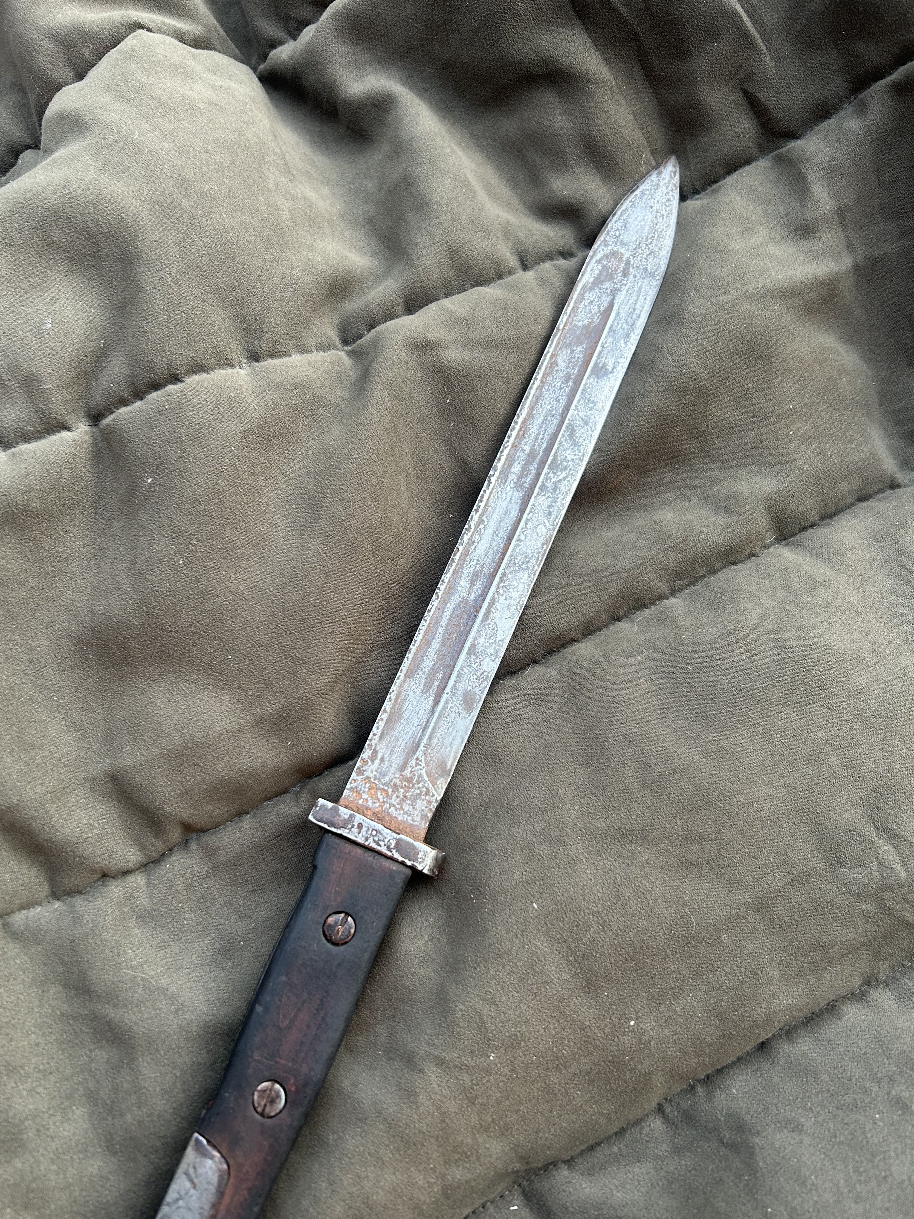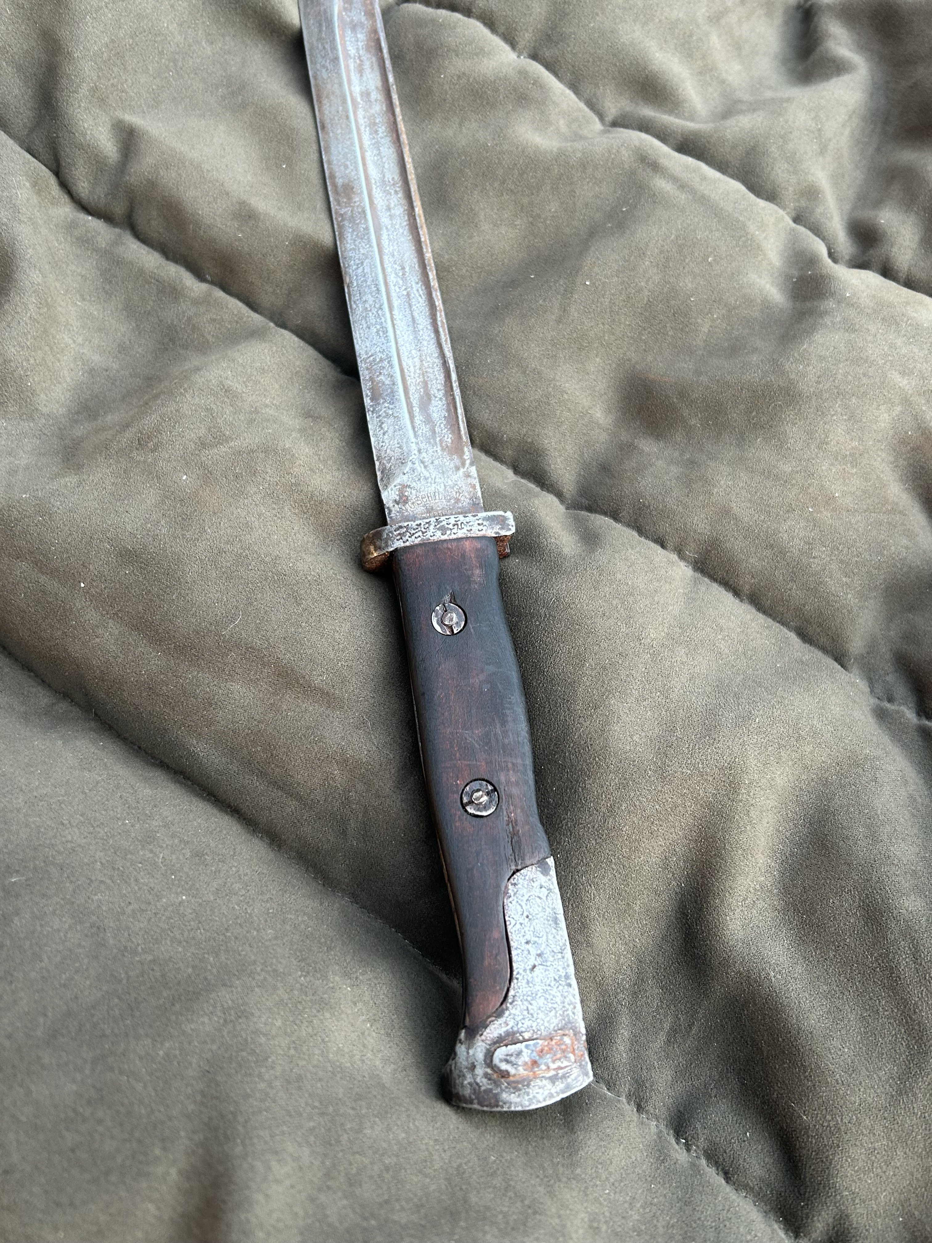 Вітаю! Маю намір продати такий штик. Стан на фото, накладки не оригінал,кнопка не розрухана. Мені попав в такому вигляді, я тільки накладки морілкою пропитав. не став шліфувати все в ідеал, мене влаштував в такому вигляді. Скільки може коштувати в нинішніх реаліях?