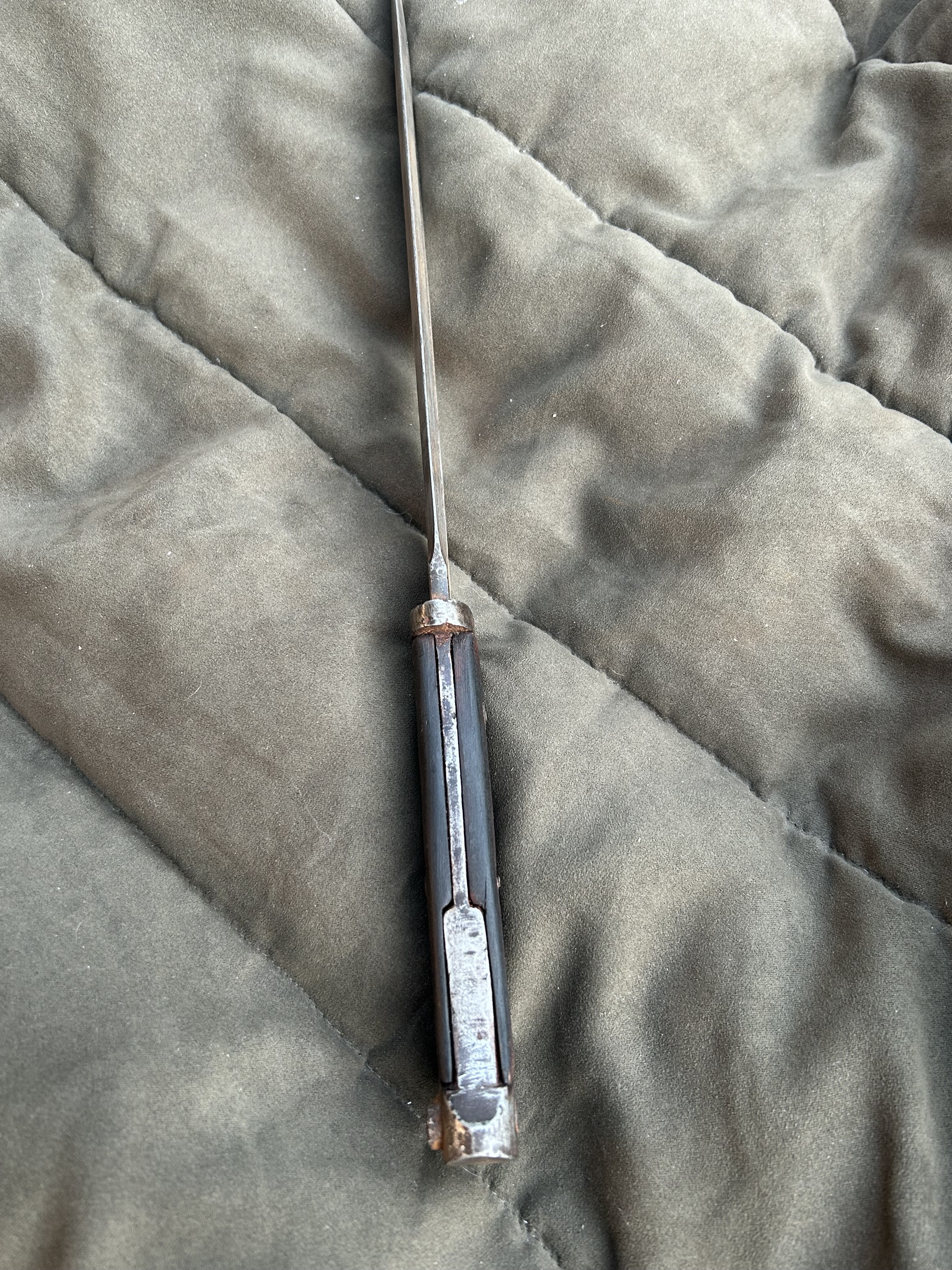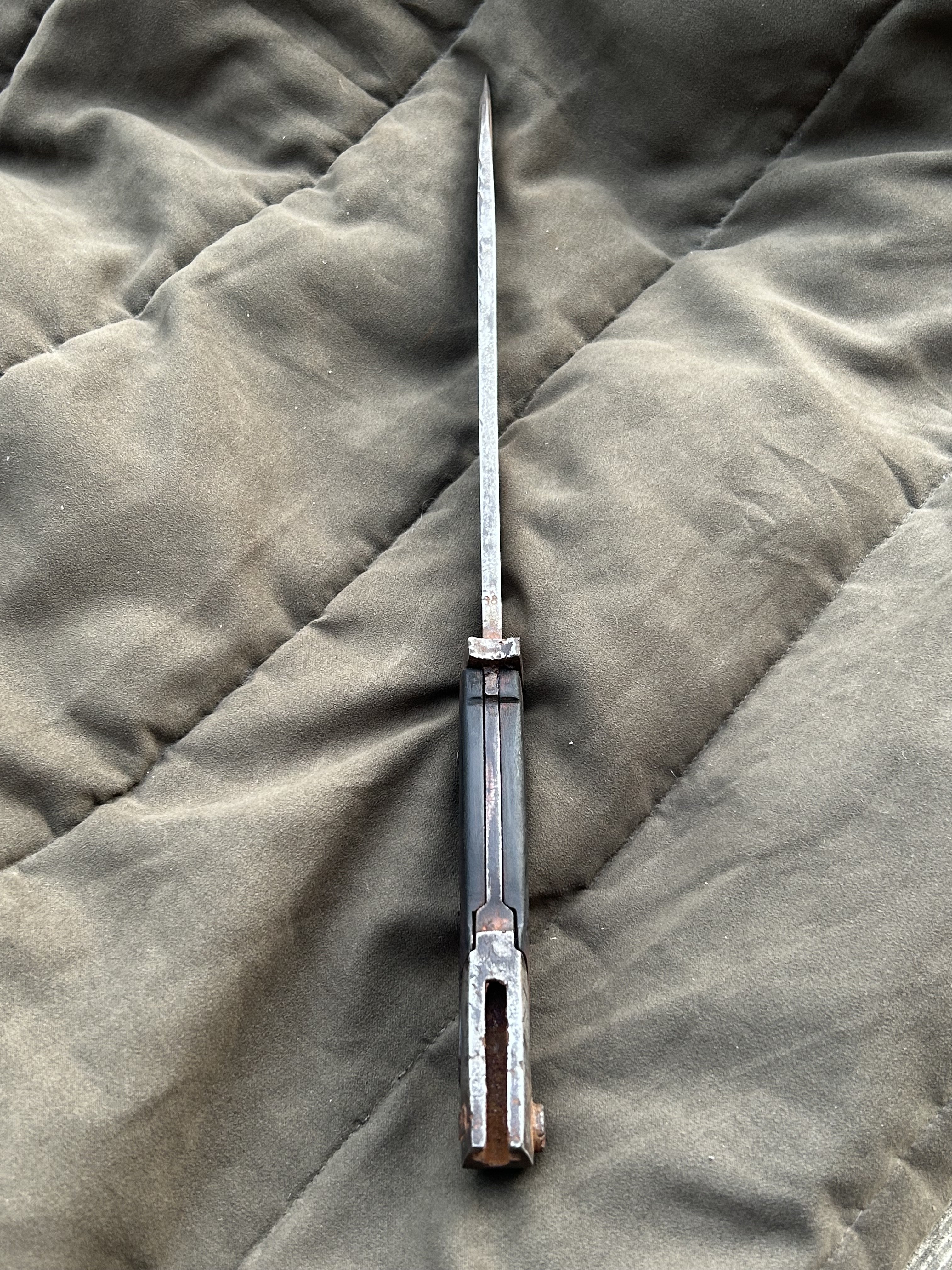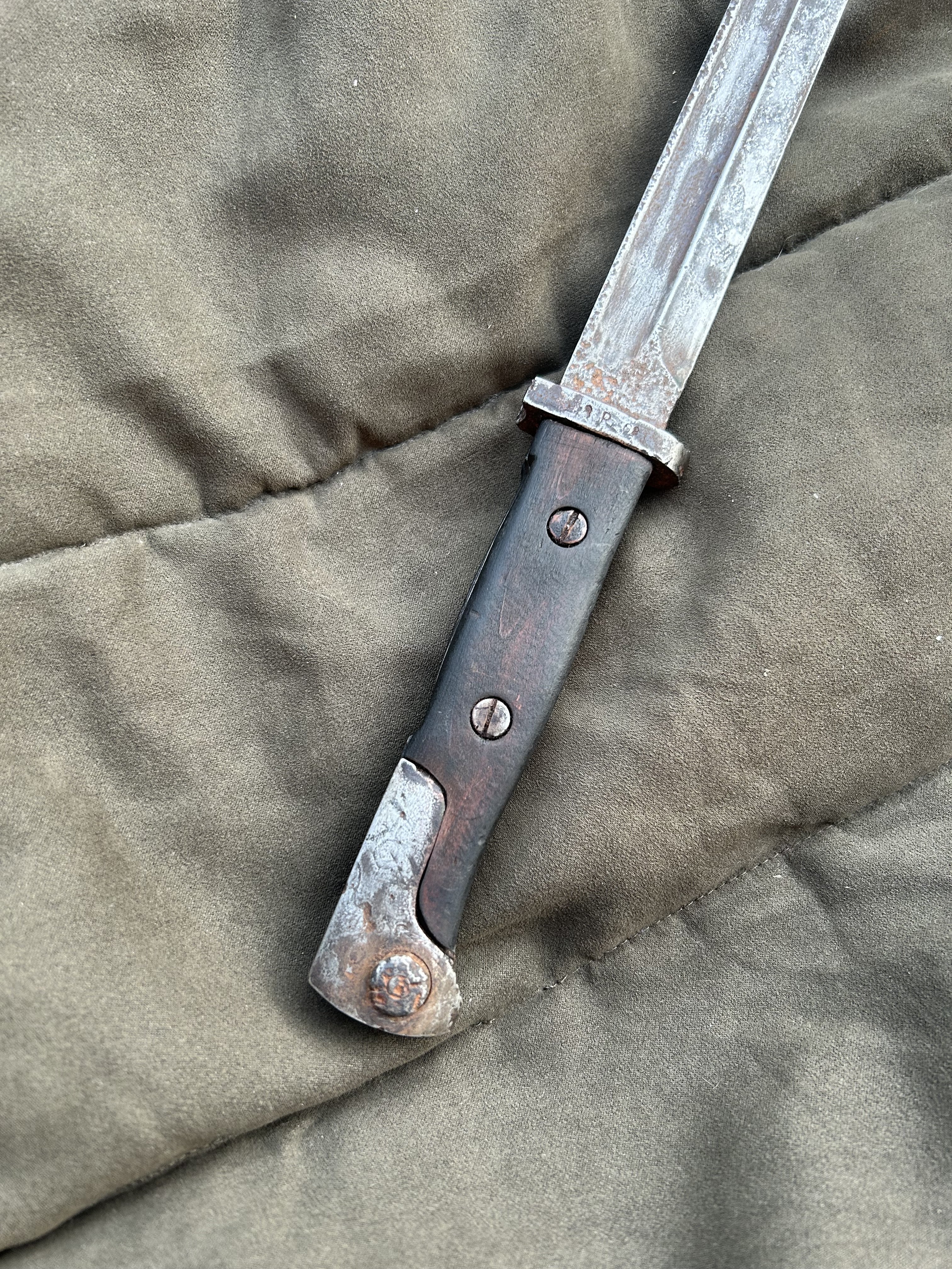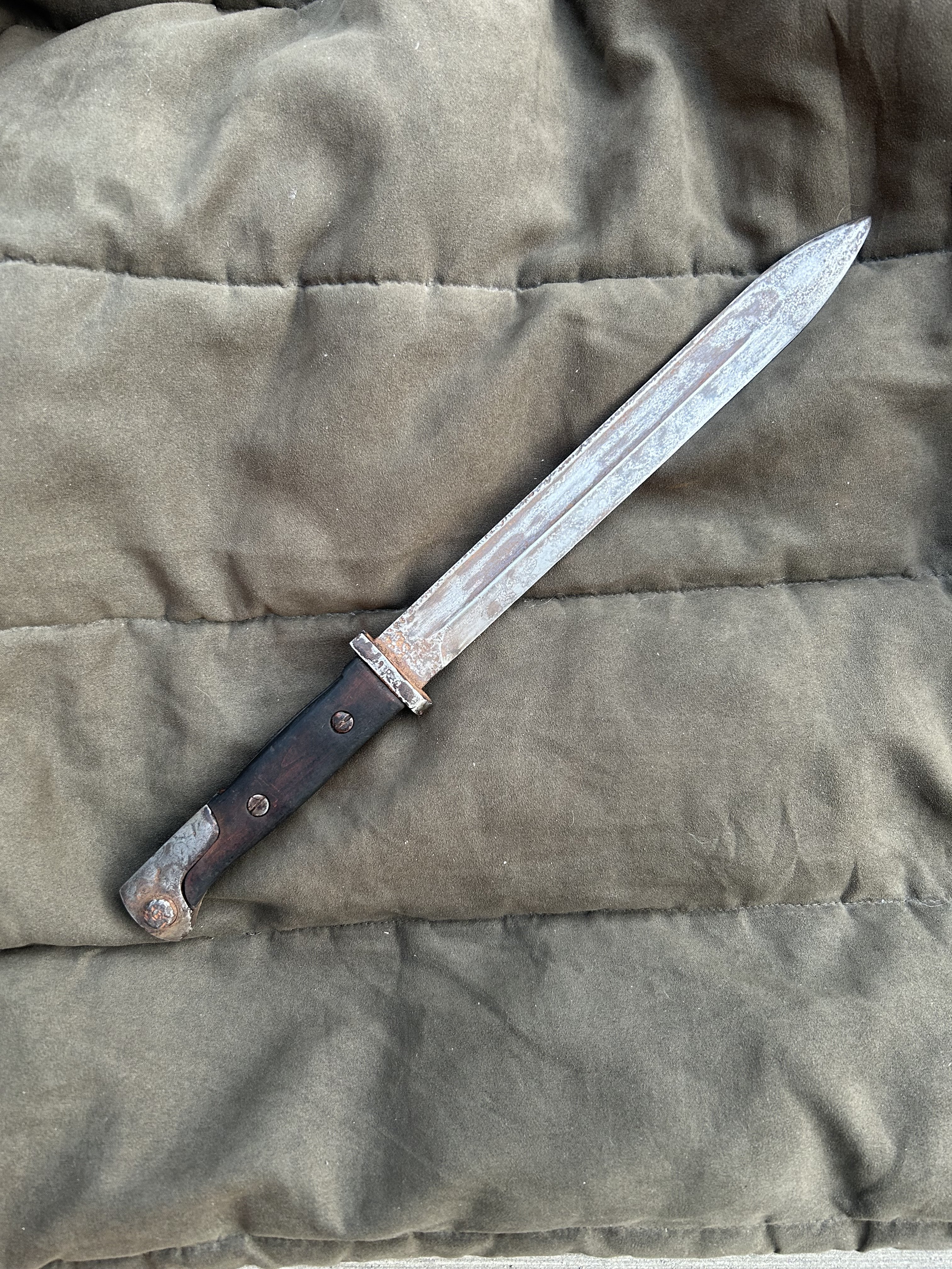 Вітаю! Маю намір продати такий штик. Стан на фото, накладки не оригінал,кнопка не розрухана. Мені попав в такому вигляді, я тільки накладки морілкою пропитав. не став шліфувати все в ідеал, мене влаштував в такому вигляді. Скільки може коштувати в нинішніх реаліях?